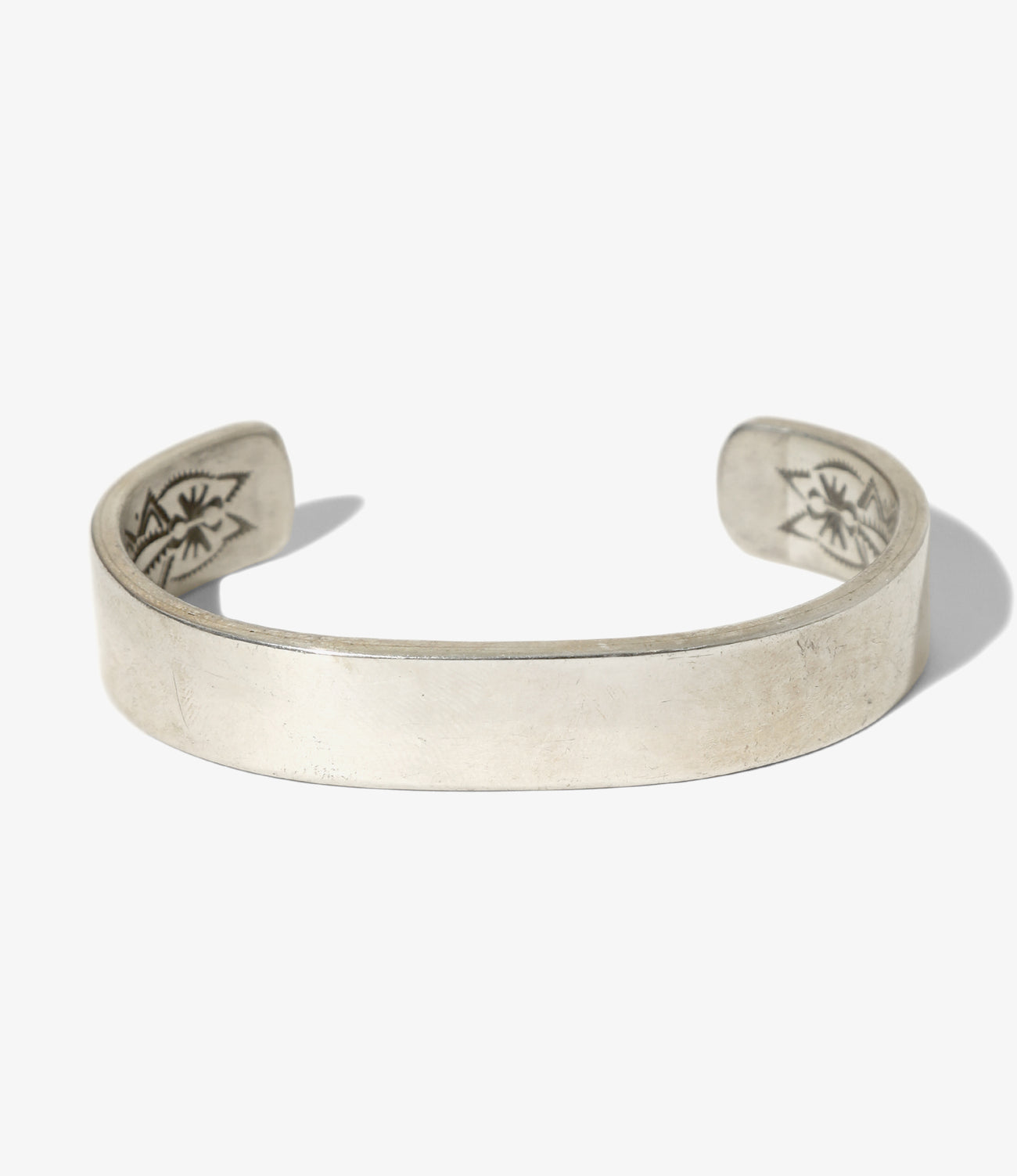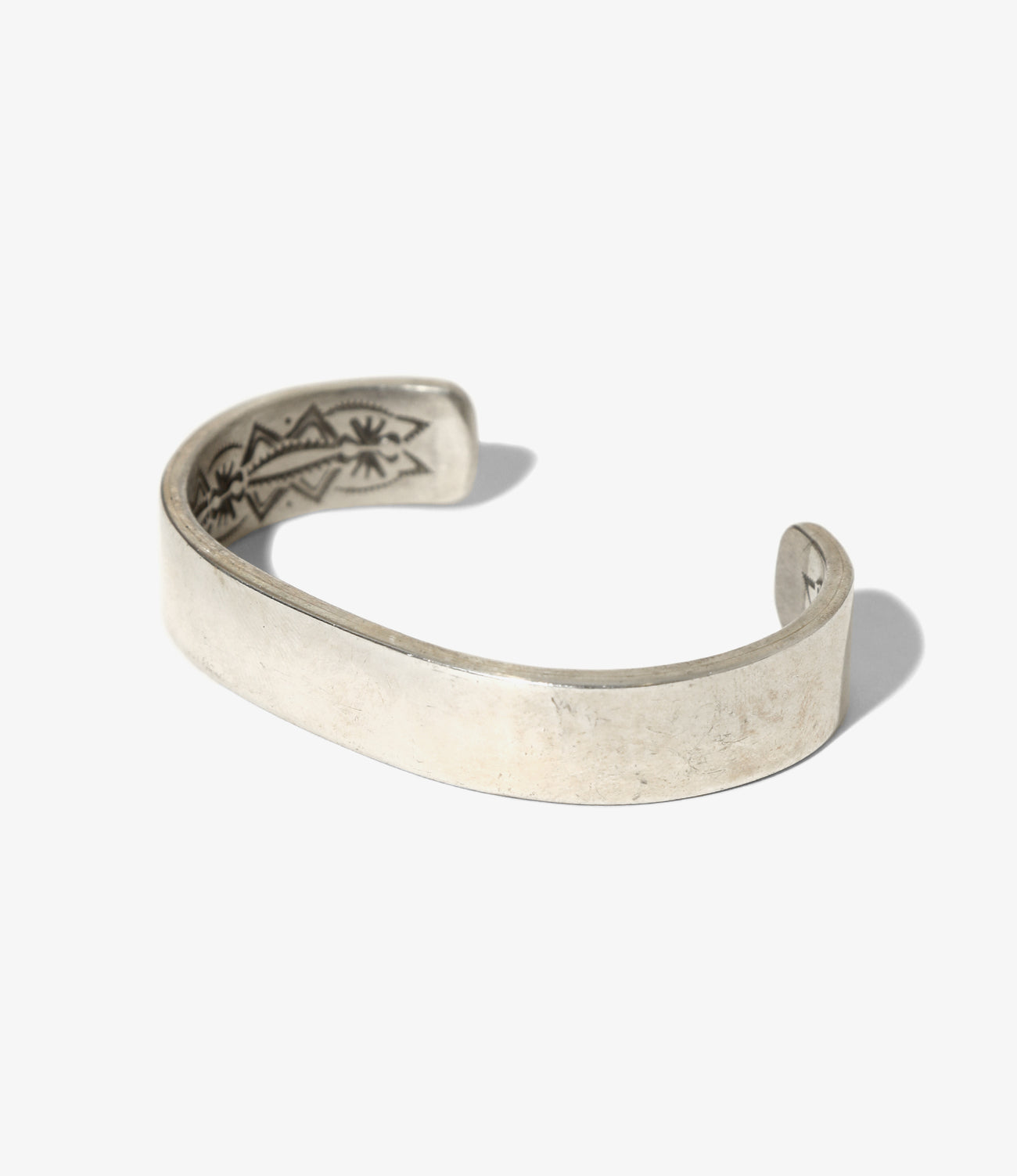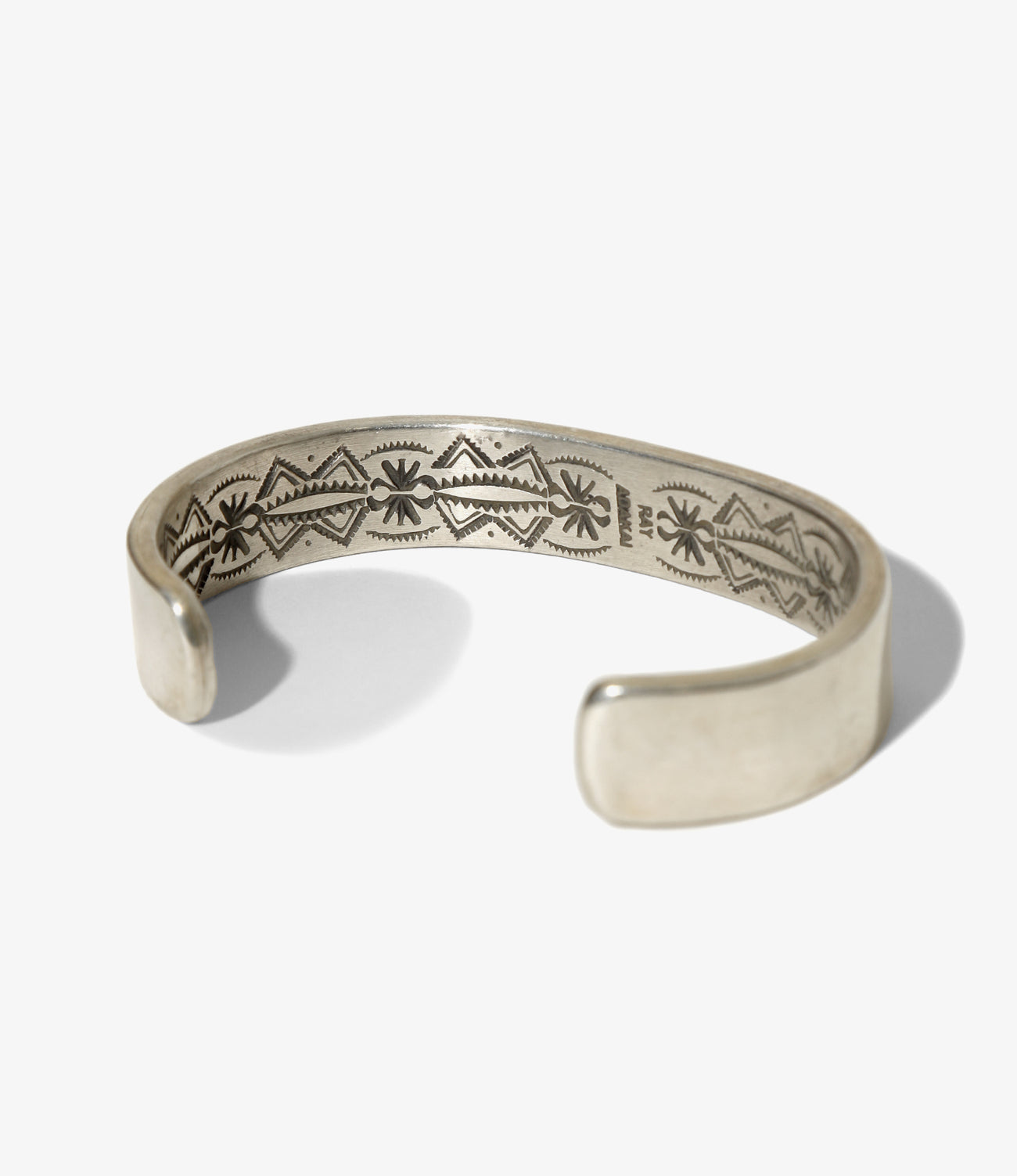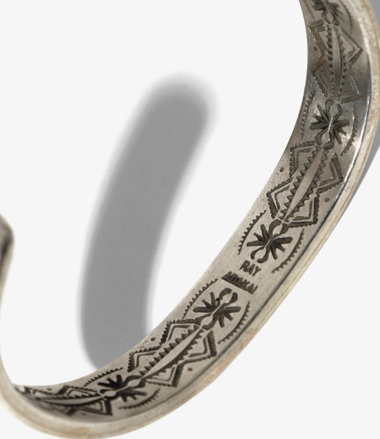 ナヴァホのアーティストRAY ADAKAIに制作を依頼したバングルです。肉厚なシルバーを使用し、表面はあえてプレーンなデザイン、内側のみに力強く立体感のあるスタンプを施した独創的なデザイン。シルバーをふんだんに使用し、重厚感のあるラグジュアリーな表情に仕上がっています。1/2インチ(約1.3cm)とオーソドックスな幅で、適度な存在感と使いやすさを兼ね備えた一本です。