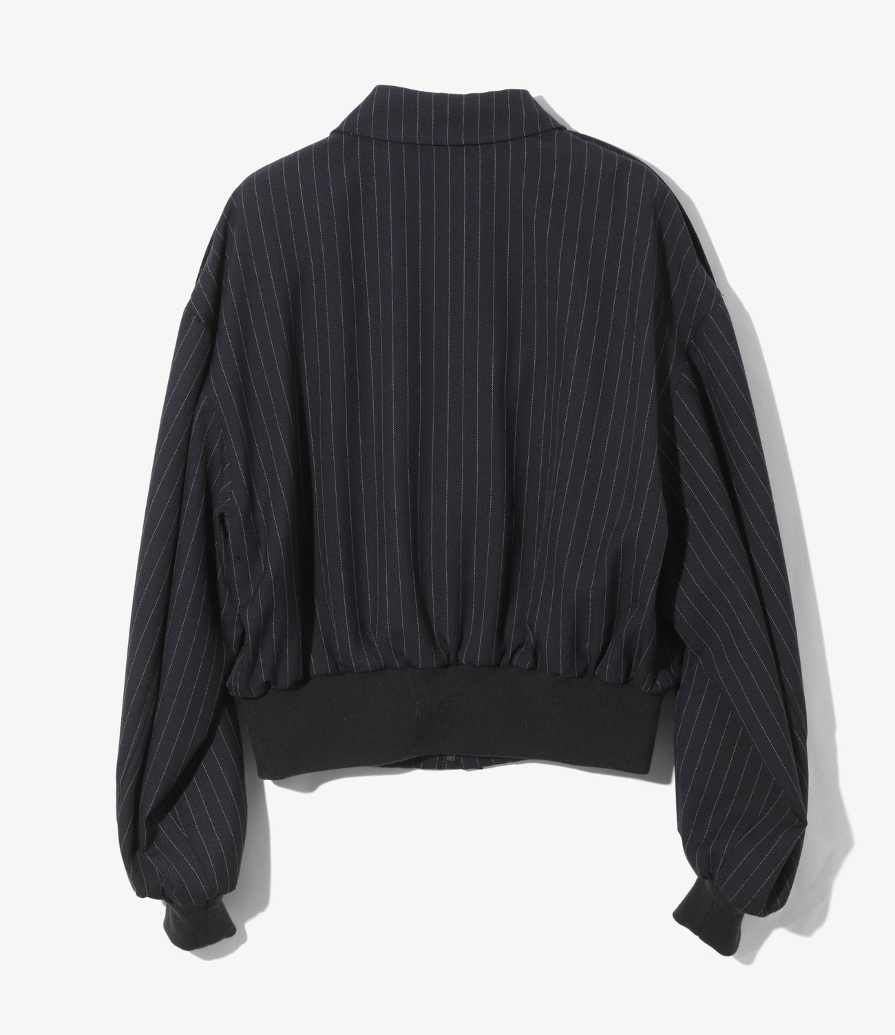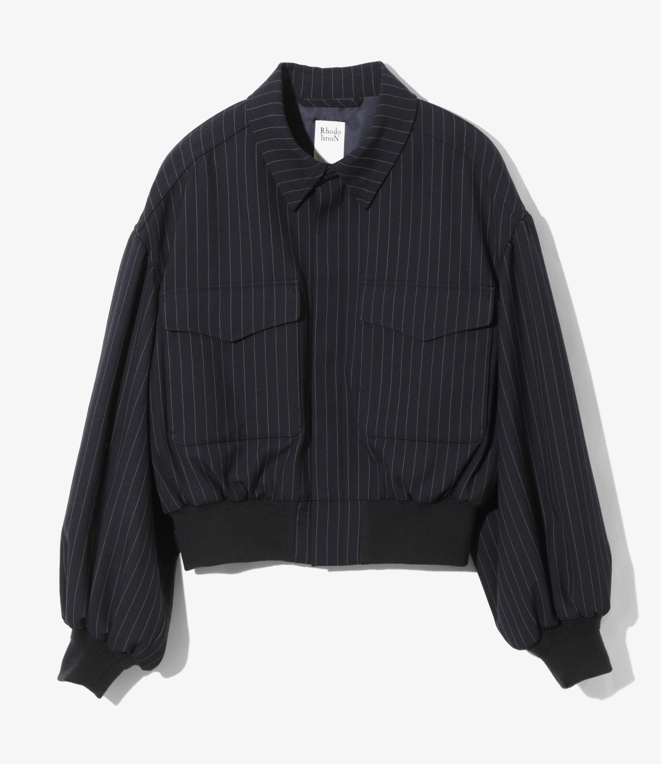 前比翼ファスナージップでの開閉、両脇のドットボタン式のフラップがついたポケット、シャツスタイルのスナップダウン形式の襟、肩章、ゴム編みの袖口とウエストなど、フライトジャケットの代名詞敵存在でもあるType A-2のディテールを搭載しつつ、<RHODOLIRION>のフィルターを通してモデファイしました。大きく落ちる肩にギャザーたっぷりのバルーン袖がつくことでレディーの顔へ昇華。素材はリサイクルポリエステル×ノンミュールウールの糸を使用した環境にやさしい素材。適度な肉感とハリ感があるのでふっくらとしたシルエットが表現されます。