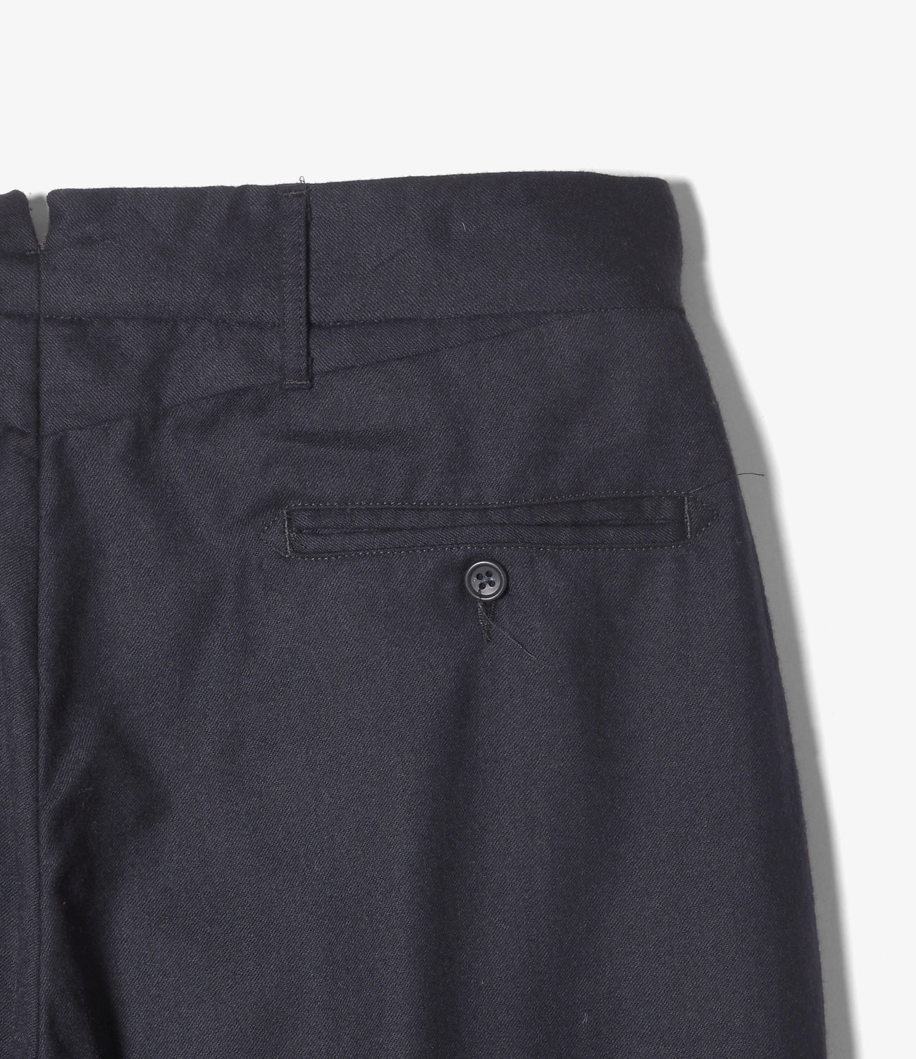 〈ENGINEERED GARMENTS〉のパンツのラインナップでも、最もシンプルでベーシックなデザインのアンドーバーパンツ。クラシカルなトラウザーズのスタイルを踏襲した定番の一本です。ゆったりとした腰回りからテーパードの効いたシルエットが特徴的で、裾はダブルの仕上げが施されています。非常に滑らかで光沢感があるハイカウントウーステッドウールは、よりスタイリッシュで洗練された印象です。