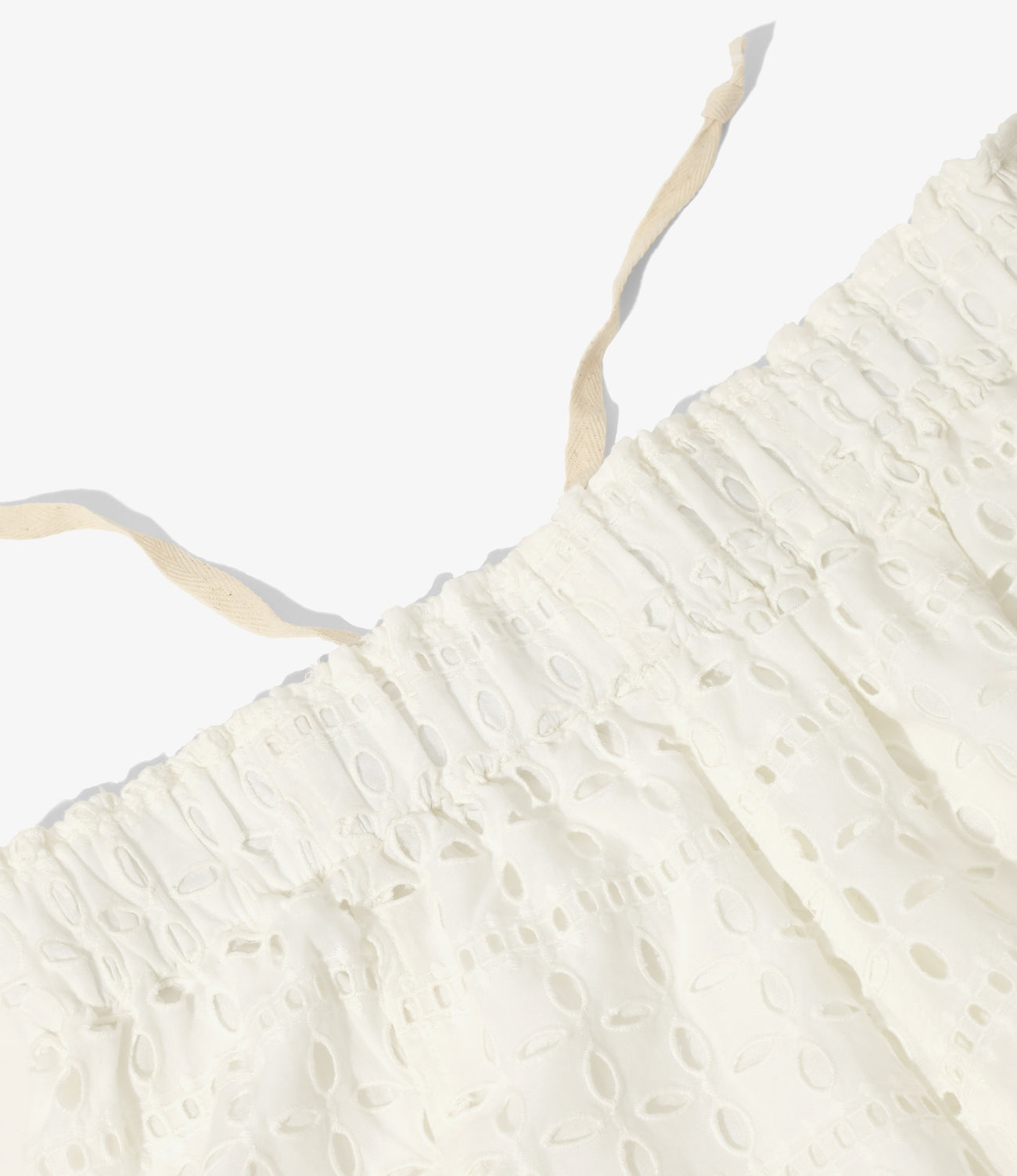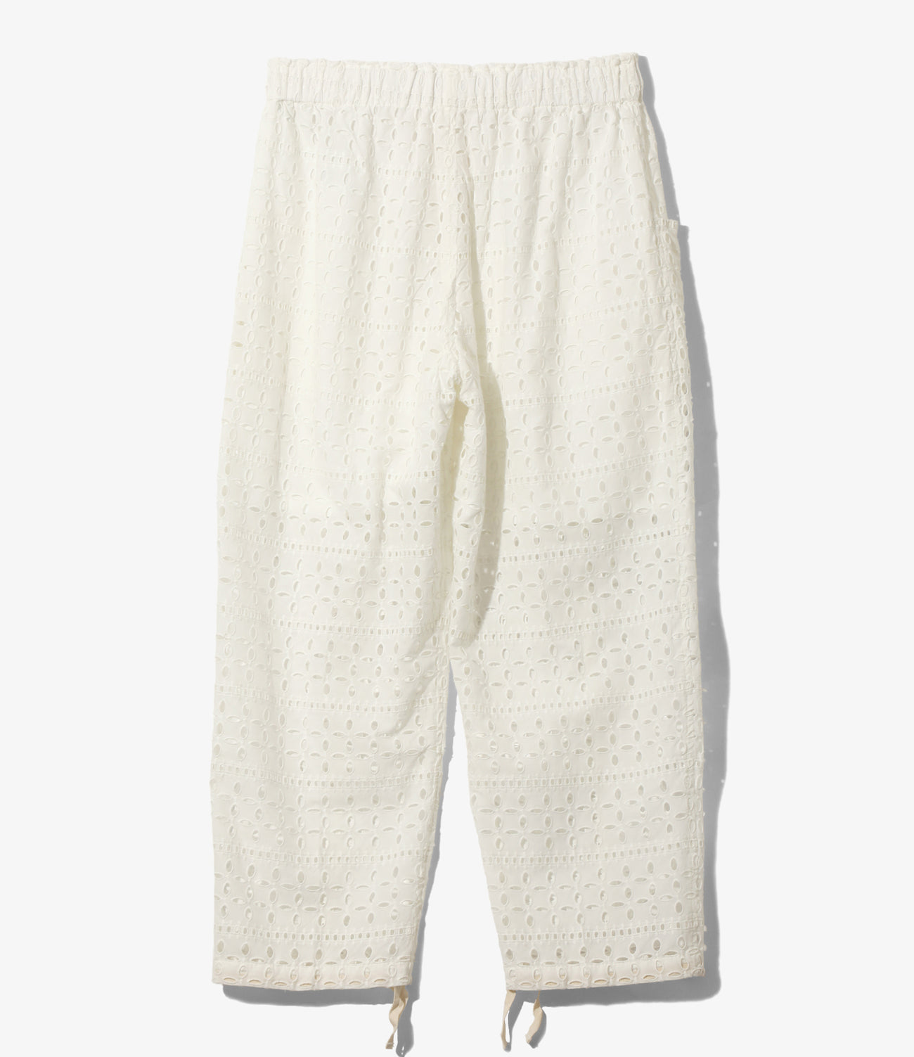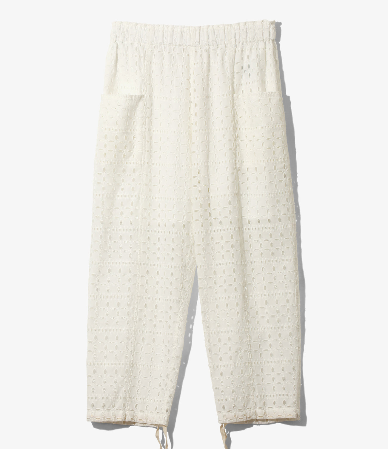 ゆとりのあるワイドテーパードのシルエットと、ユニークな縦長の形状のサイドポケット、リラックス感のあるストリングウエストなど、特徴的なディテールが光る定番型のイージーパンツ。繊細で立体的なインド製のカットワーク生地を使用。通気性がよく、透け感を活かしたユニークなスタイリングもお楽しみ頂けます。同シリーズのシャツとのセットアップもおすすめです。