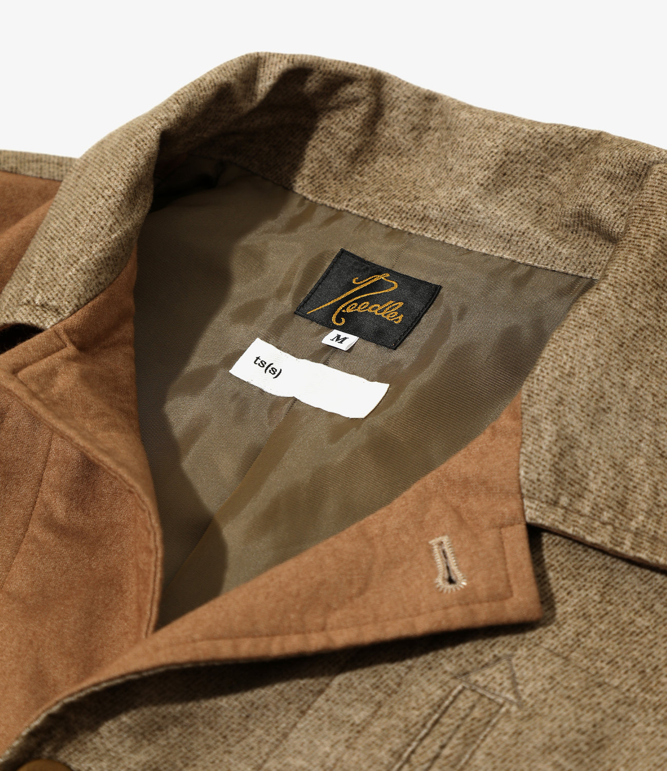 今シーズンのコラボレーションのベースとなったのは、〈NEEDLES〉のブランド初期より展開されてきた定番ジャケットのひとつARROW JACKET。カバーオールのようなゆとりのあるAラインシルエットと、テーラードジャケットのような品の良さを兼ね備えたデザインが最大の特徴です。リラックス感のあるシルエットに対し、フロントの斜めにセットされた3つのポケットがシャープな印象を与え、アロー(矢印)型のカンヌキステッチも個性を放つアイテムとなっています。