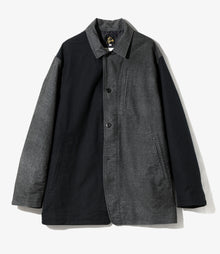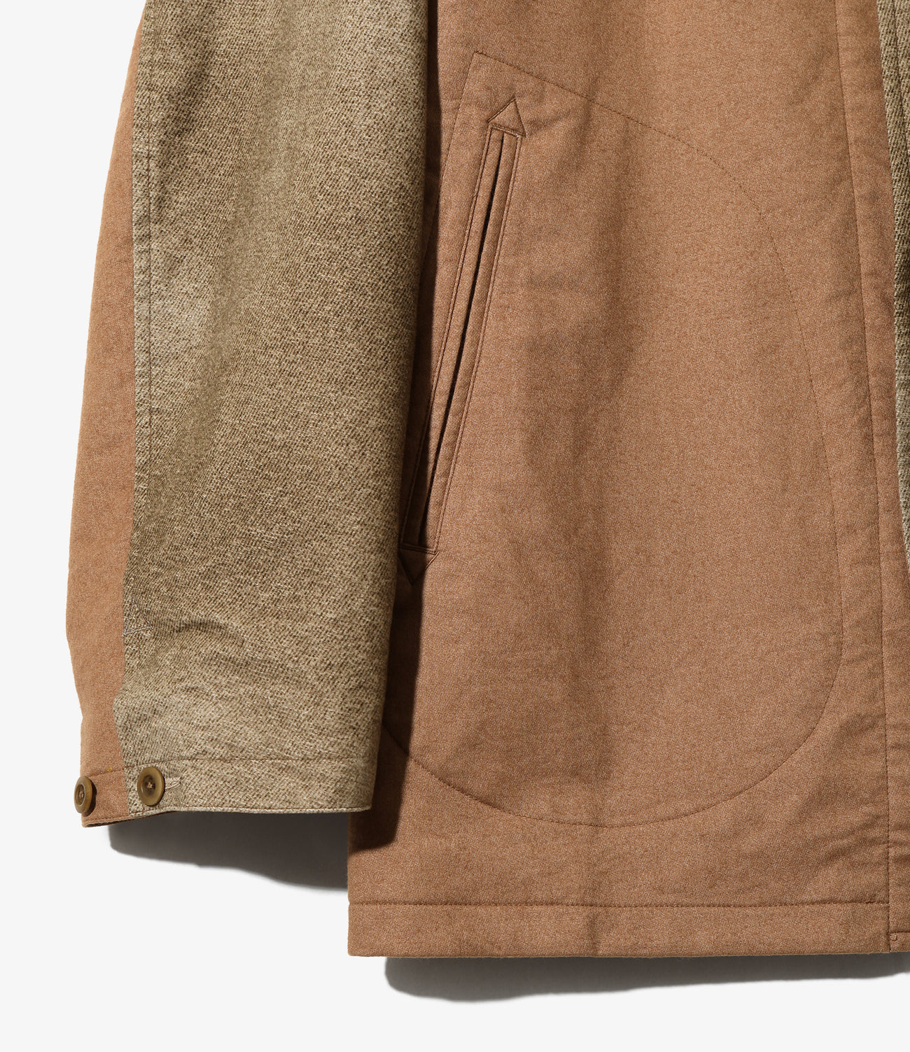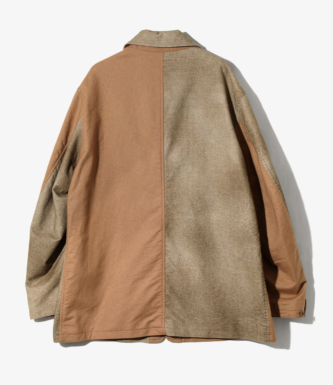 今回のコラボレーションではTS(S)のコレクションからこだわりのファブリックをセレクトし採用。片面はソフトな起毛感のある無地のモールスキン、もう片面はムラ感のある微妙な濃淡をプリントで表現したTS(S)のこだわりの詰まったオリジナルファブリックです。このユニークな素材をパーツによって裏表交互に配置し、クレイジーパターンのアレンジで落とし込んだ一着となっています。