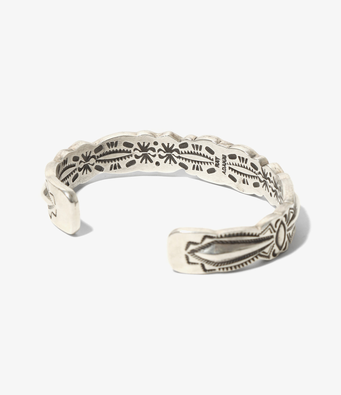 ナヴァホのアーティストRAY ADAKAIによるバングルです。肉厚なシルバーの表裏両面に力強く立体感のあるスタンプを施したRAI ADAKAIの得意とするダブルスタンプと呼ばれるスタイルです。シルバーをふんだんに使用した、重厚感のあるラグジュアリーな表情に仕上がっています。