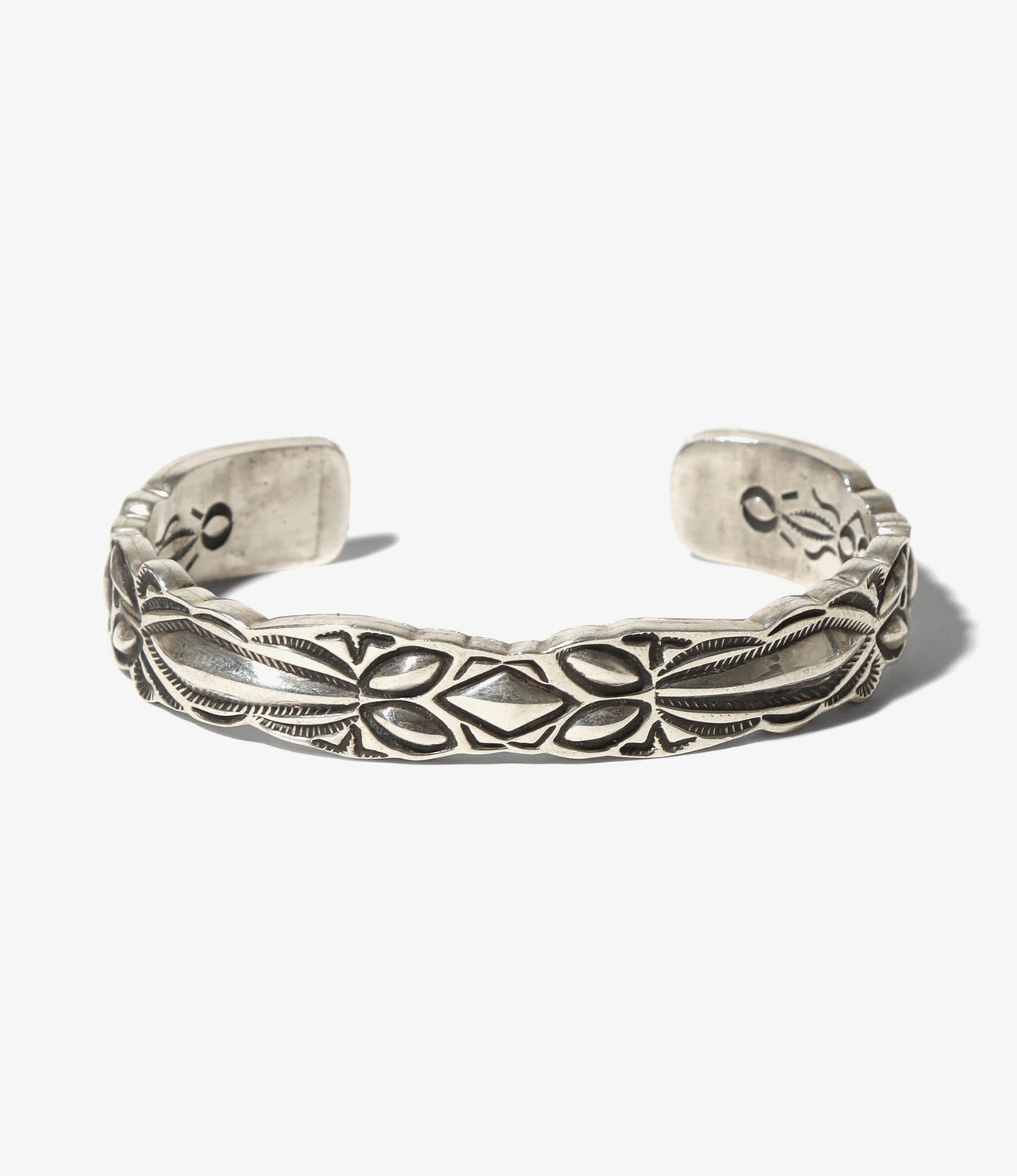 ナヴァホのアーティストRAY ADAKAIによるバングルです。肉厚なシルバーの表裏両面に力強く立体感のあるスタンプを施したRAI ADAKAIの得意とするダブルスタンプと呼ばれるスタイルです。シルバーをふんだんに使用した、重厚感のあるラグジュアリーな表情に仕上がっています。