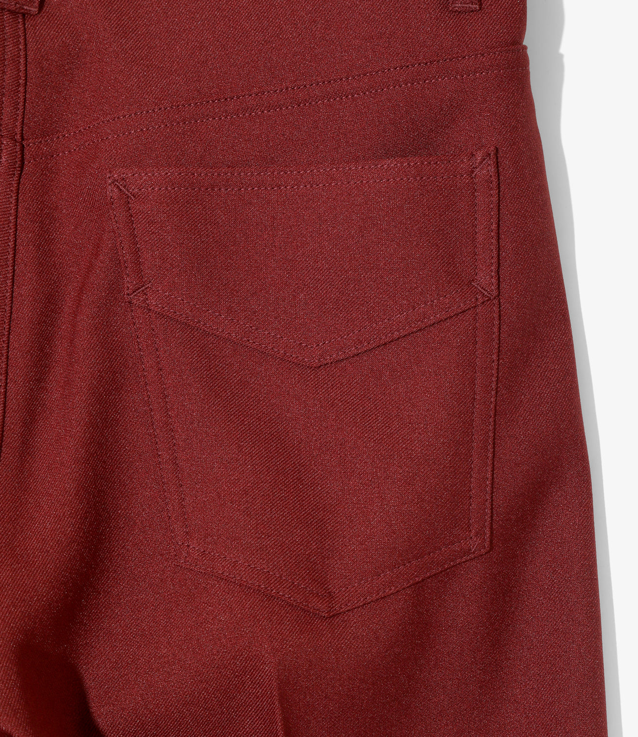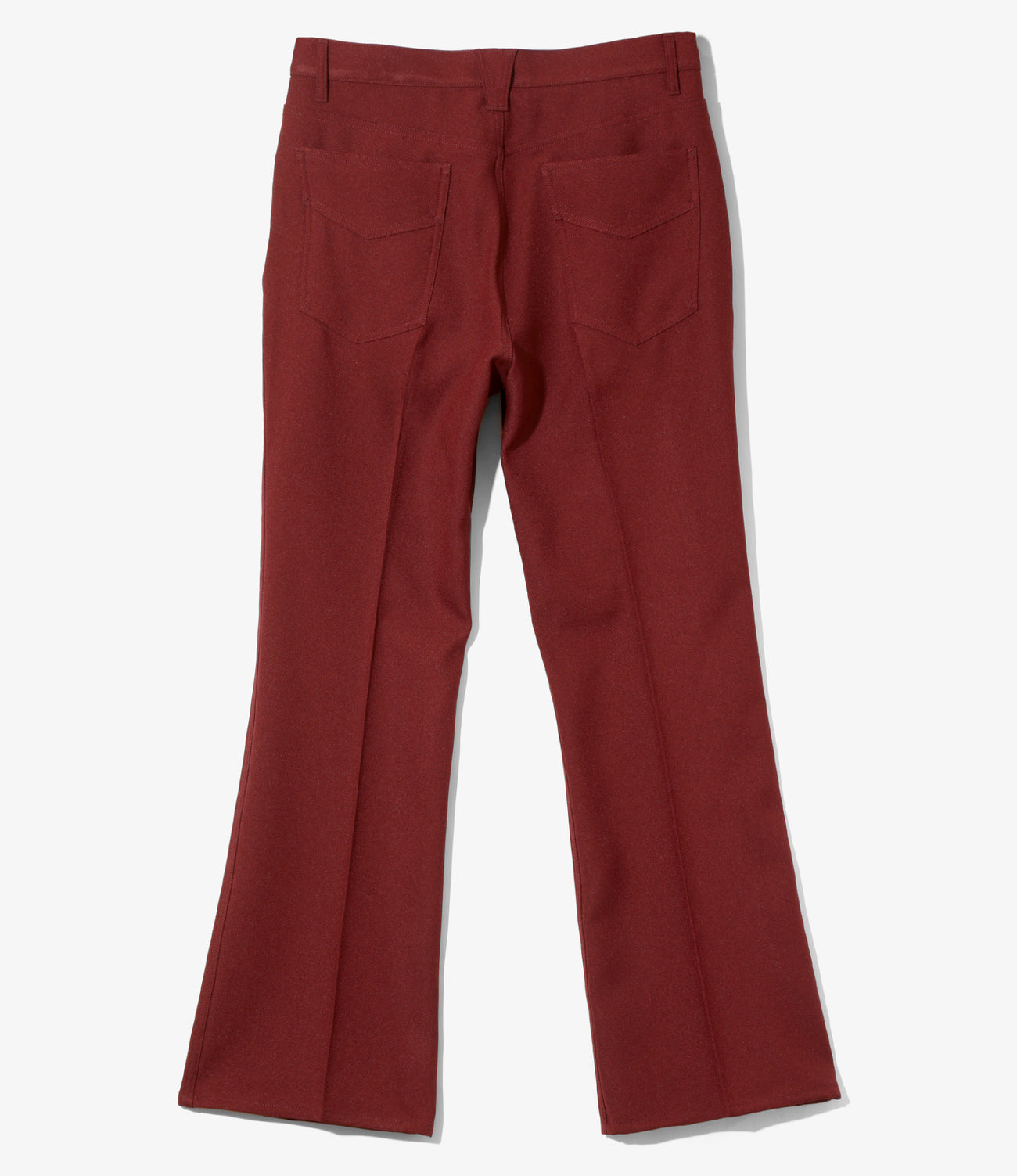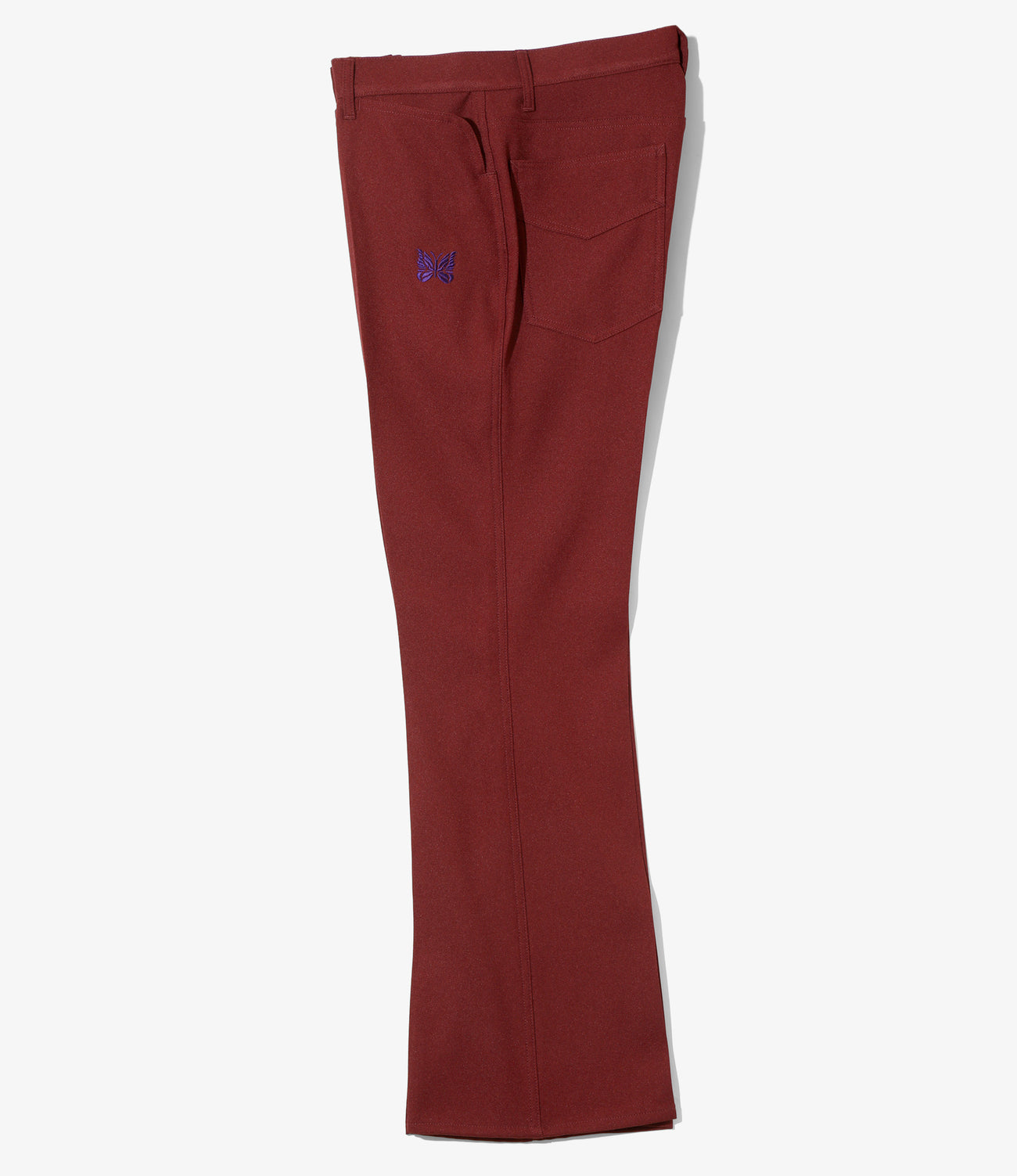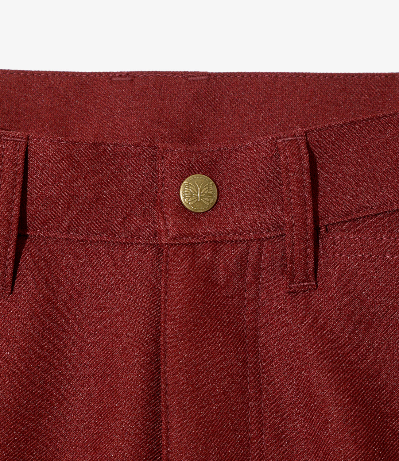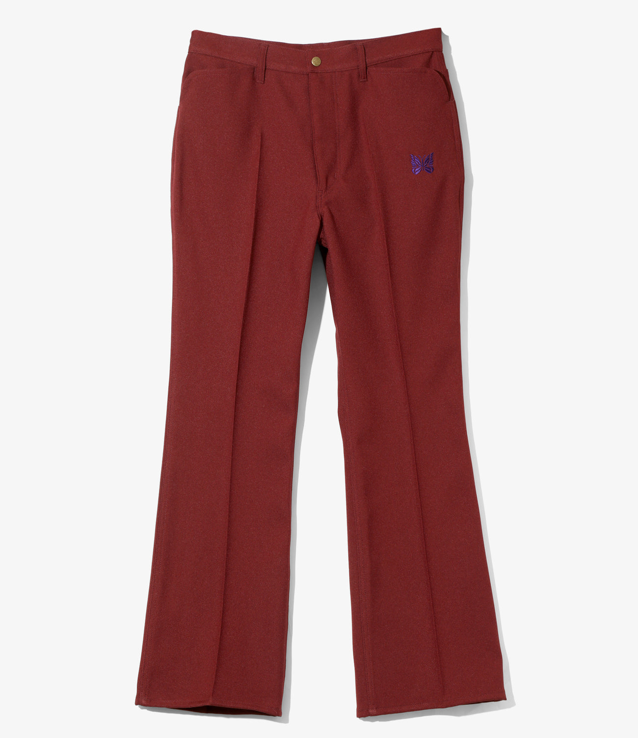 オーセンティックなムード漂うブーツカットパンツ。〈NEEDLES〉では定番としてリリースされているアイテムです。軽く強度に優れたポリエステルツイル素材は、上品な艶感のある独特の発色も特徴的。今季はバーガンディ、トープ、チャコールの3色展開。昨シーズンからストレートシルエットでも展開されています。セットアップで着用可能なジーンジャケットもリリースされています。