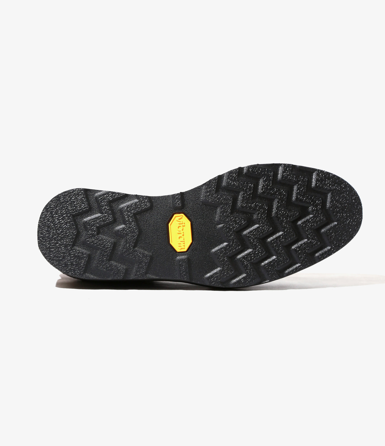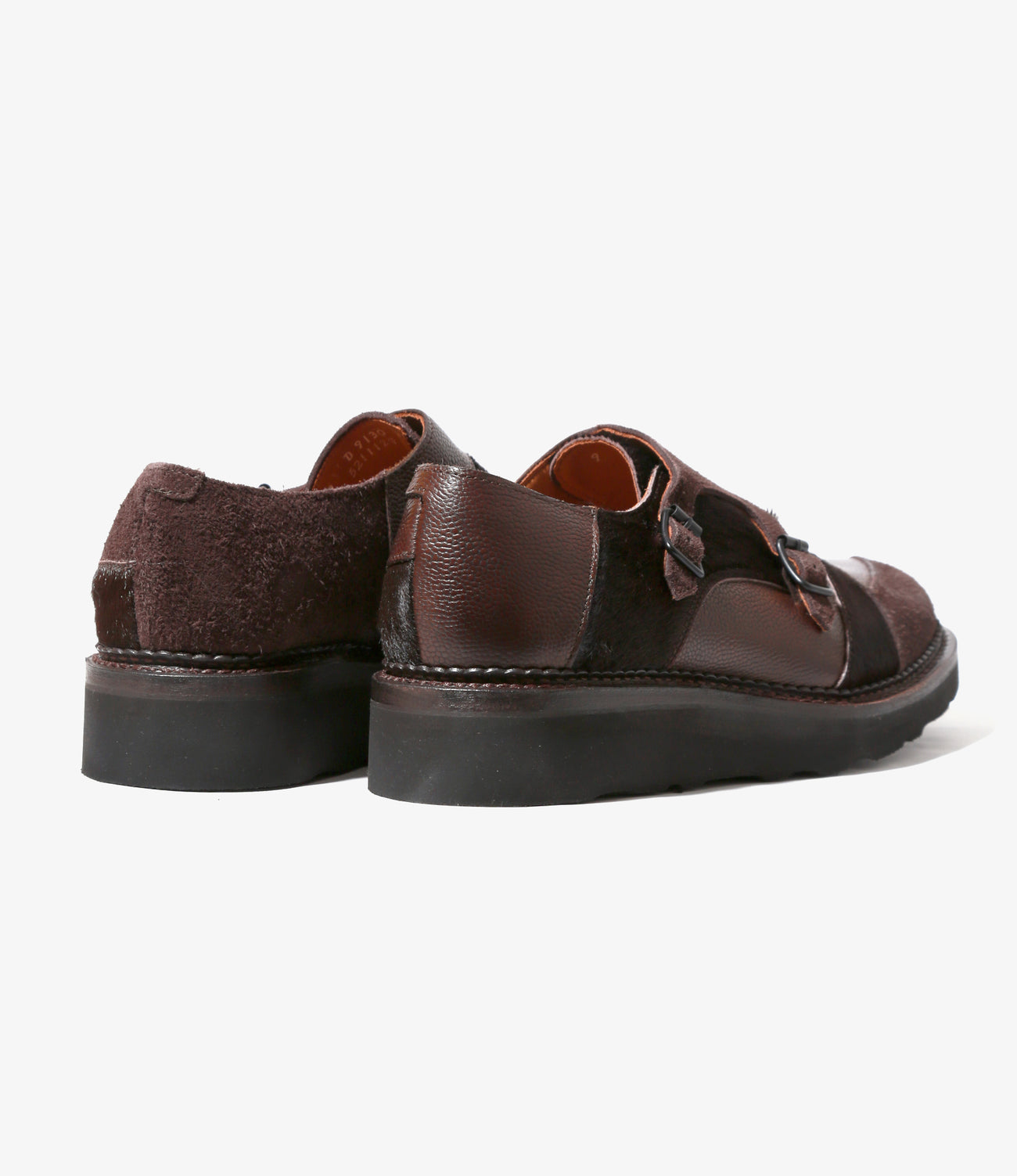 日本のストラップ留めのアッパーとグッドイヤーウェルトによる厚みのあるフォルムが特徴的なダブルモンクストラップ。カーフヘア、スコッチグレイン、起毛感のあるスエードと3種類の素材をパッチワークのように使用したユニークなアッパーデザインが目を引きます。素材の繋ぎ目のパターンは左右の足でアシンメトリックにデザインされており、非常に手の込んだスペシャルな仕様になっています。ソールは耐久性と歩行性のバランスに優れた〈VIBRAM〉NEWFLEX WEDGE SOLEを採用しています。