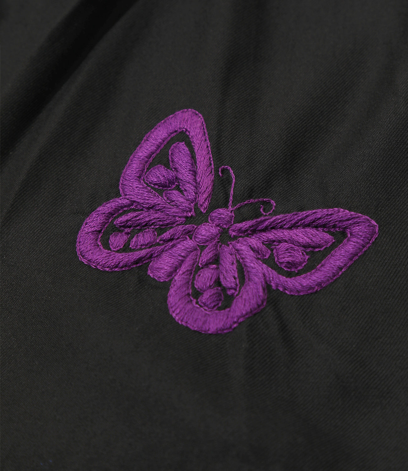 リラックス感のあるオープンカラーシャツに、パピヨンの刺繍を散りばめたオリジナリティあふれる一着。刺繍に用いられているパピヨン柄は一から制作した完全オリジナルデザインで、手作業によって丁寧に施された立体感のある刺繍が、温かみのある表情を生み出しています。 カラーはブラックとホワイトの2色展開です。