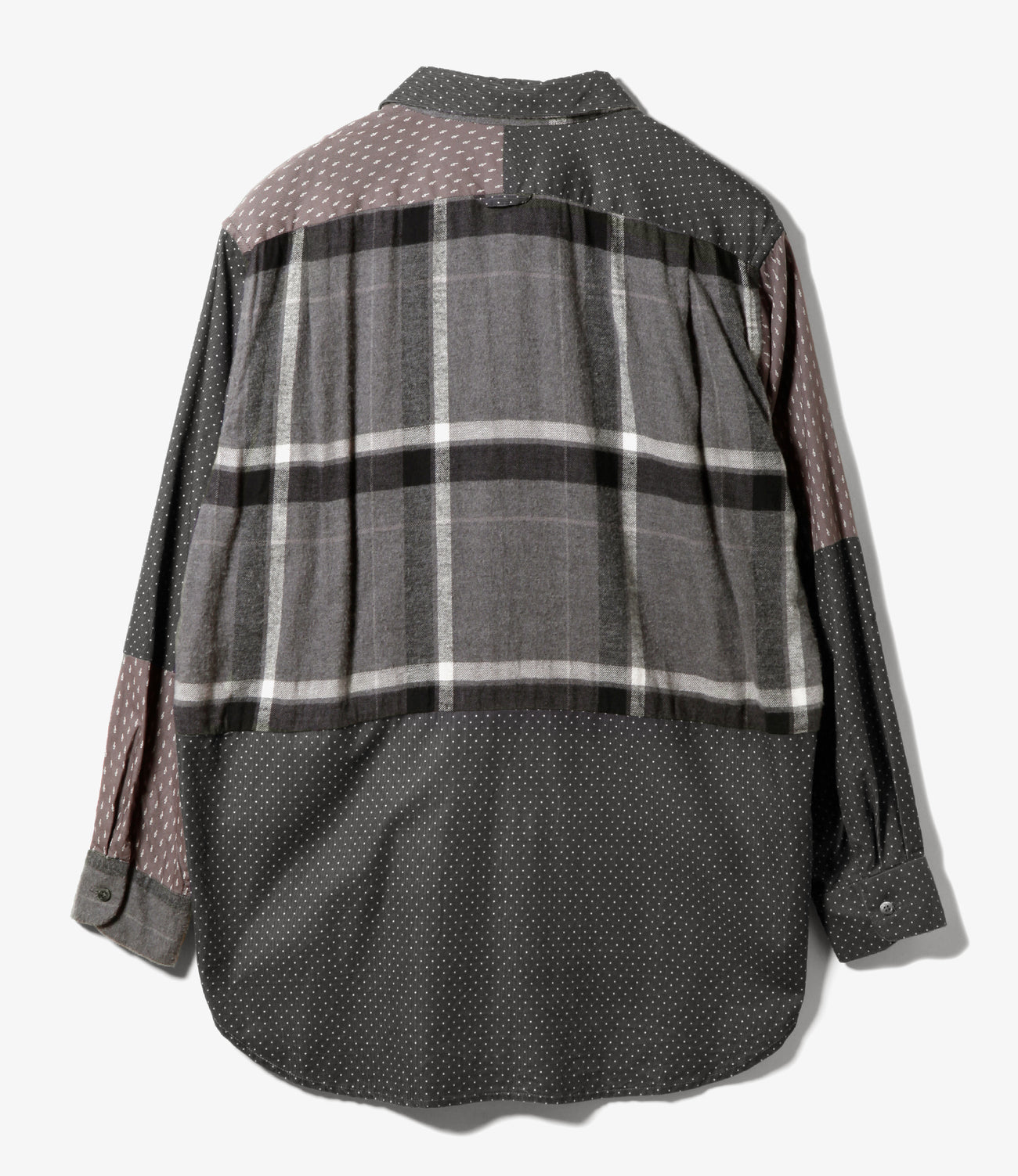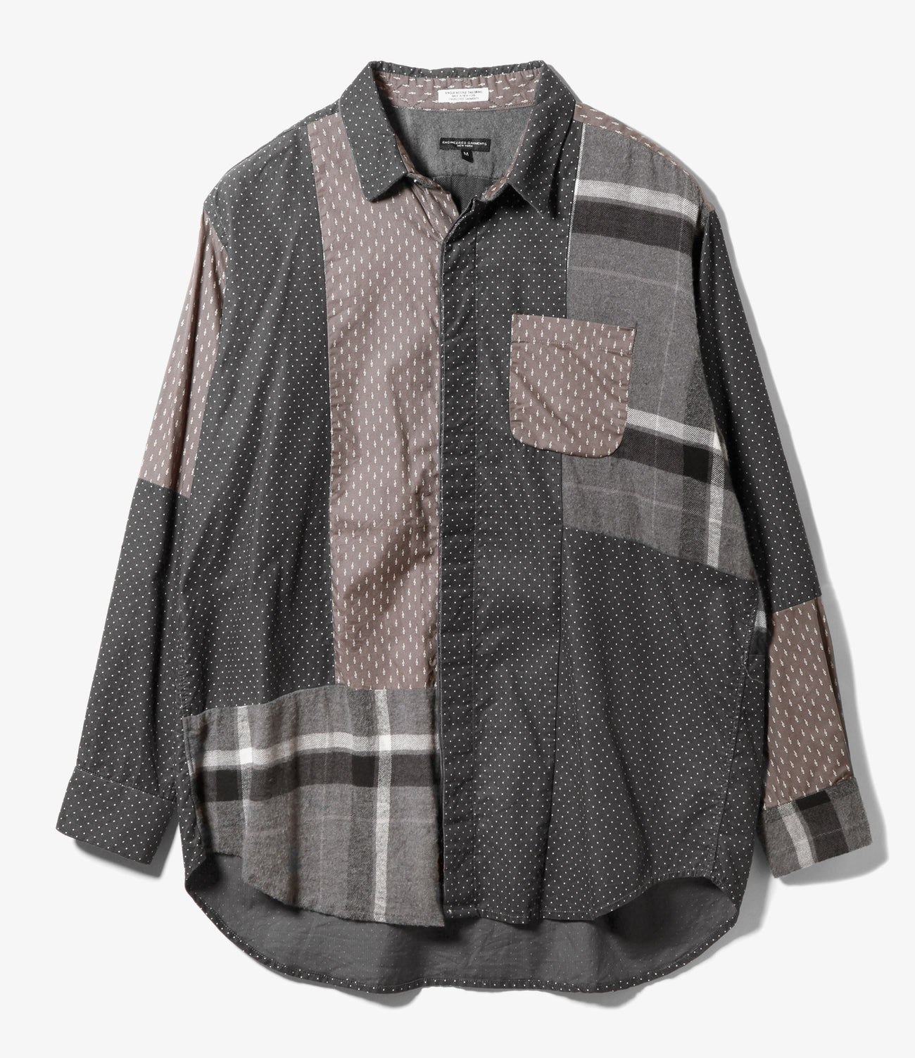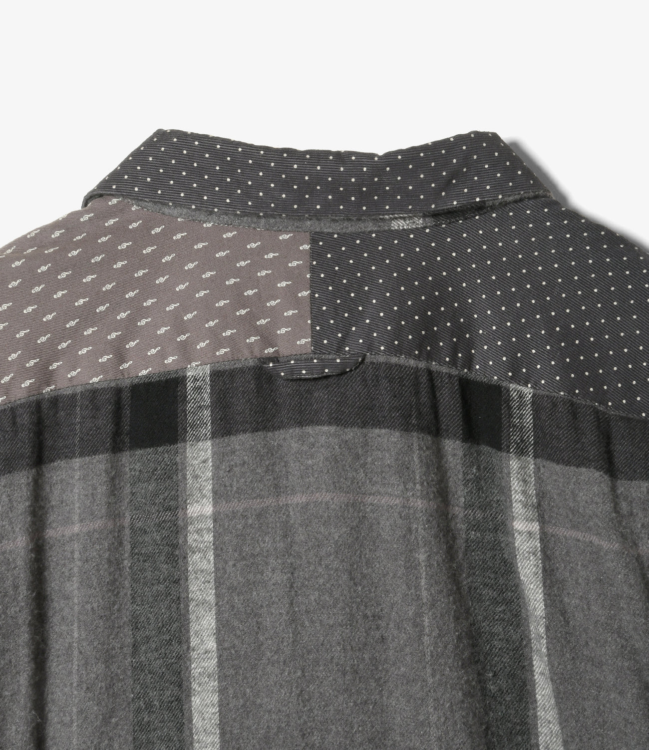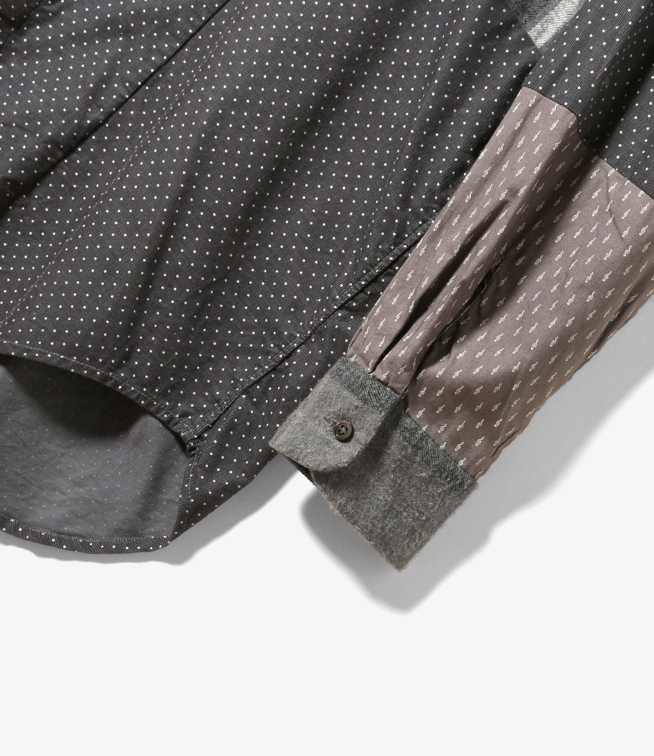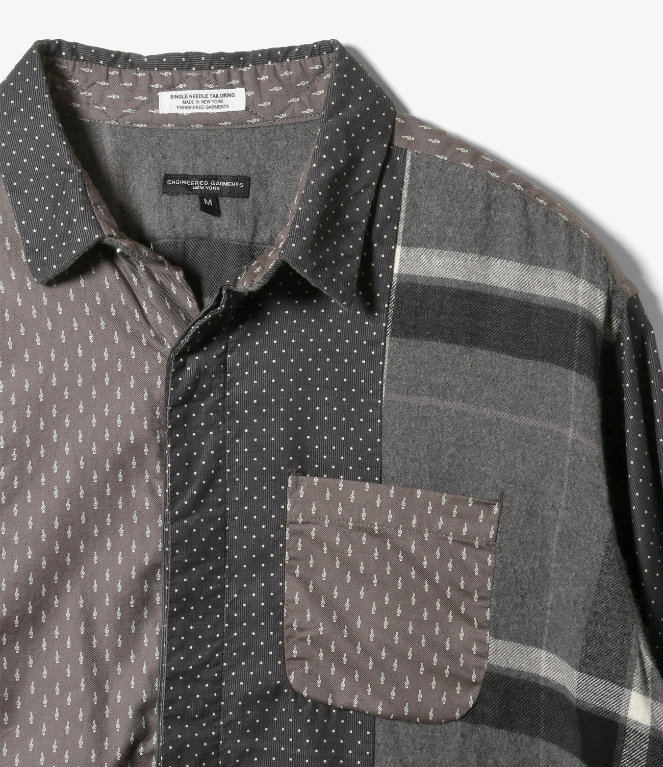 小ぶりな襟型と比翼のフロント、表側に見えるステッチを極力抑えたミニマムでドレッシーなデザインのショートカラーシャツ。身頃や袖に生地の切り替えを施した、ユニークなコンボ仕様になっています。