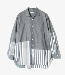 左右に広く開いた小ぶりな襟型と表側に見えるステッチを極力抑えたミニマムでドレッシーなデザインのスプレッドカラーシャツ。身頃や袖に生地の切り替えを施した、ユニークなコンボ仕様になっています。シルキーな光沢感のブロードクロスを使用し、あえて洗いをかけることで独特の表情を引き出しています。