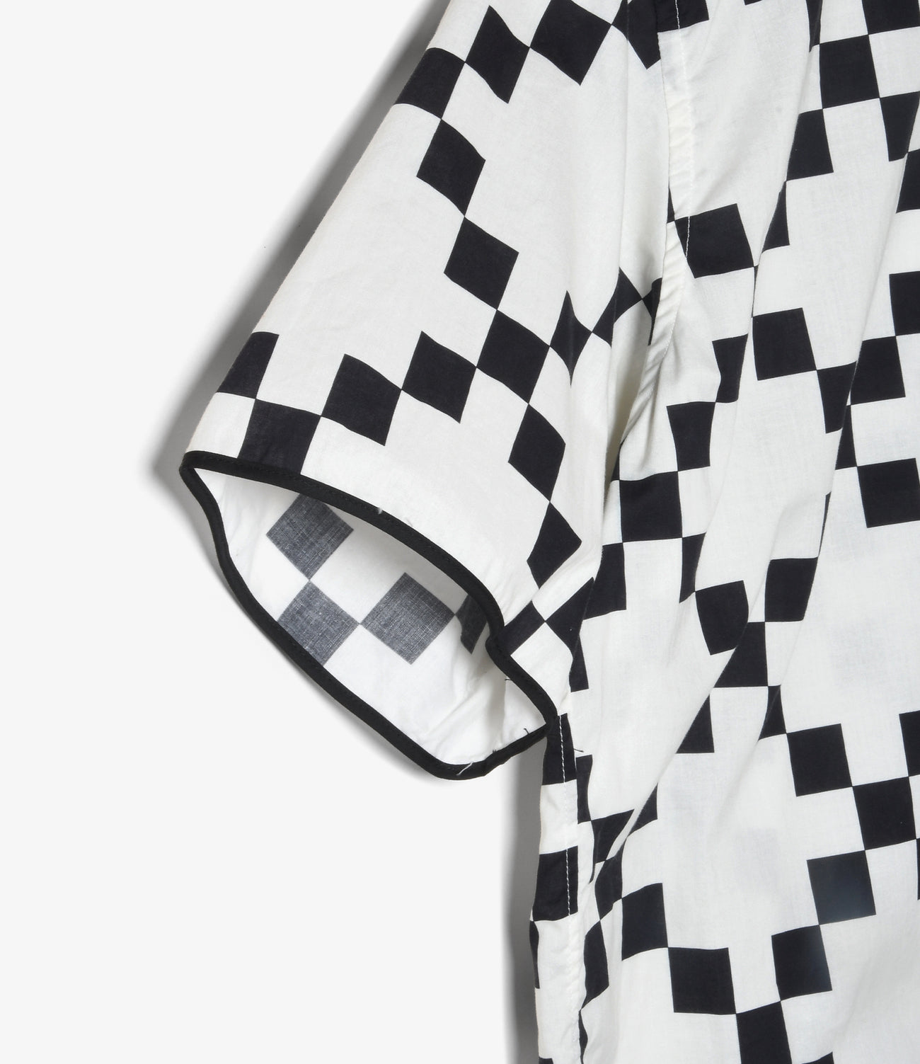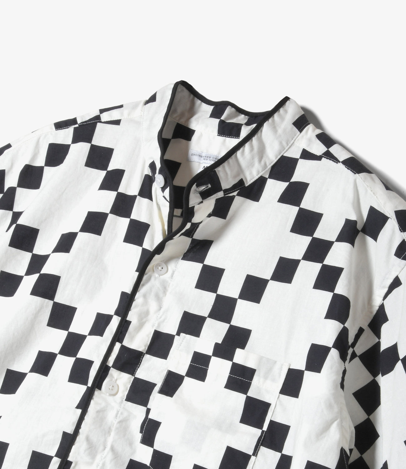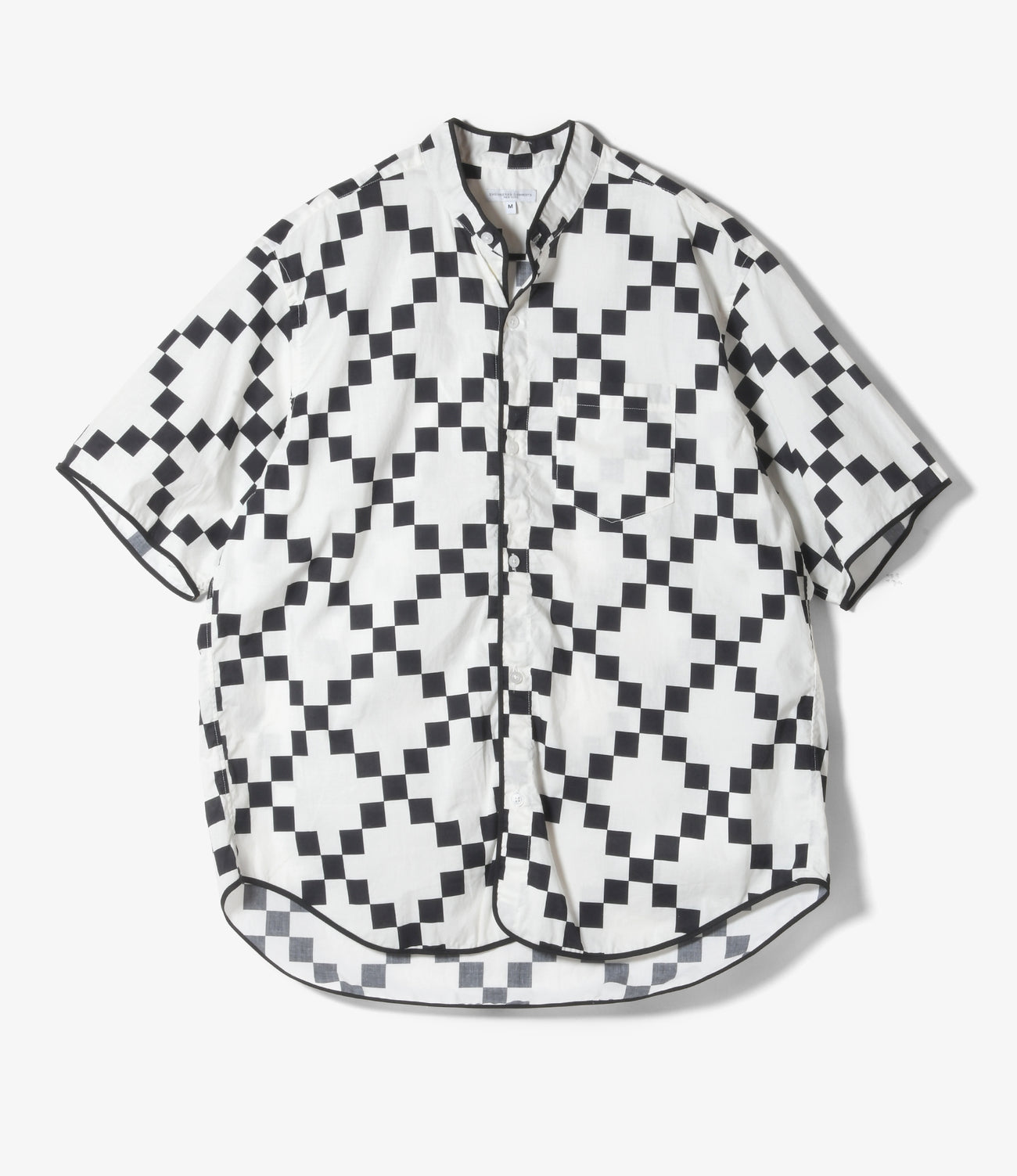 首元がバンドカラーですっきりとした涼しげのある印象の半袖シャツ。生地の端にはパイピングが施され丸みのある印象に仕上がっています。今シーズンを象徴するチェッカーパターンを採用。