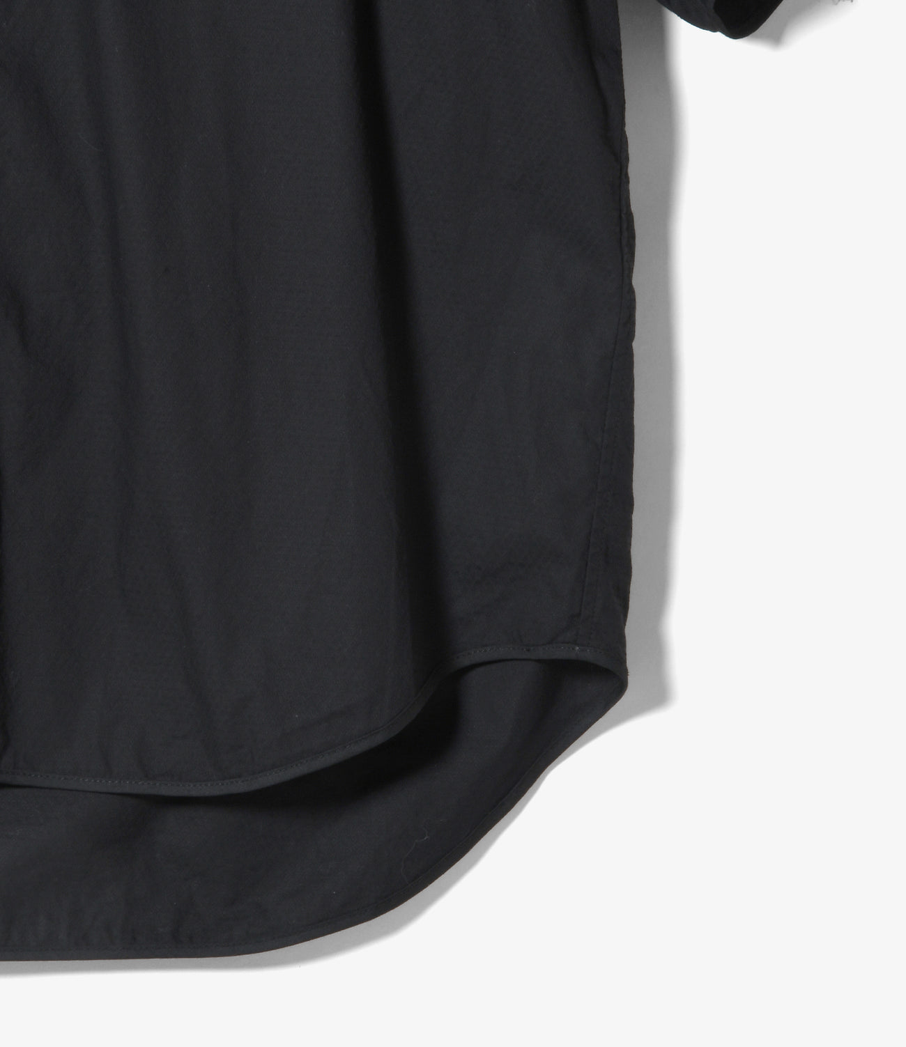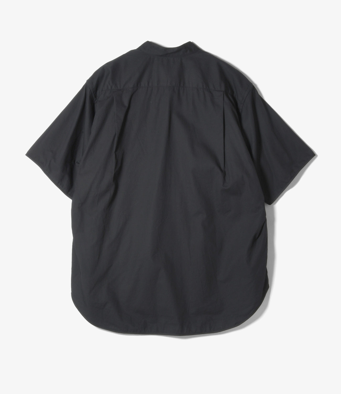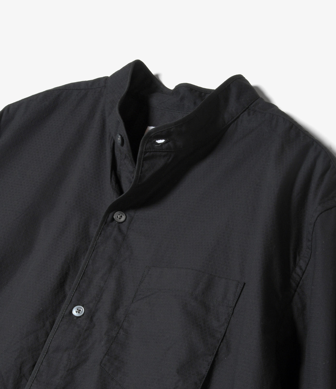 首元はバンドカラーで、すっきりとした涼しげのある印象の半袖シャツ。生地の端にはパイピングが施され丸みのある印象に仕上がっています。細やかなドビー柄が上品な印象で柔らかい肌触りです。