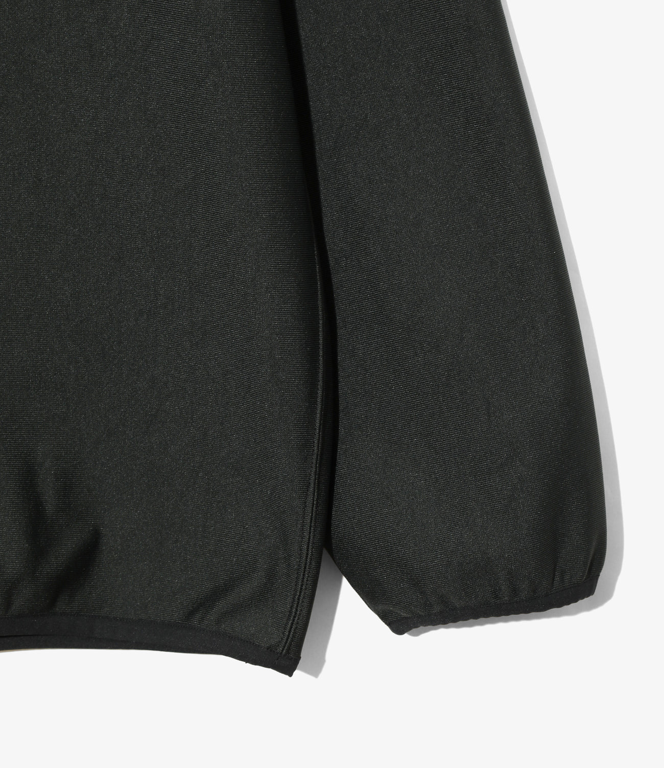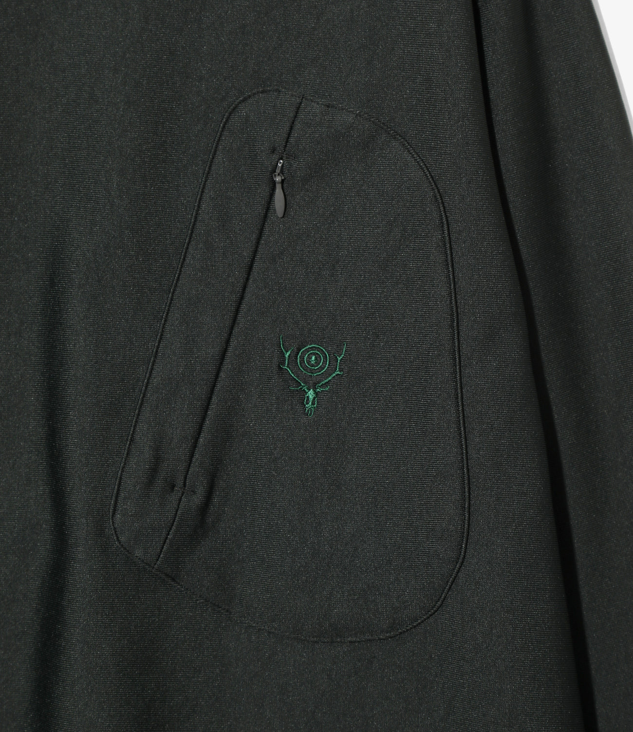 スタンドカラーとハーフジップのプルオーバー仕様がユニークな一着。胸とバックにジップポケットを備えた機能的でスポーティなアイテムとなっています。光沢感と適度な伸縮性を兼ね備えたトリコットジャージー素材を使用。