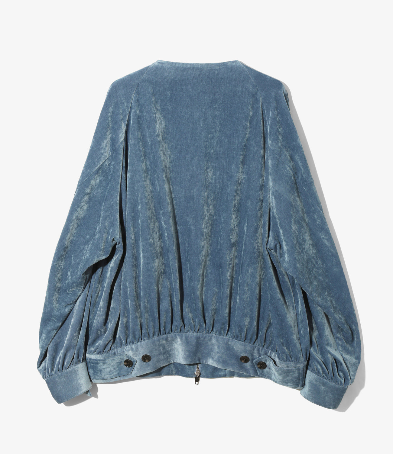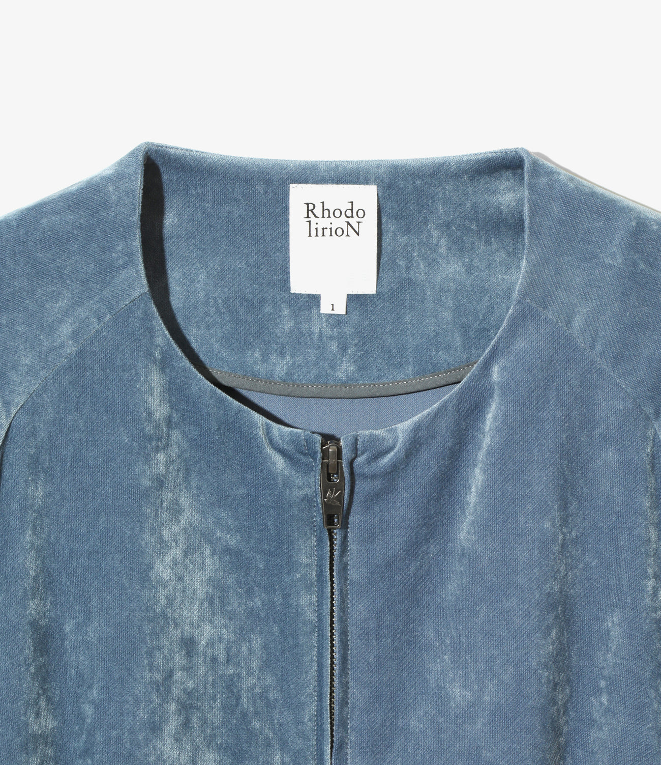 時代を超えて愛されてきたドッグイヤージャケットをソースに、<RHODOLIRION>特有の大胆なディテールを加えたブルゾンの登場です。名前の通り犬の耳のような襟が特徴のジャケットですが、襟を全てそぎ落としクルーネックにすることでフーディや大襟ブラウスのレイヤリングを際立たせます。大きく取ったラグランはドルマンスリーブのように華やかです。ウエストに搭載したタブでウエスト調整していただくことで、バルーンシルエットに変貌します。素材は光沢のあるレーヨン糸を使用した別珍素材です。上質な光沢とソフトな肌触りが特徴です。
