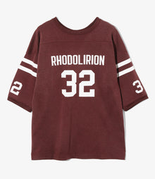 ナンバリング、ライン部分はラバープリントにそれぞれクラッキング(ひび割れ)の加工を施し、経年変化のプリント手法で表情が楽しめるオーバーサイズのフットボールTです。綿とポリエステルそれぞれの優れた特長を兼ね備えた2本の糸を同時に引き入れながら編む天竺編みの手法で編み立てたプレーティング天竺です。さらに、エイジング加工により着古したようなダメージを加えました。外面は光沢感とハリがあるしっかりとした風合い、肌に触れる内面の柔らかな肌触りなのが特徴となります。