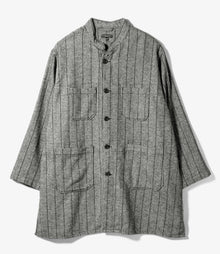 シャツジャケットとして人気のDAYTON SHIRTが更にロング丈になってリリースされました。スタンドカラーと、オフセットでデザインされた大きめのフロントボタンが特徴的なDAYTON SHIRT。シャツとして、または軽く羽織るシャツジャケットとしてもスタイルングを楽しめますが、ロング丈になったことでより着こなしの幅も広がりました。シックなカラーのストライプ柄で登場です。