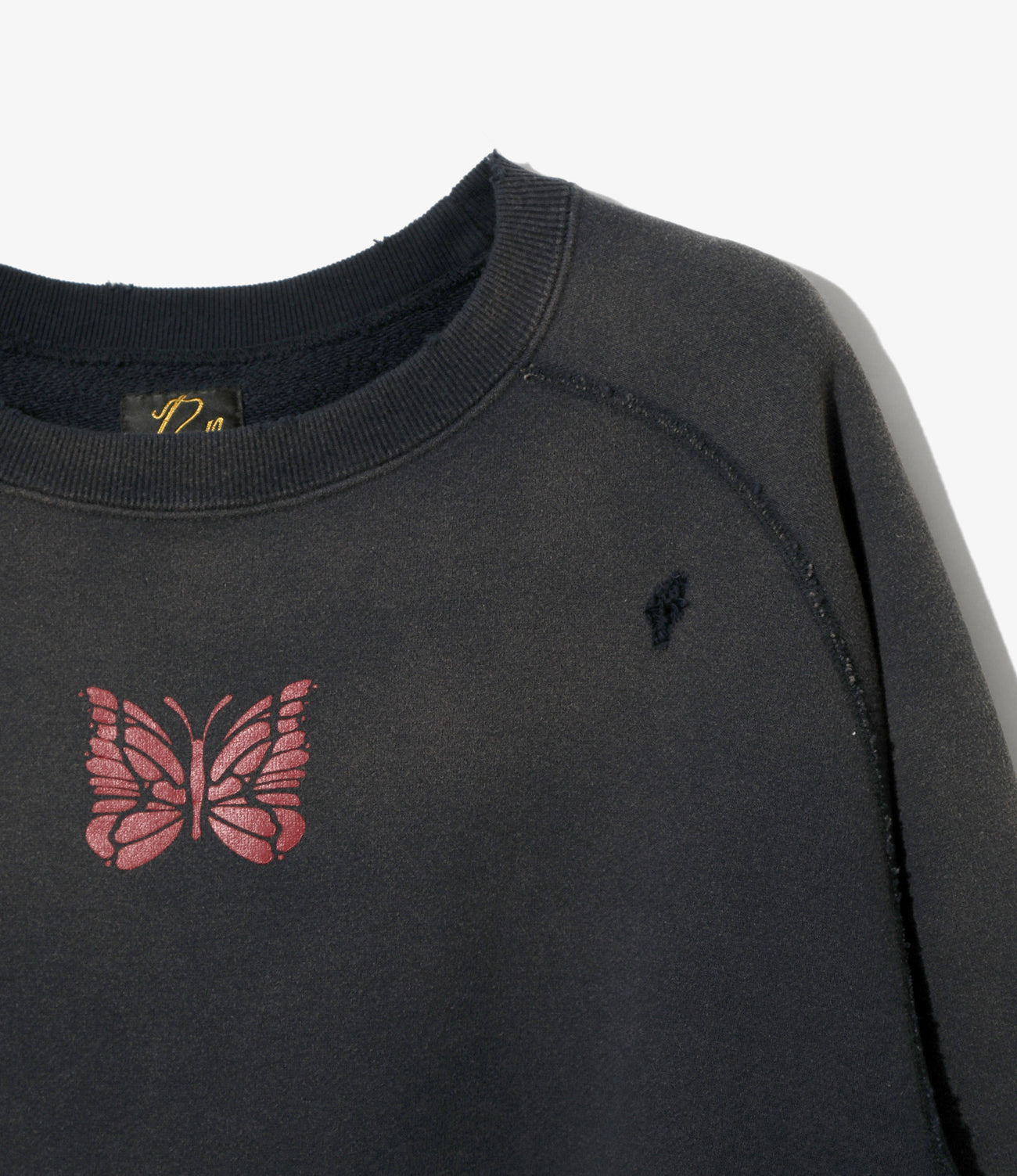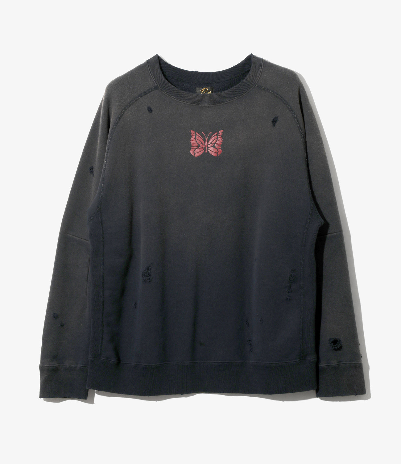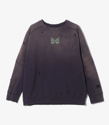 ヴィンテージスウェットのようなリアルなダメージや色褪せの加工が施されたスウェットシャツ。立体的なシルエットを生むダーツを施したデザインで、脇のリブの切り替えや、4本針のフラットシーマによるスムーズな縫製など、着用感・デザインともに非常にこだわりを感じさせる一着となっています。パピヨンのプリントが映えるカラーバリエーションは、全4色でご用意。