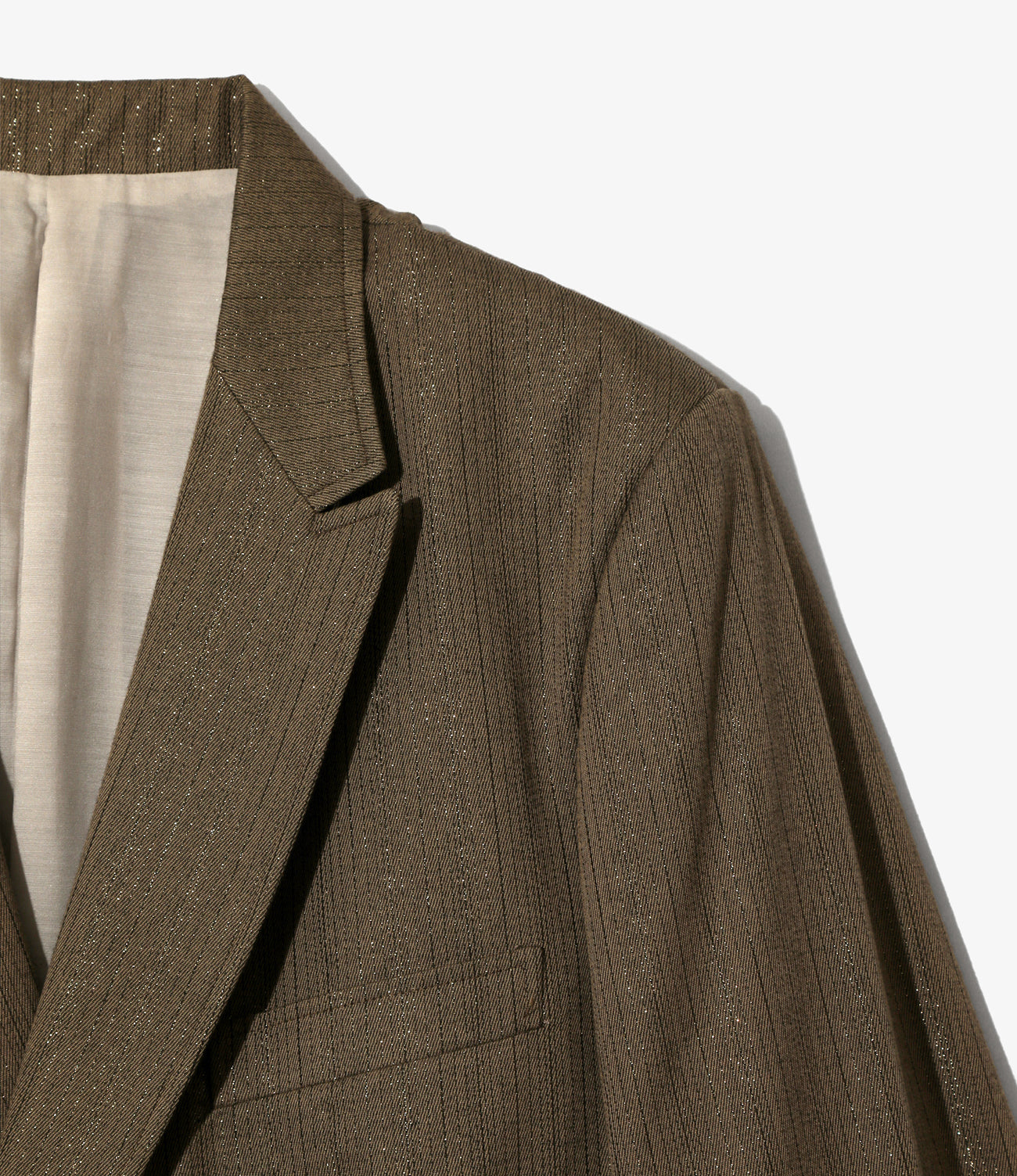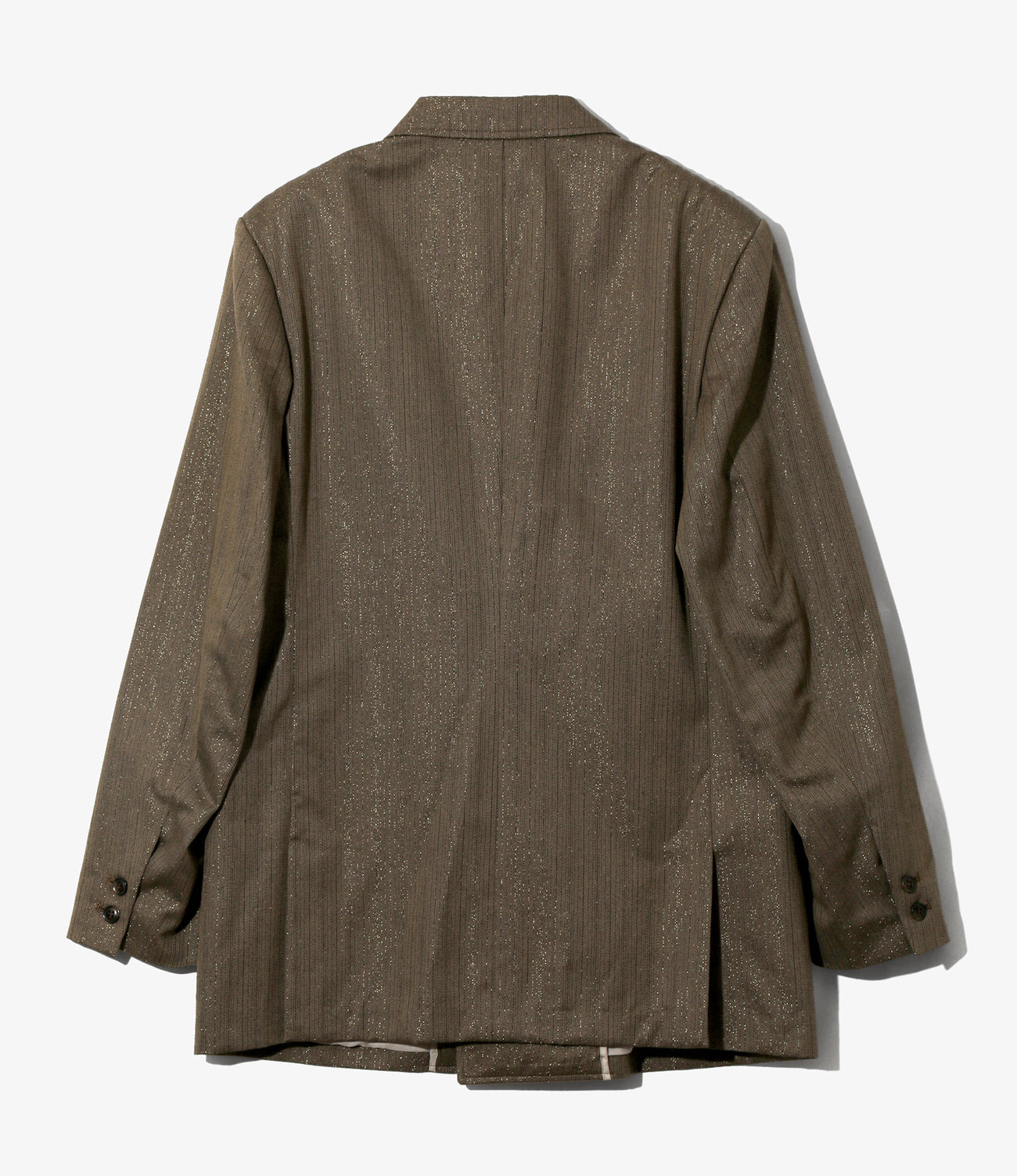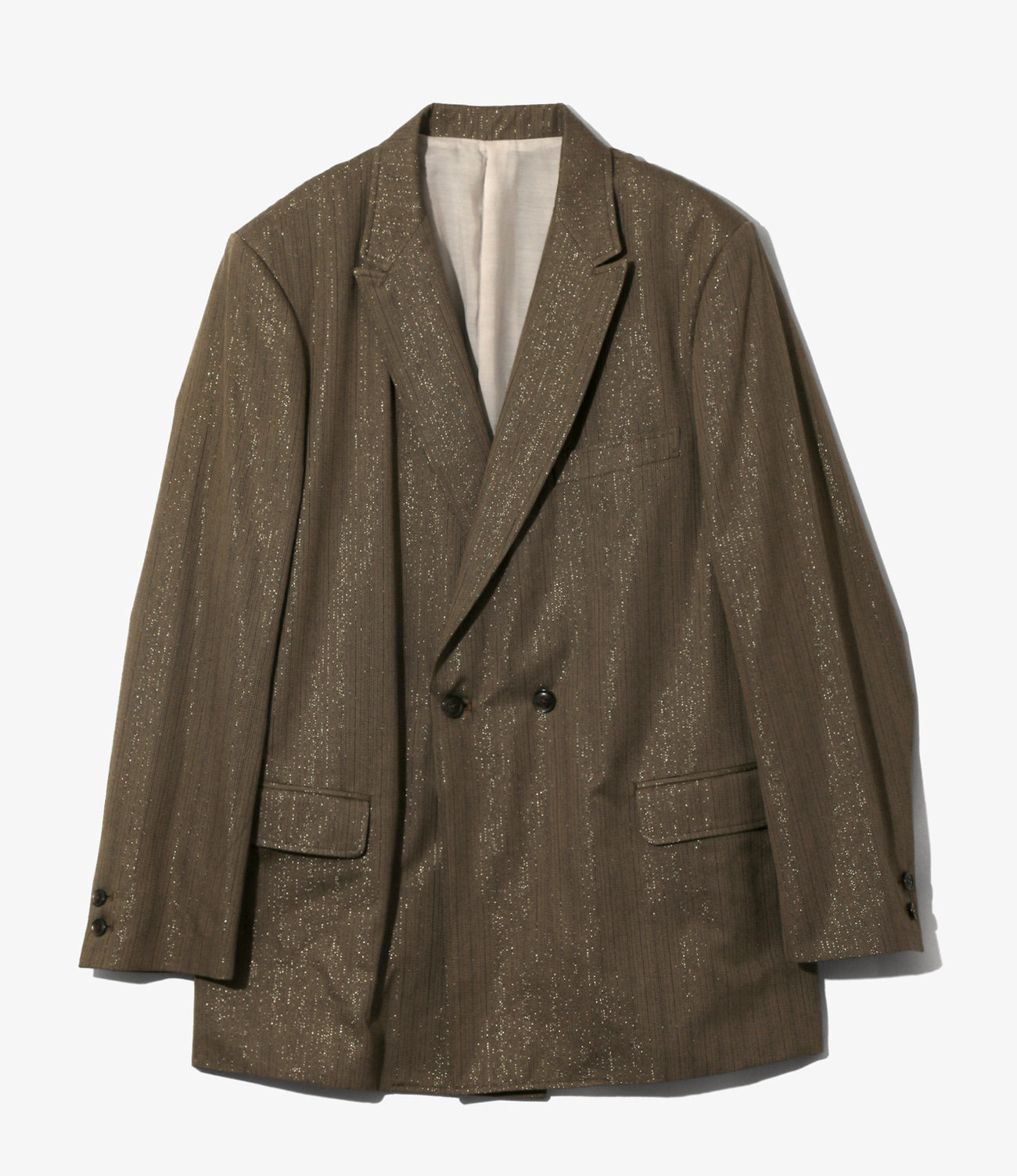 二列ボタンの打ち合わせが特徴のダブルブレストジャケット。ややゆとりを持たせたシルエットに、サイドベンツを配することで、クラシックでありながら抜け感のある印象に仕上げています。ラメ糸を織り込んだストライプ柄の生地は、光の加減でさりげなく表情が変わる上品な佇まい。総裏仕立てにより、なめらかな着心地ときれいなラインをキープします。同素材のストレートトラウザーも展開されており、セットアップでのコーディネートもおすすめです。