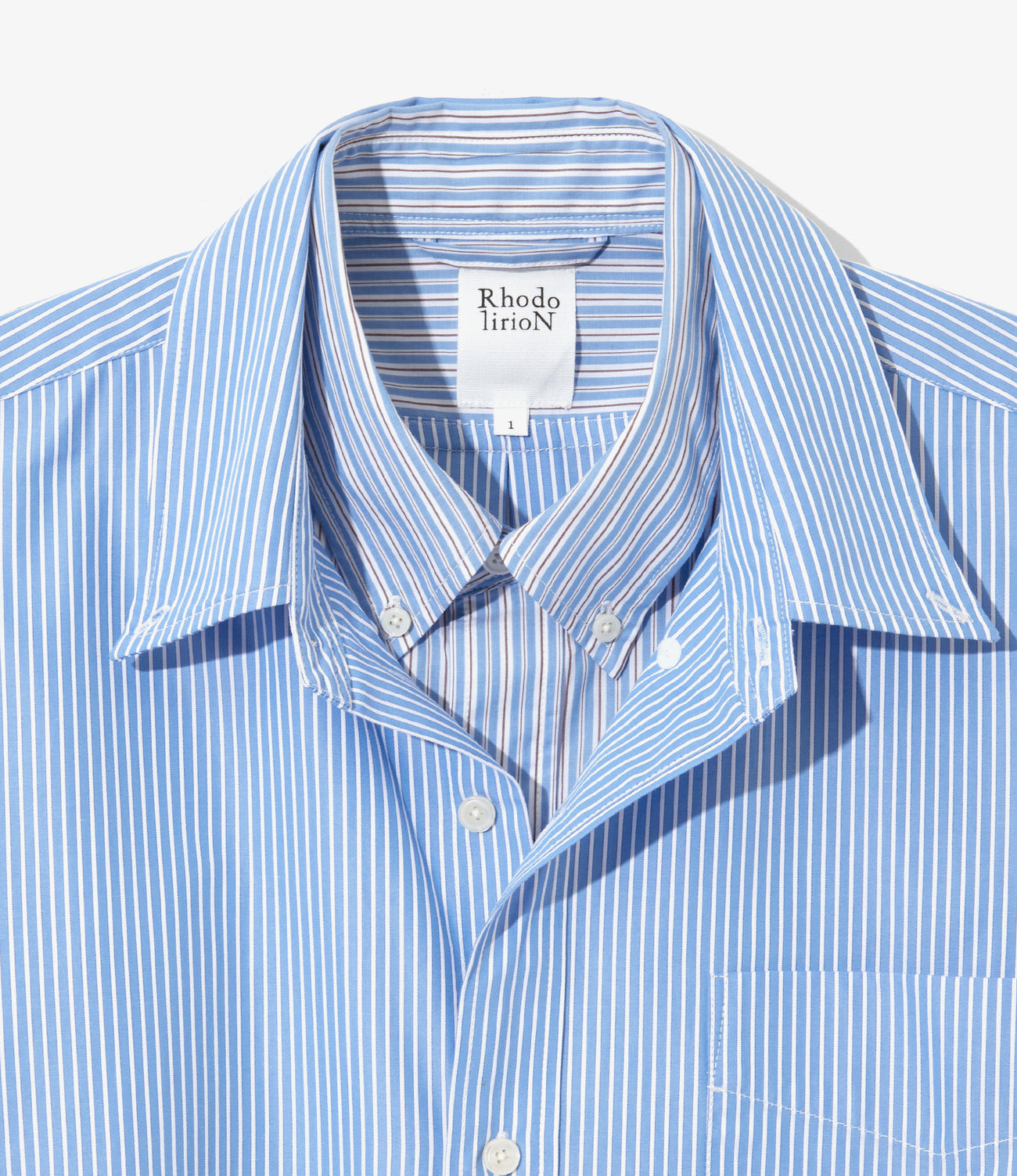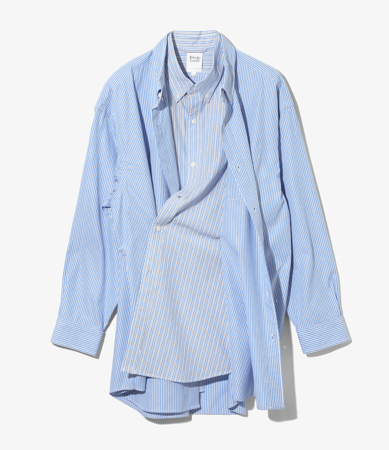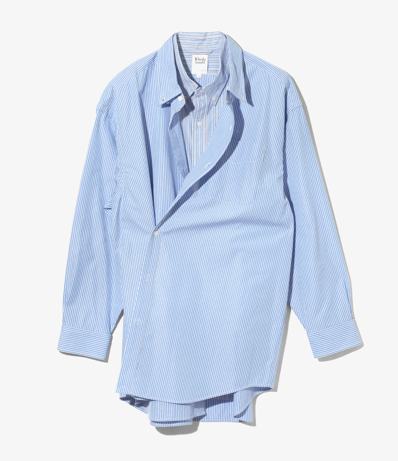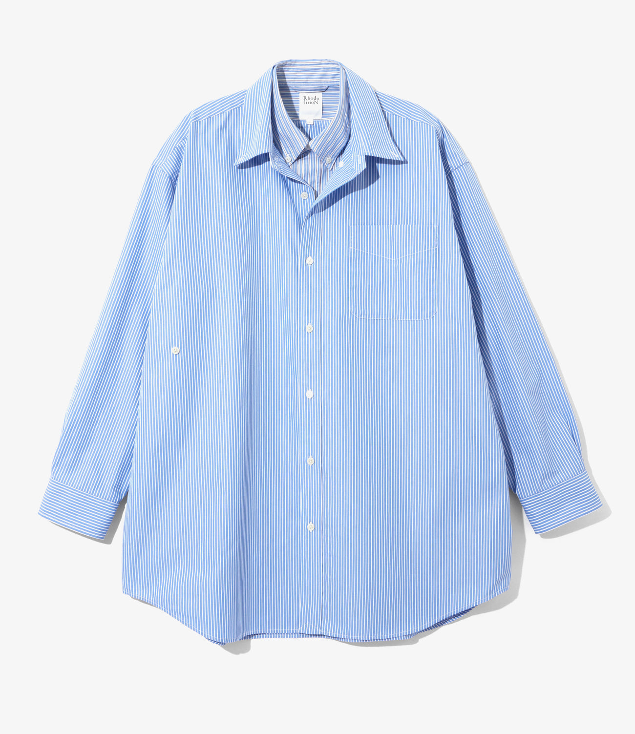 スポーティーなボタンダウンシャツを二重に重ねたような、ユニークなディテールが特徴の新作ブラウス。艶とハリのあるコットンのマルチストライプを2柄使用し、前見頃だけがレイヤードされています。右前見頃にはオプションのボタンが付いており、カシュクールのようにウエストを絞ることも可能です。ビッグシルエットなので、ミニドレスのようなスタイリングや同シリーズのバルーンパンツとのセットアップもおすすめです。