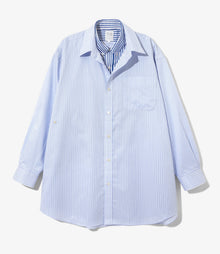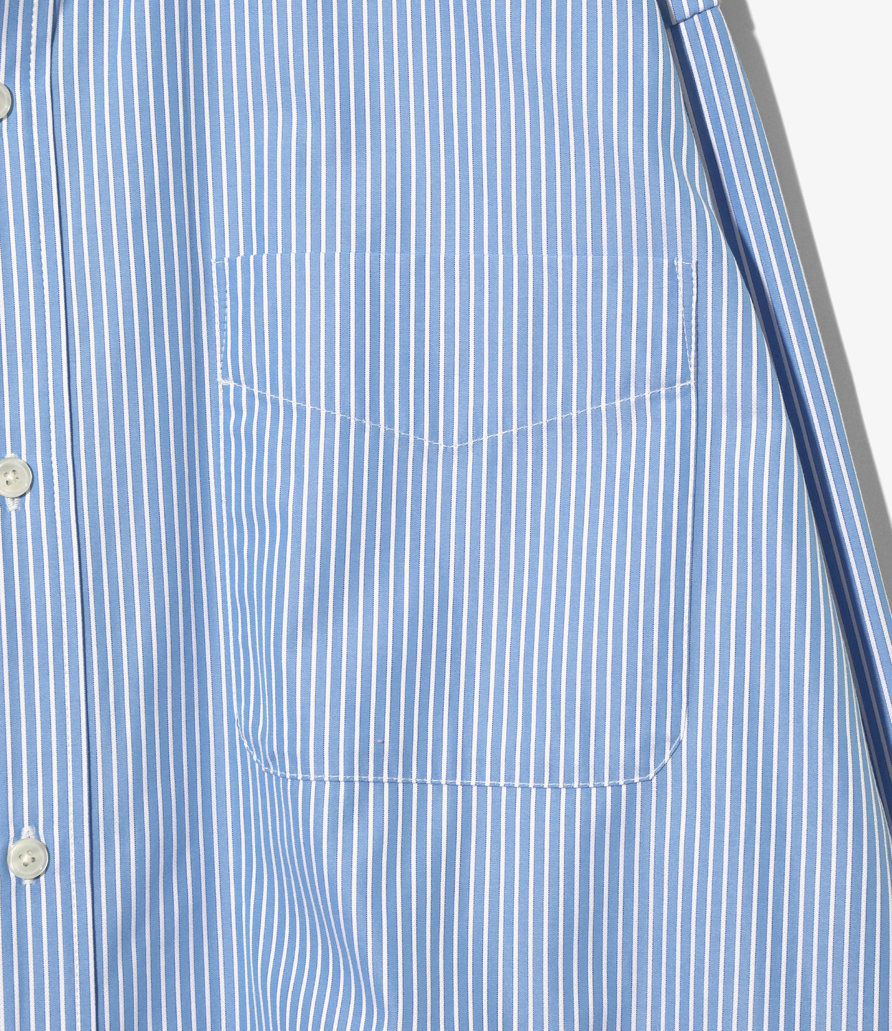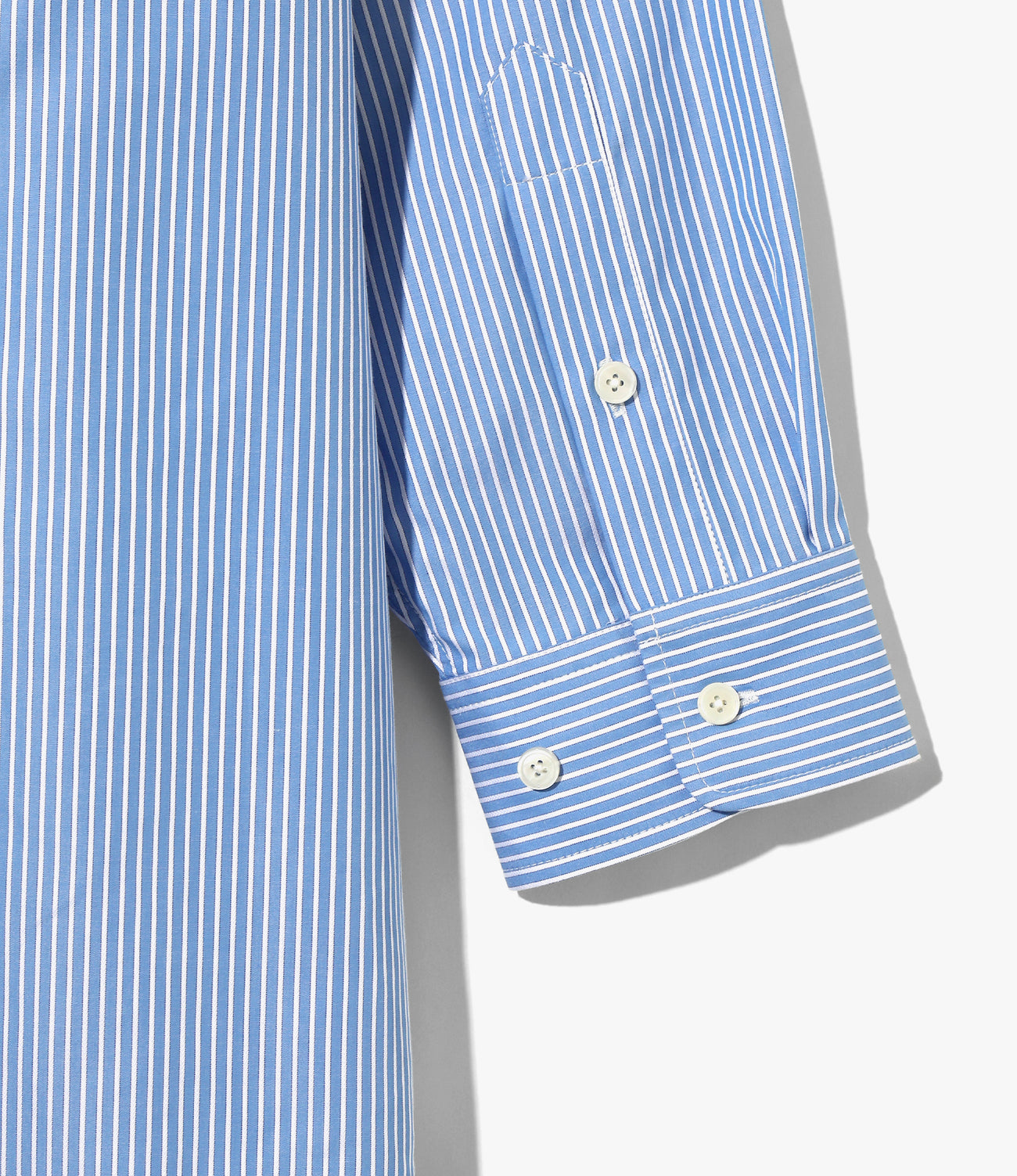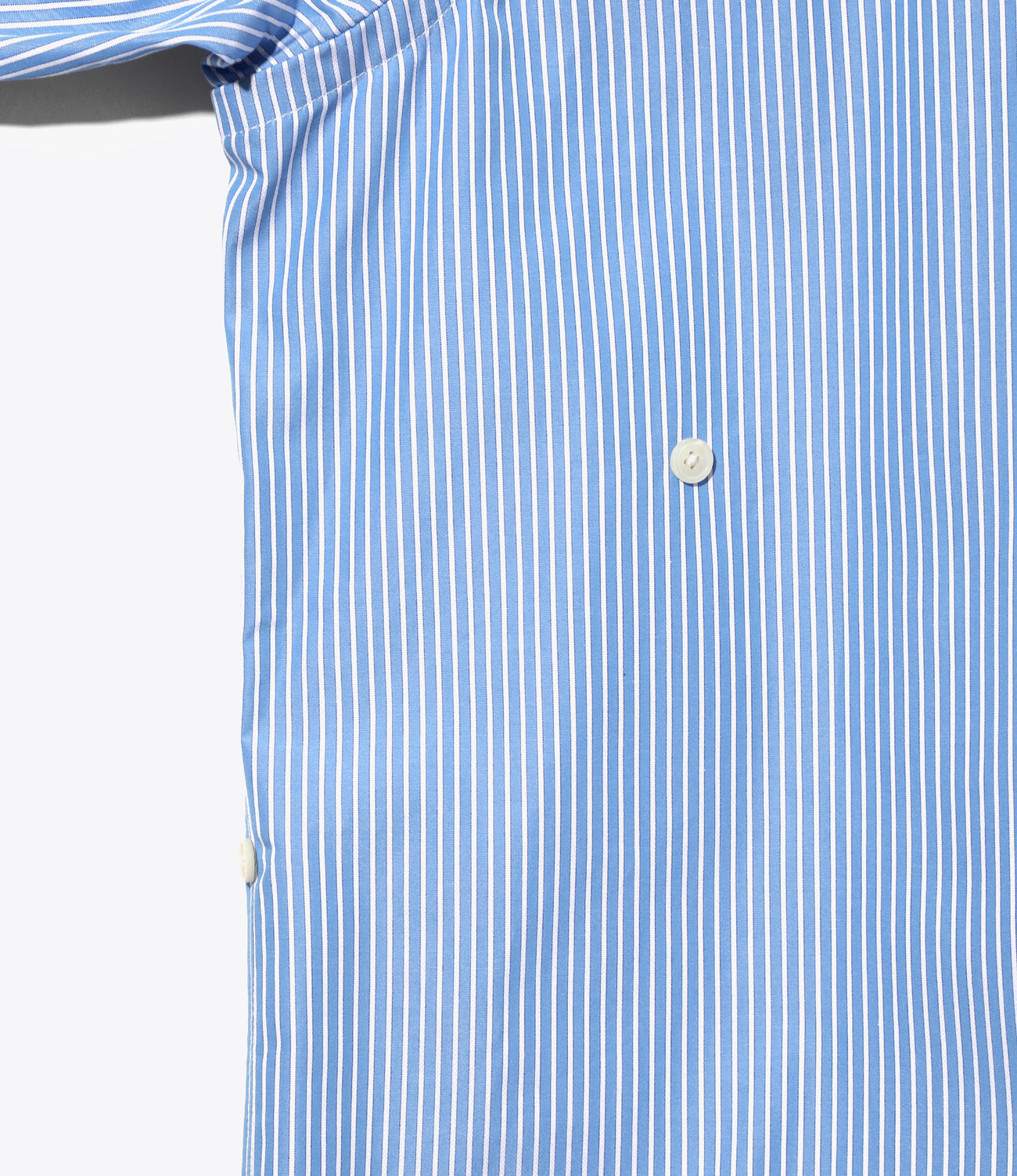 スポーティーなボタンダウンシャツを二重に重ねたような、ユニークなディテールが特徴の新作ブラウス。艶とハリのあるコットンのマルチストライプを2柄使用し、前見頃だけがレイヤードされています。右前見頃にはオプションのボタンが付いており、カシュクールのようにウエストを絞ることも可能です。ビッグシルエットなので、ミニドレスのようなスタイリングや同シリーズのバルーンパンツとのセットアップもおすすめです。