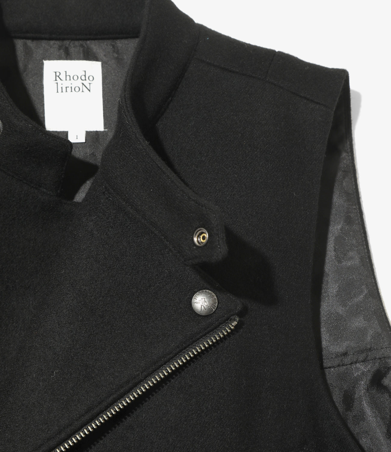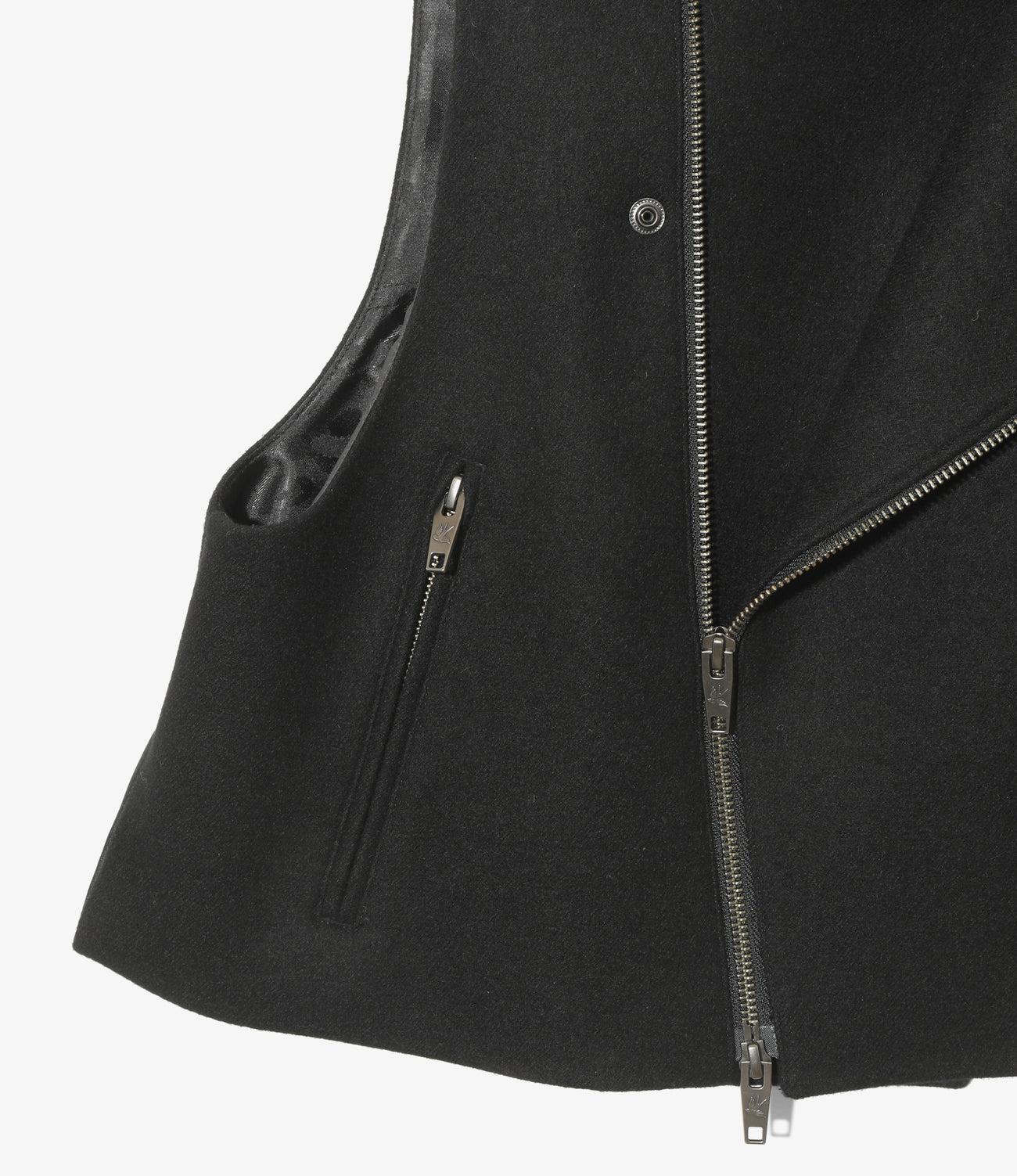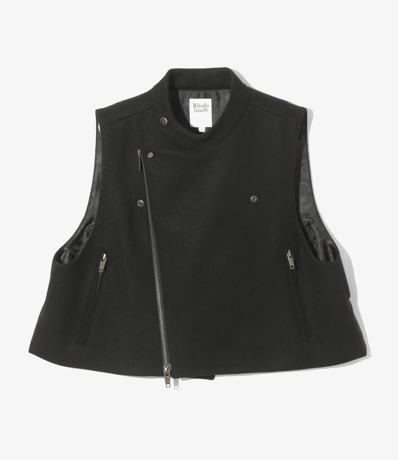 折り返し衿、斜めのジッパー留め、襟元のベルト留めなどモーターサイクルジャケットに見られるディテールを搭載しつつも、後ろ身ごろはたっぷりのドレープを効かせ、フレアシルエットがエレガントなベスト仕様です。素材は、世界有数の毛織物産地である尾州の梳毛メルトンを使用しており、特殊な加工で染料をウールの深層部にまで染み込ませることで美しい漆黒を再現。またハリコシをもたせる加工によりフォルムを際立たせてくれます。保温性、保湿性に優れ、厚手で耐久性が高いのも特徴です。同素材でジャケット、ボトムスと3アイテムでの展開です。