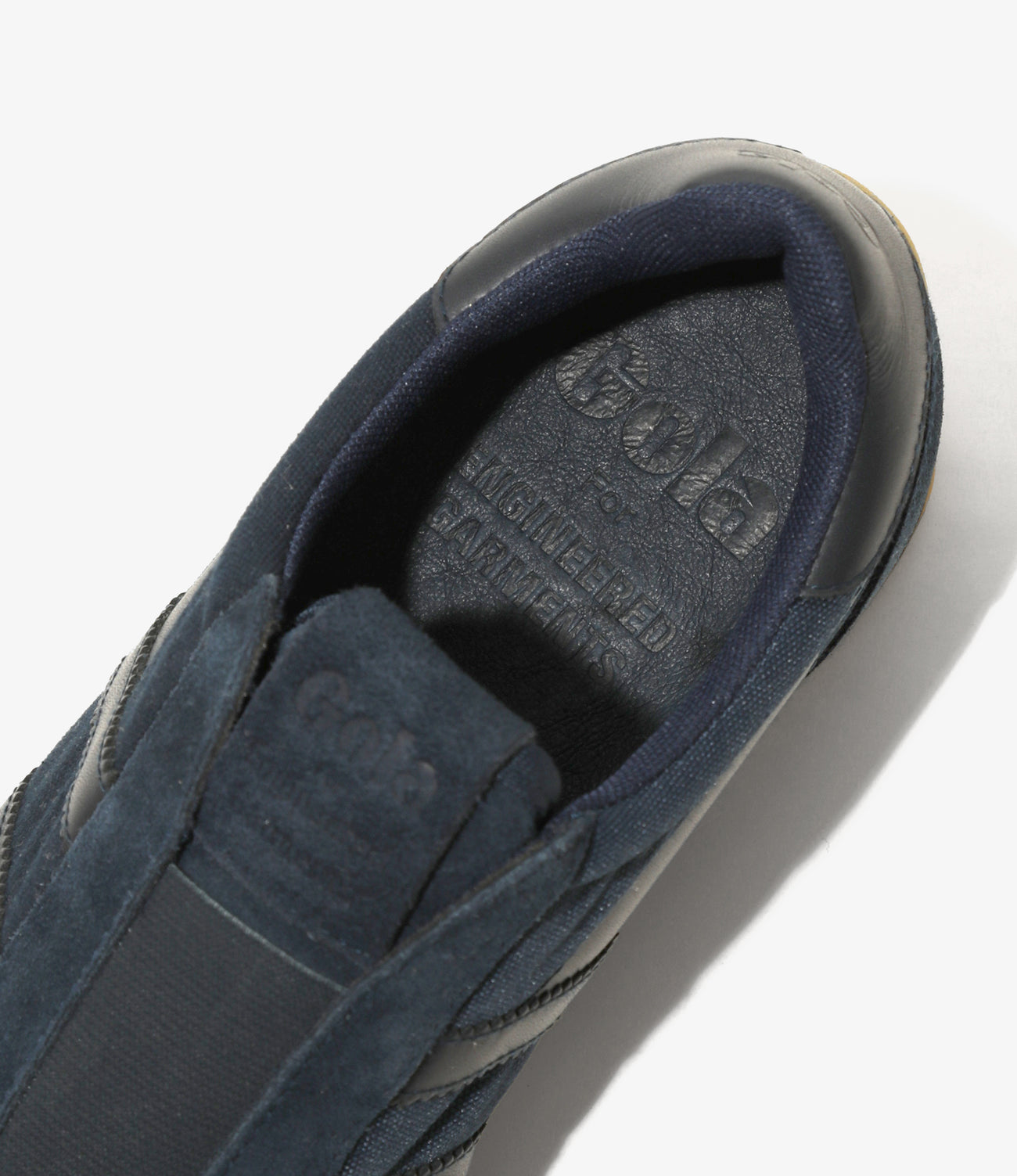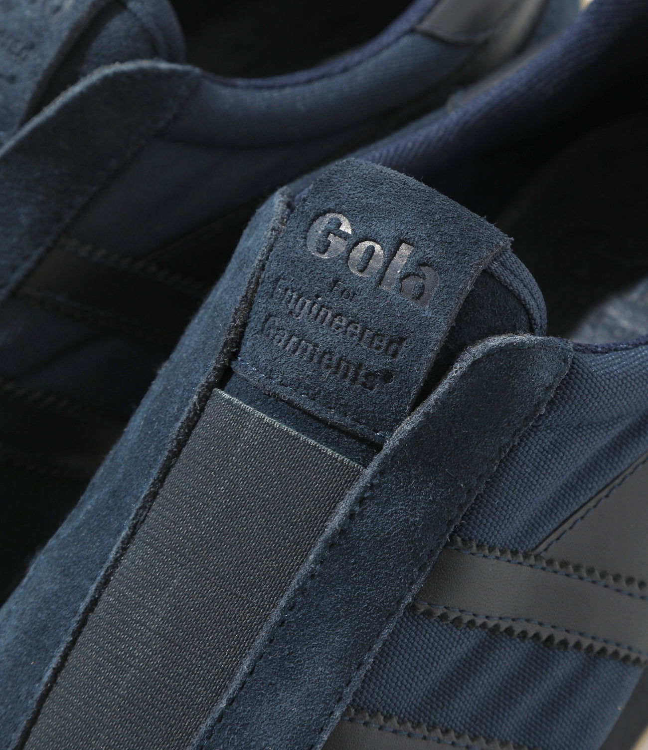 今回は、1977年に発売されたGola「Match」をベースに制作。シューレースの代わりに着脱しやすいエラスティックパネルを採用し、アッパーにはスエードとコットンツイルのコンビネーションを使用。トウ部分に施されたオーバーレイパネルが、70年代のヴィンテージスニーカーを彷彿とさせる雰囲気を演出します。サイドにはブランドを象徴するのこぎり状のウィングフラッシュ、インソールとシュータンには控えめなロゴを配置。