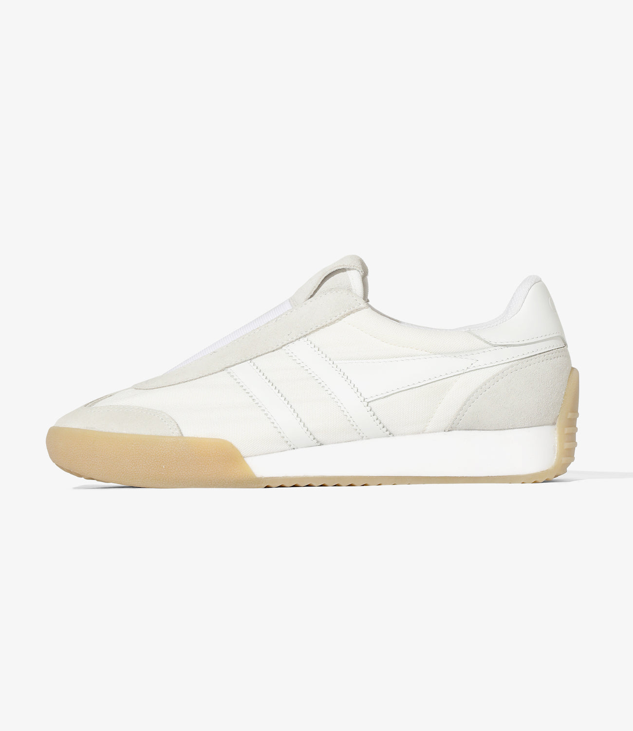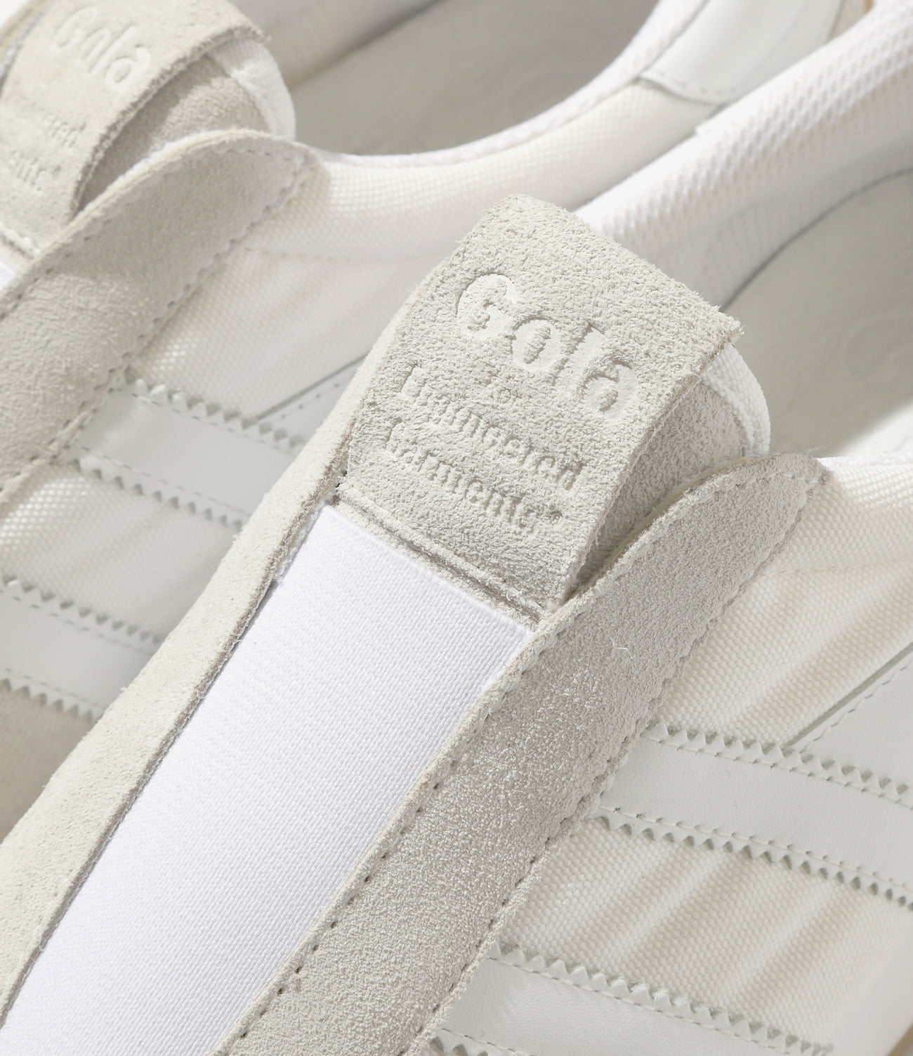 今回は、1977年に発売されたGola「Match」をベースに制作。シューレースの代わりに着脱しやすいエラスティックパネルを採用し、アッパーにはスエードとコットンツイルのコンビネーションを使用。トウ部分に施されたオーバーレイパネルが、70年代のヴィンテージスニーカーを彷彿とさせる雰囲気を演出します。サイドにはブランドを象徴するのこぎり状のウィングフラッシュ、インソールとシュータンには控えめなロゴを配置。