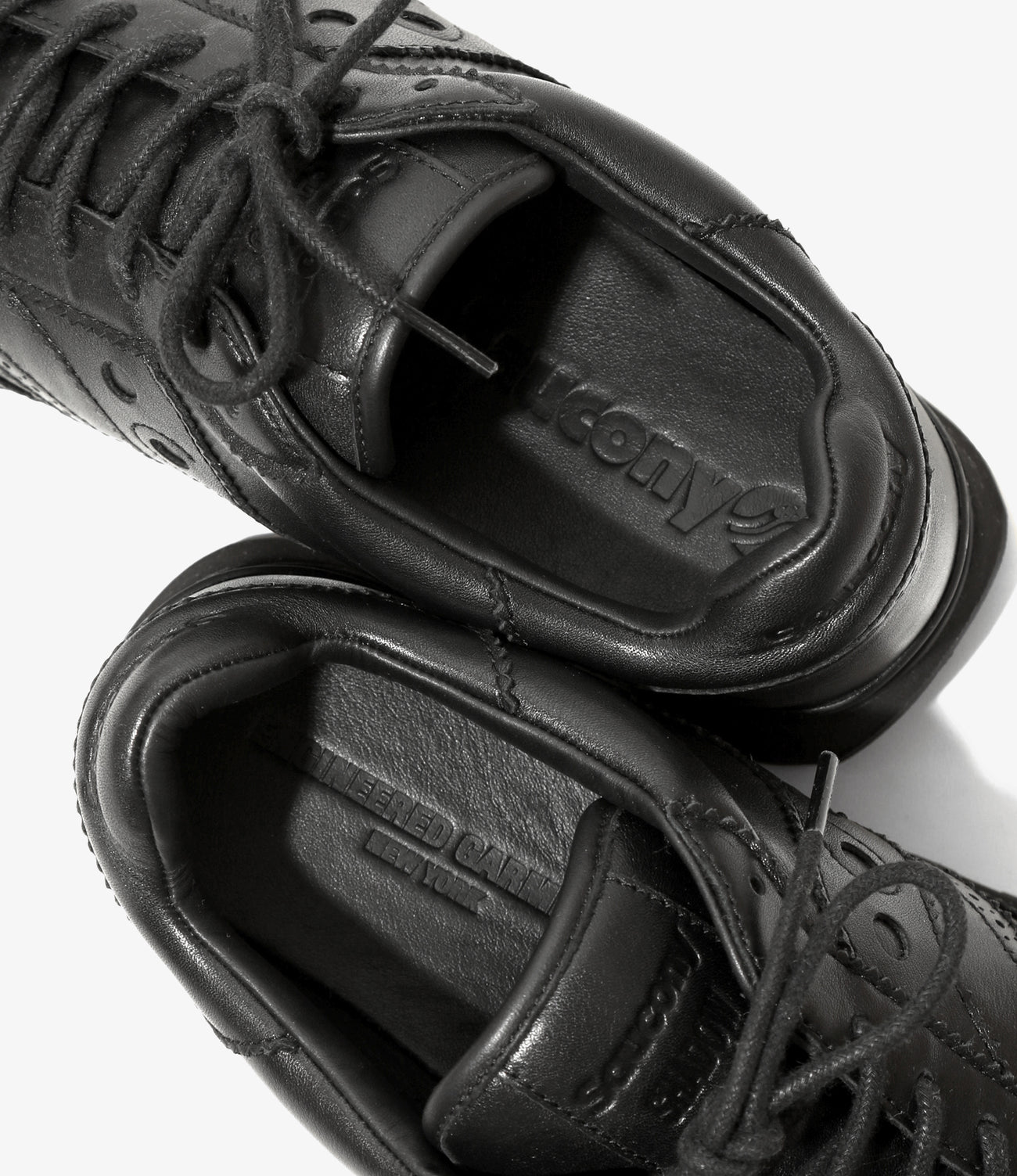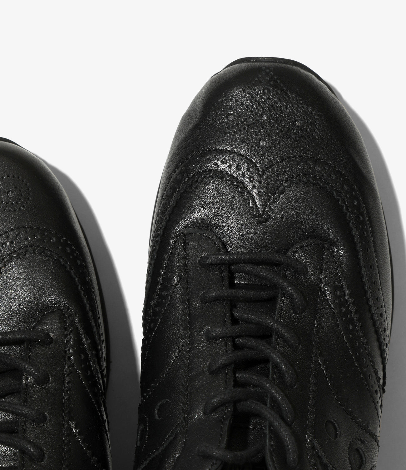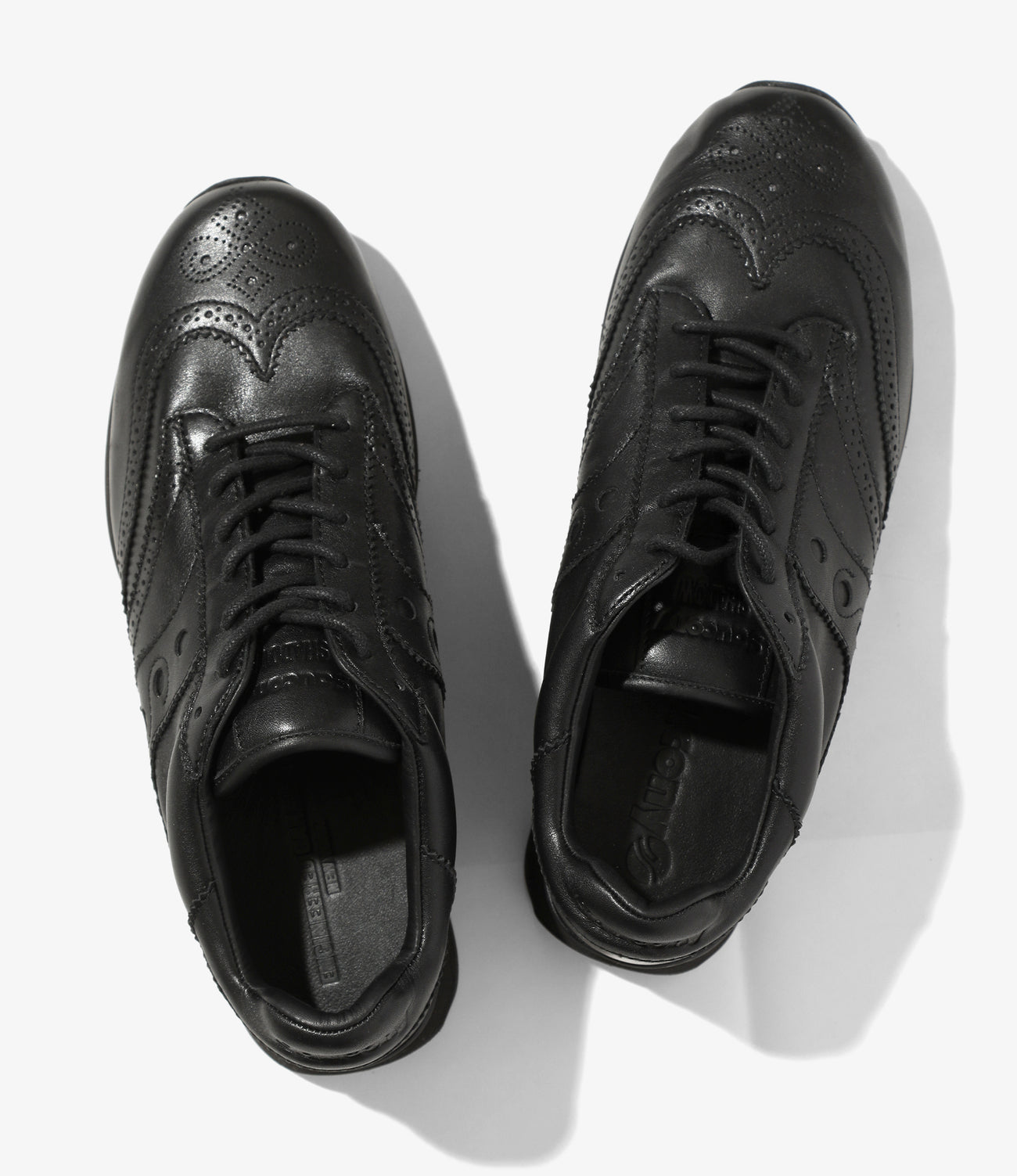 アッパーには、天然のシボが美しい上質なフルグレインレザーを使用。トゥ部分にはウィングチップデザインを採用し、全体に施されたブローギング(穴飾り)が、伝統的なドレスシューズを思わせる仕上がりになっています。一方、アウトソールにはオリジナルモデルの"トライアングル ラグ パターン"と呼ばれる三角形のソールパターンを採用し、グリップ力と安定性はそのまま継承。ドレスシューズの佇まいながら、ランニングシューズ本来の快適性を実現しています。ヒールとシュータンには、上品なデザインに馴染む両ブランドの控えめなデボスロゴを配置しました。