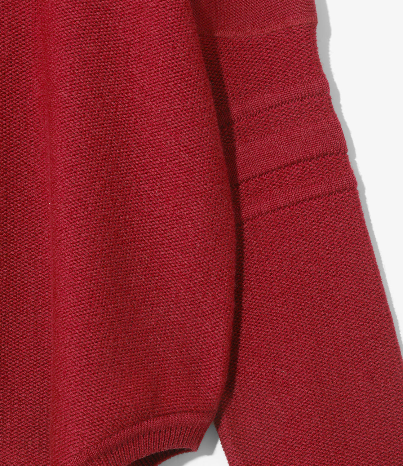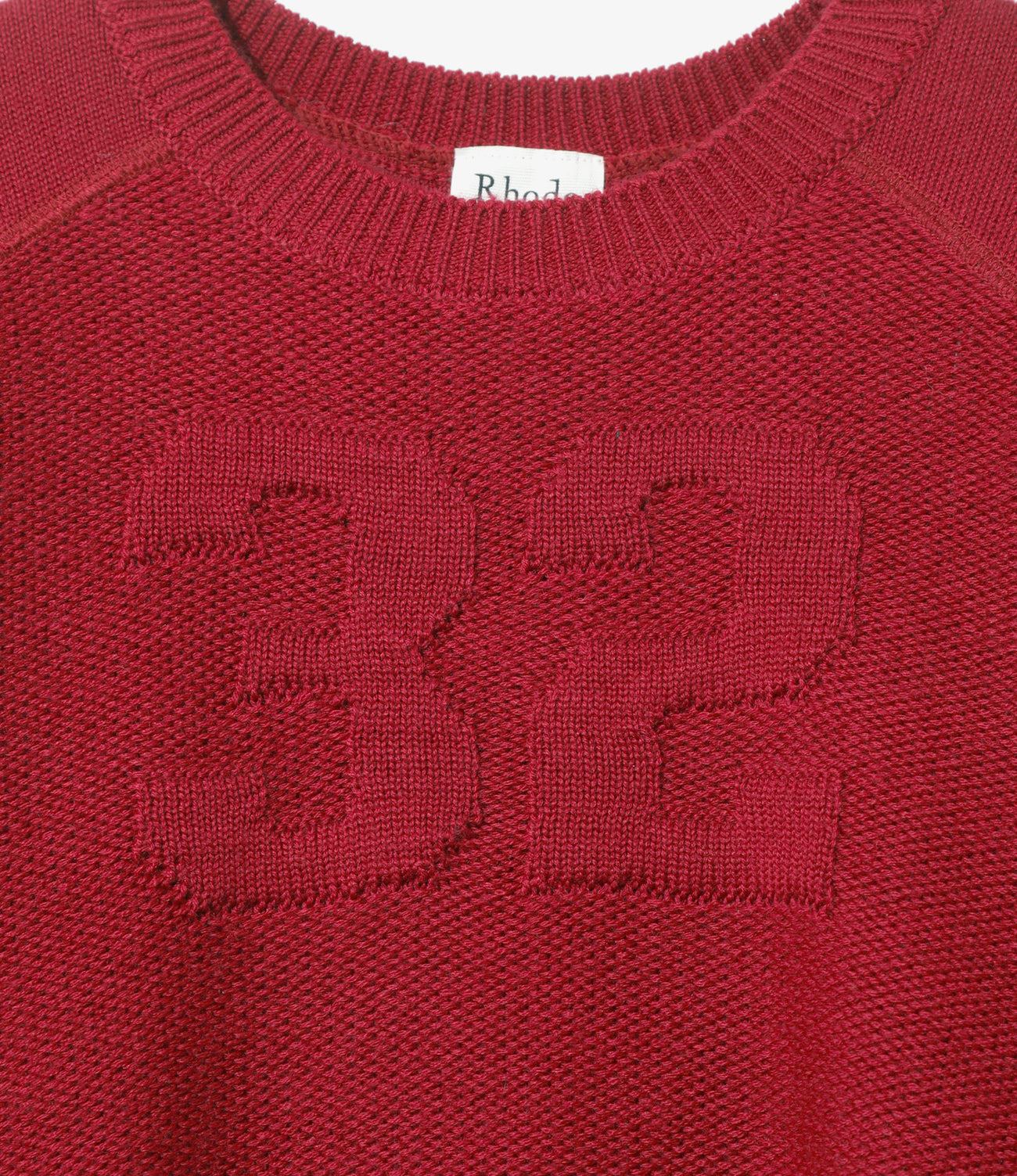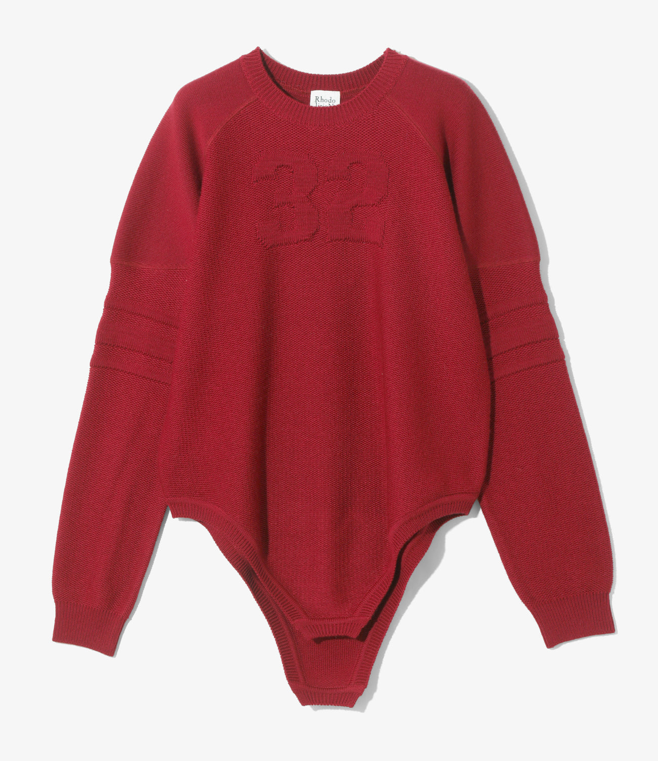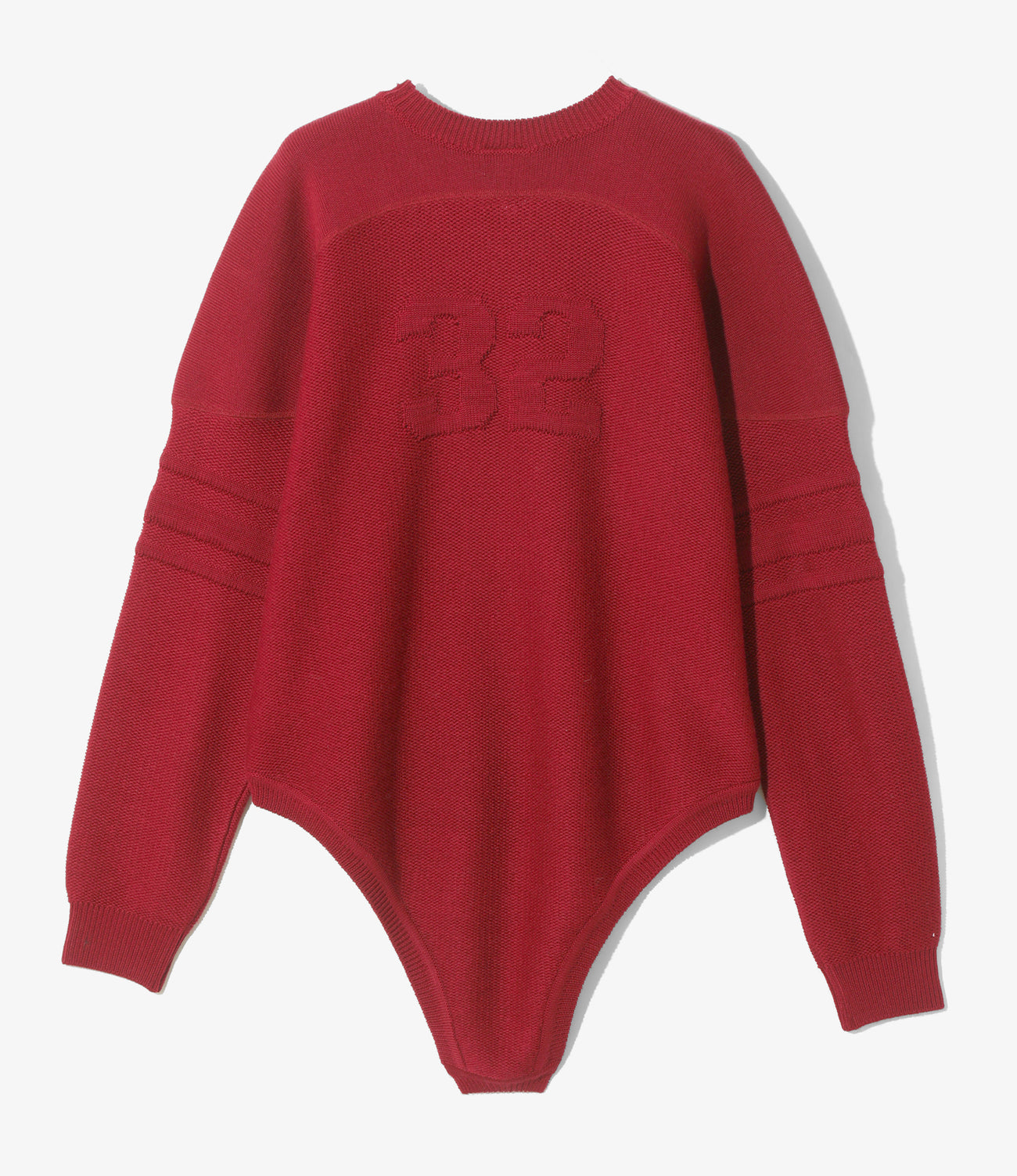1920年から30年代にかけて主流だったヴィンテージのフットボールジャージーをインスピレーションにボディスーツタイプをニットで製作しました。ナンバリングとライン、ショルダー部分を浮き出し編みで編みの変化をつけています。素材はピリング(毛玉)の原因になる摩擦を軽減させる加工を施したアクリル糸と防縮ウールを混紡した、機能的でソフトな風合いを併せ持つ高級感のある素材です。着心地の良い柔らかさ、艶のある落ち着いた光沢感をお楽しみください。