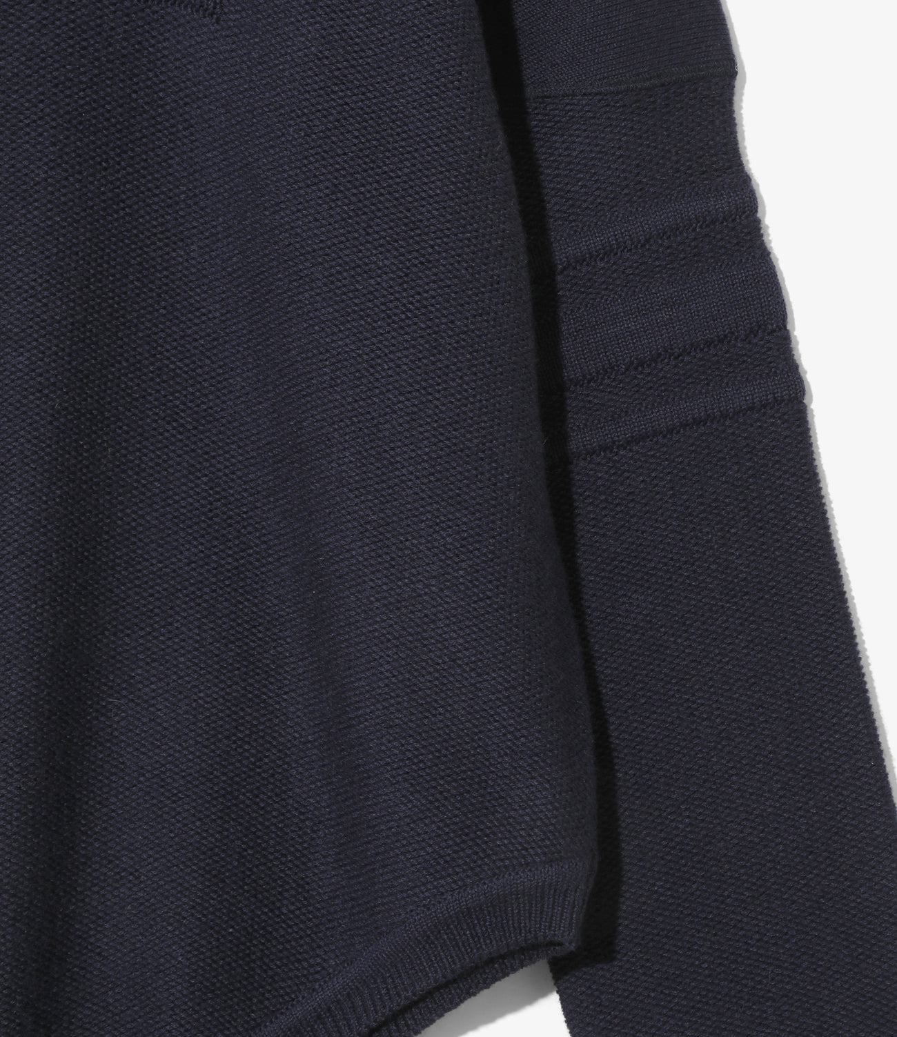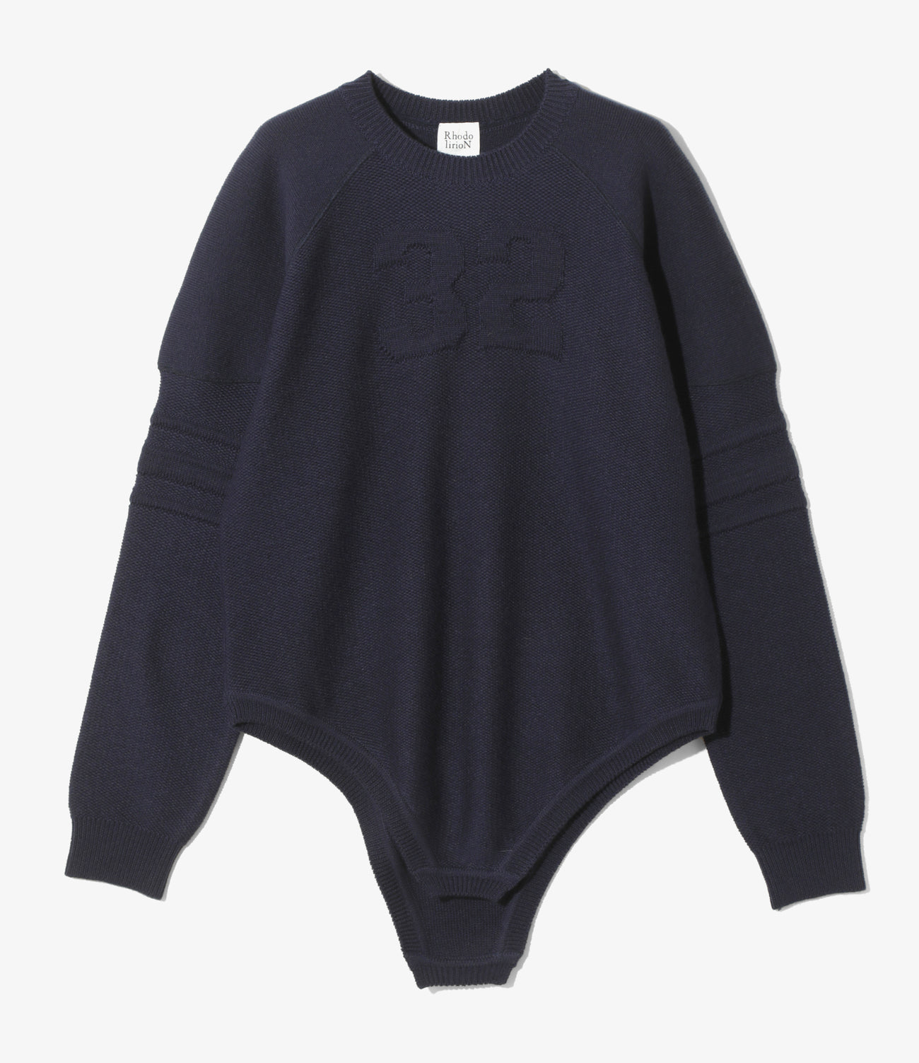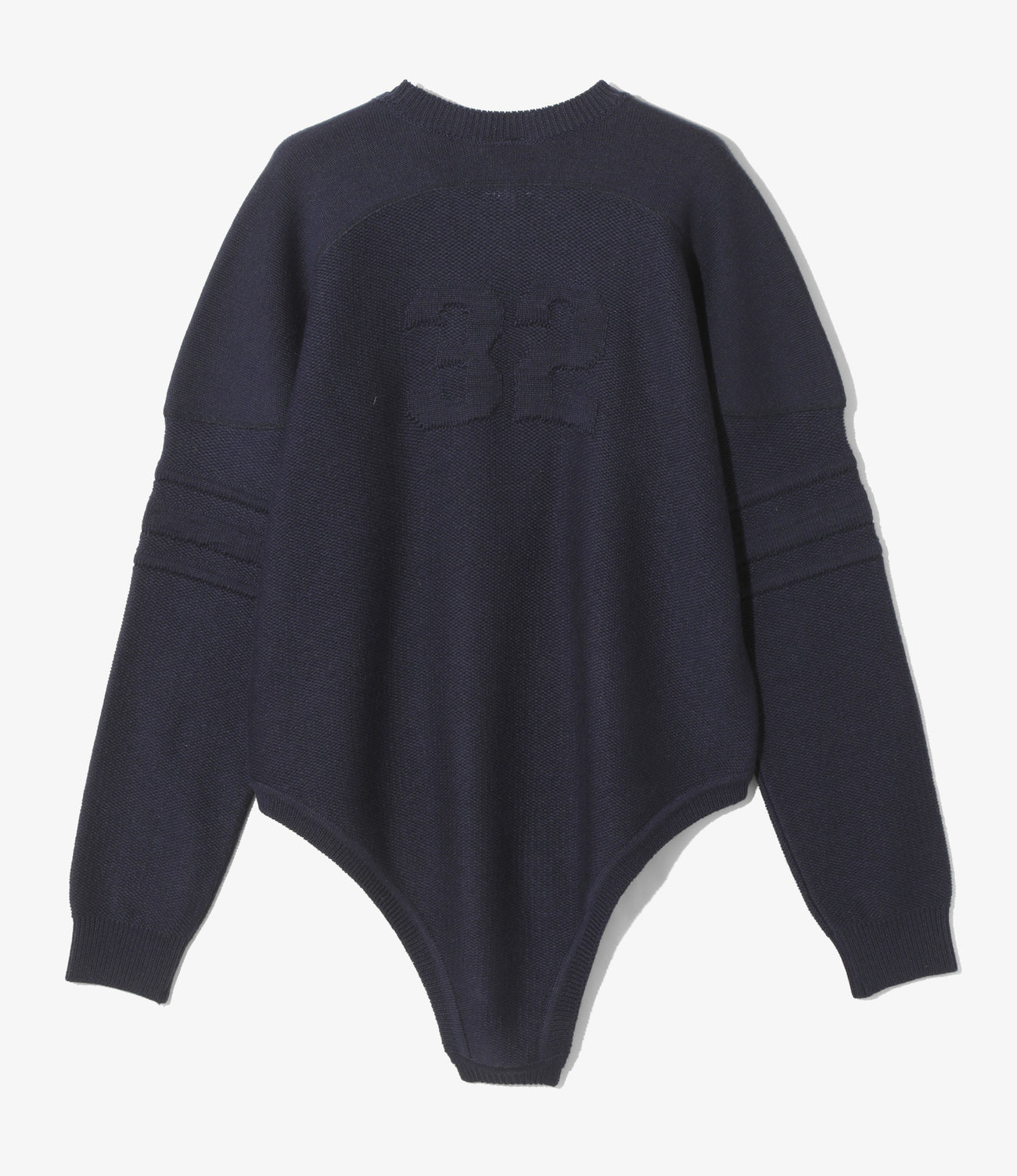 1920年から30年代にかけて主流だったヴィンテージのフットボールジャージーをインスピレーションにボディスーツタイプをニットで製作しました。ナンバリングとライン、ショルダー部分を浮き出し編みで編みの変化をつけています。素材はピリング(毛玉)の原因になる摩擦を軽減させる加工を施したアクリル糸と防縮ウールを混紡した、機能的でソフトな風合いを併せ持つ高級感のある素材です。着心地の良い柔らかさ、艶のある落ち着いた光沢感をお楽しみください。