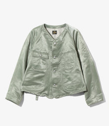 タフで機能的なワークウェアのディテールを備えた、ノーカラーのエンジニアジャケット。ワークウェアらしいトリプルステッチや、ラグランスリーブ、中央に傾けて配置されたアシンメトリーな胸ポケット、蝶の刻印のメタルボタンなど、個性的なディテールが詰まったデザイン。素材は光沢感が目を引く、コットンナイロンを採用しています。