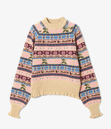 幾何学的な横段柄とカラフルな色使いが特徴の伝統的な歴史を持つフェアアイルニットをオリジナルパターンで編み上げました。オーソドックスなモチーフである雪柄に加え、<RHODOLORION>のアイコンであるスワローや、バラ、ブランドロゴモチーフなどを効かせた完全オリジナルパターンです。ラグラン仕様なのでアームホールの稼働もしやすく、袖口、裾口は畦フリルを施すことでレディーな顔に仕上がっています。