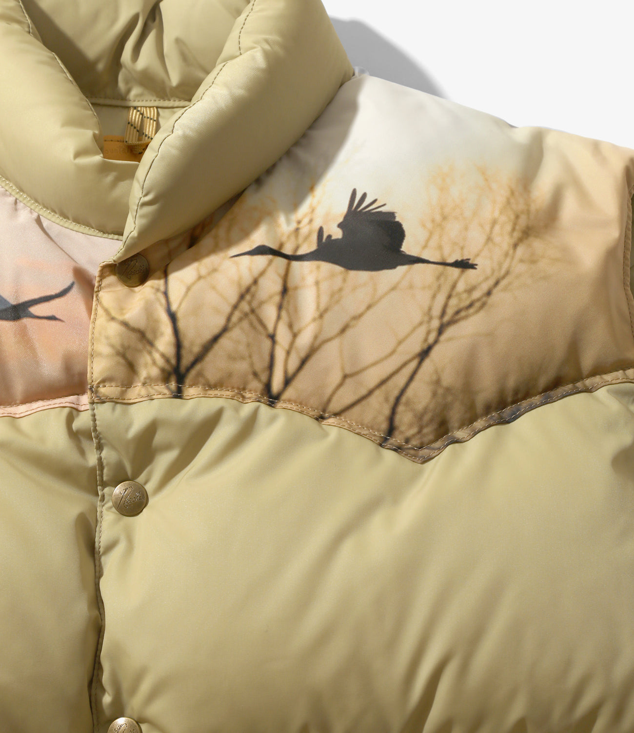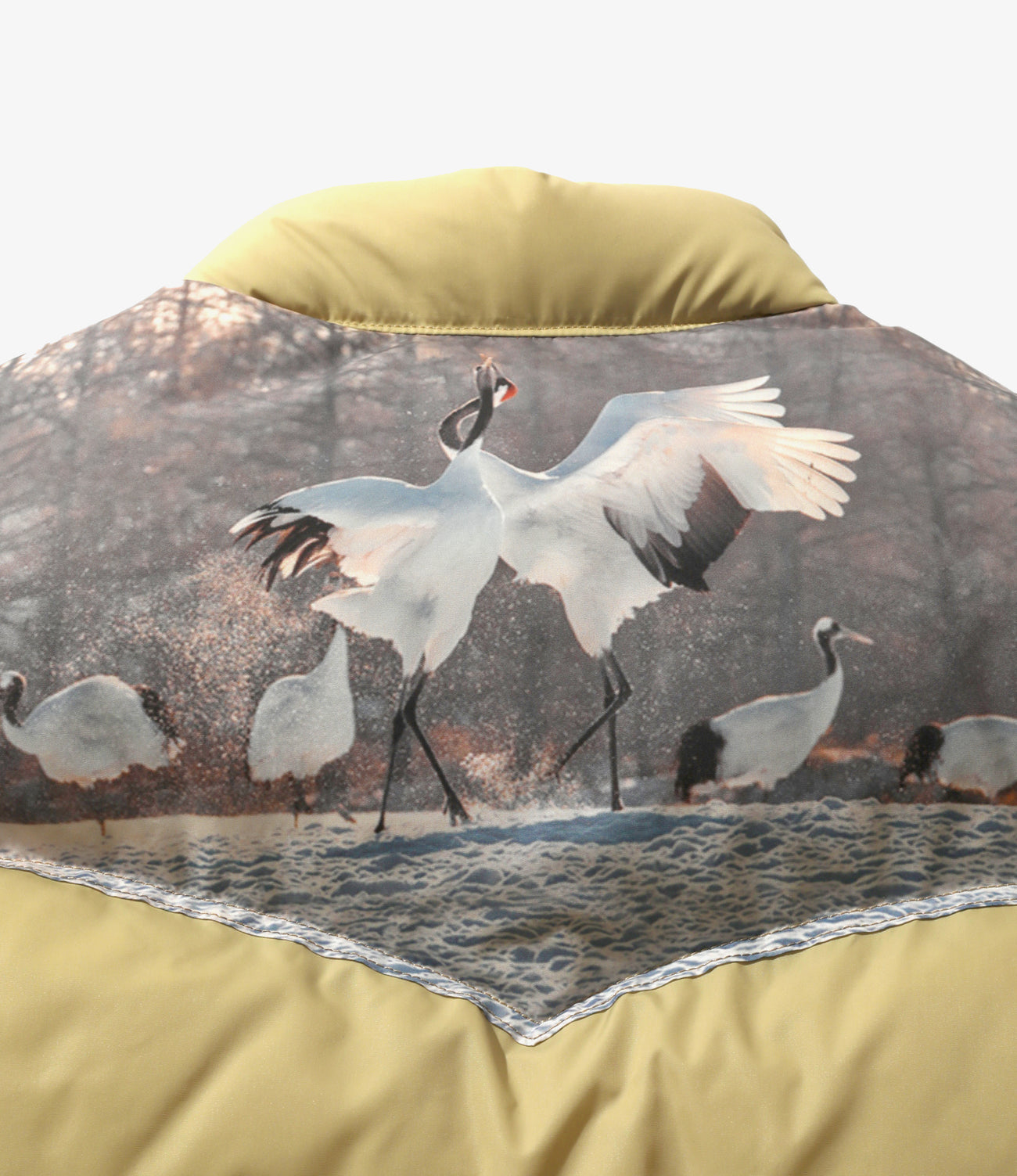 〈Rocky Mountain Featherbed〉を象徴するヨークダウンをベースに、通常は一枚革で仕立てられるレザーヨークを排し、夕景や雪原を舞う丹頂鶴のフォトプリントを大胆にあしらいました。表地・裏地には、軽量かつ耐久性に優れた70デニールのナイロンタフタを使用。中綿には700フィルパワーのヨーロッパ産撥水ダウンを採用し、高い保温性と軽快な着心地を実現しています。