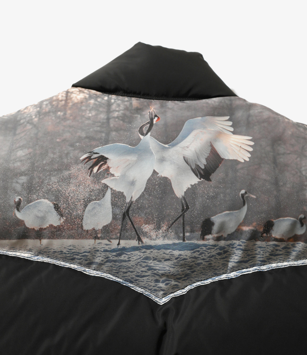 〈Rocky Mountain Featherbed〉を象徴するヨークダウンをベースに、通常は一枚革で仕立てられるレザーヨークを排し、夕景や雪原を舞う丹頂鶴のフォトプリントを大胆にあしらいました。表地・裏地には、軽量かつ耐久性に優れた70デニールのナイロンタフタを使用。中綿には700フィルパワーのヨーロッパ産撥水ダウンを採用し、高い保温性と軽快な着心地を実現しています。