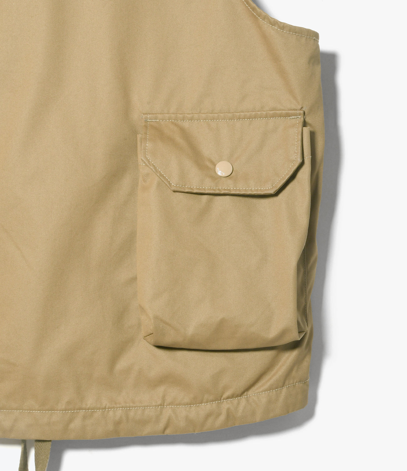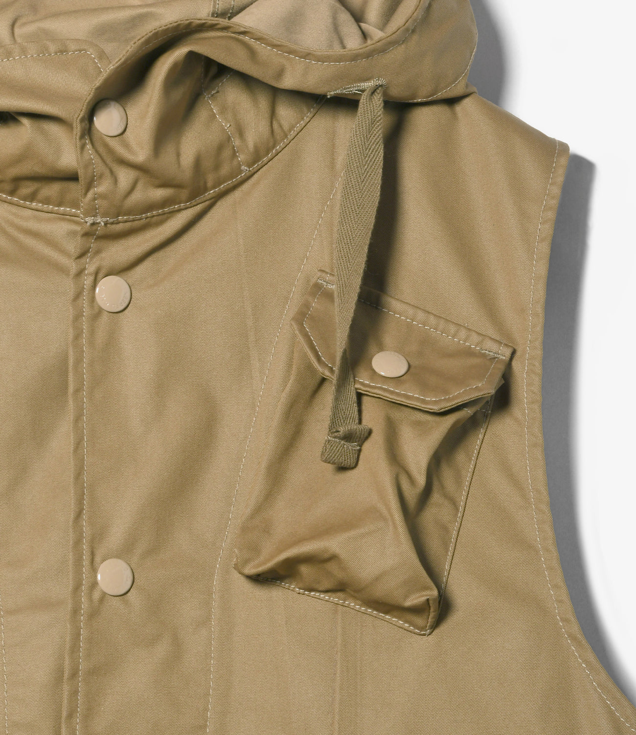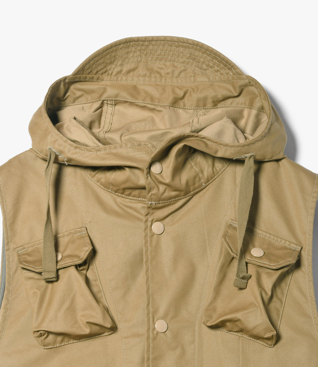 フロントに配されたマチ付きの大容量ポケット、スナップボタンやドローコードなど、アクティブなディテールを多数装備したフィールドベスト。大小サイズや形状の異なる多彩なポケットを備えており、非常に機能性に富んだアイテムです。シーズンファブリックを使用し、ご用意しました。