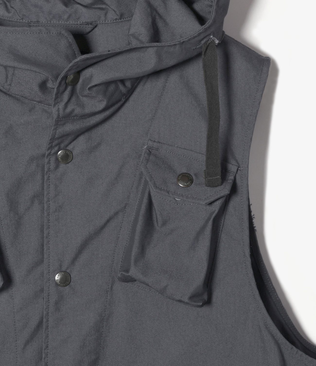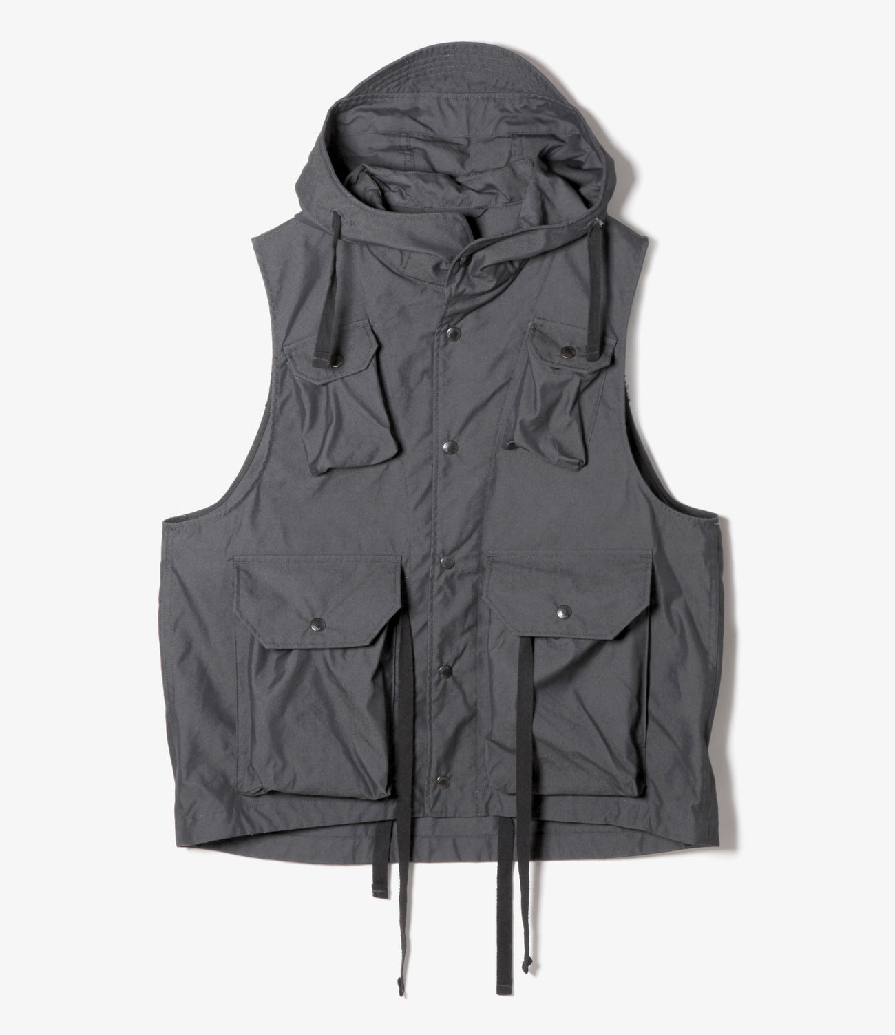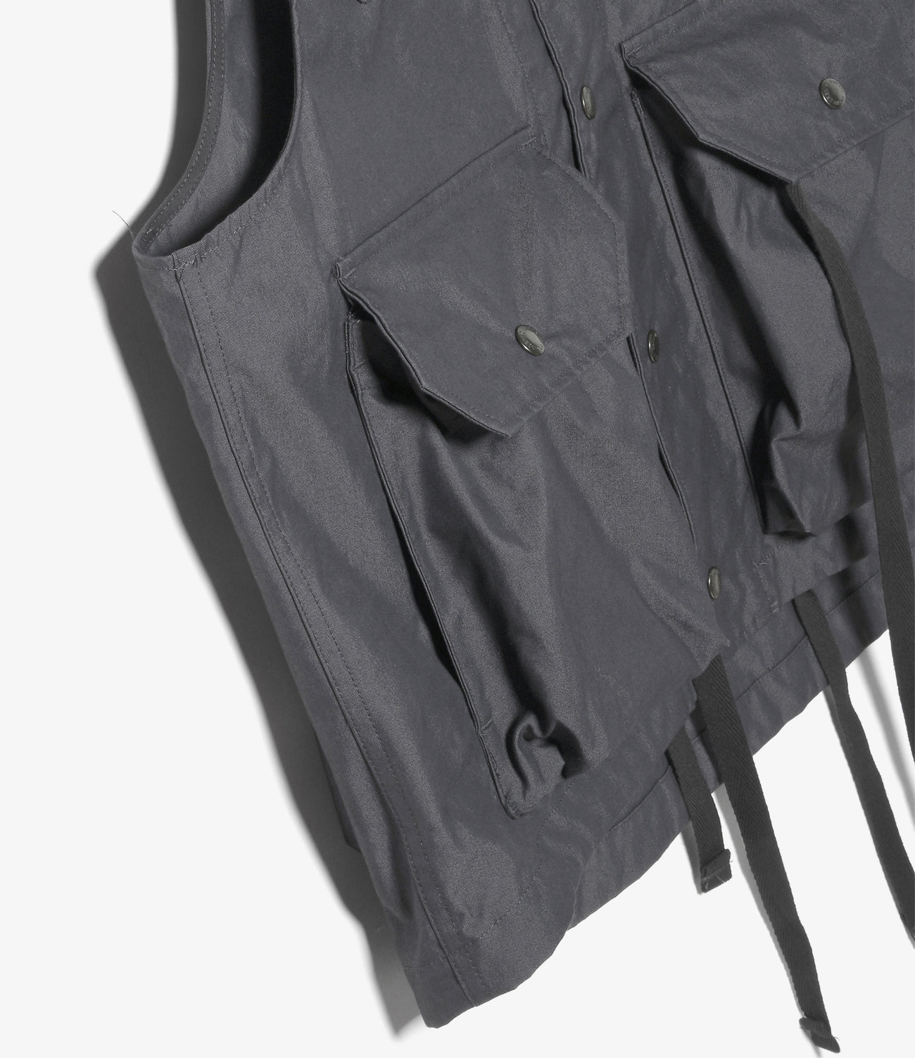 フロントに配されたマチ付きの大容量ポケット、スナップボタンやドローコードなど、アクティブなディテールを多数装備したフィールドベスト。大小サイズや形状の異なる多彩なポケットを備えており、非常に機能性に富んだアイテムです。軽量でありながら強度のあるCPウェザー素材は、アウトドアやミリタリーの雰囲気をさらに感じさせます。