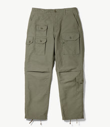 多彩なバリエーションのポケットを備えたミリタリーパンツ。アシンメトリックなポケット配置が、見る角度によって異なるデザインに見えるユニークな一本です。収納力などの機能面も魅力で、ミリタリーパンツらしい実用性の高さが光ります。定番の、厚手の素材が生む立体感が魅力のコットンダブルクロスを使用。