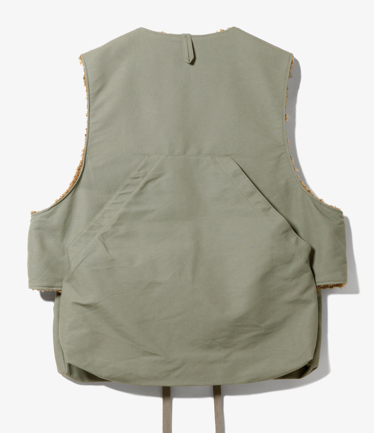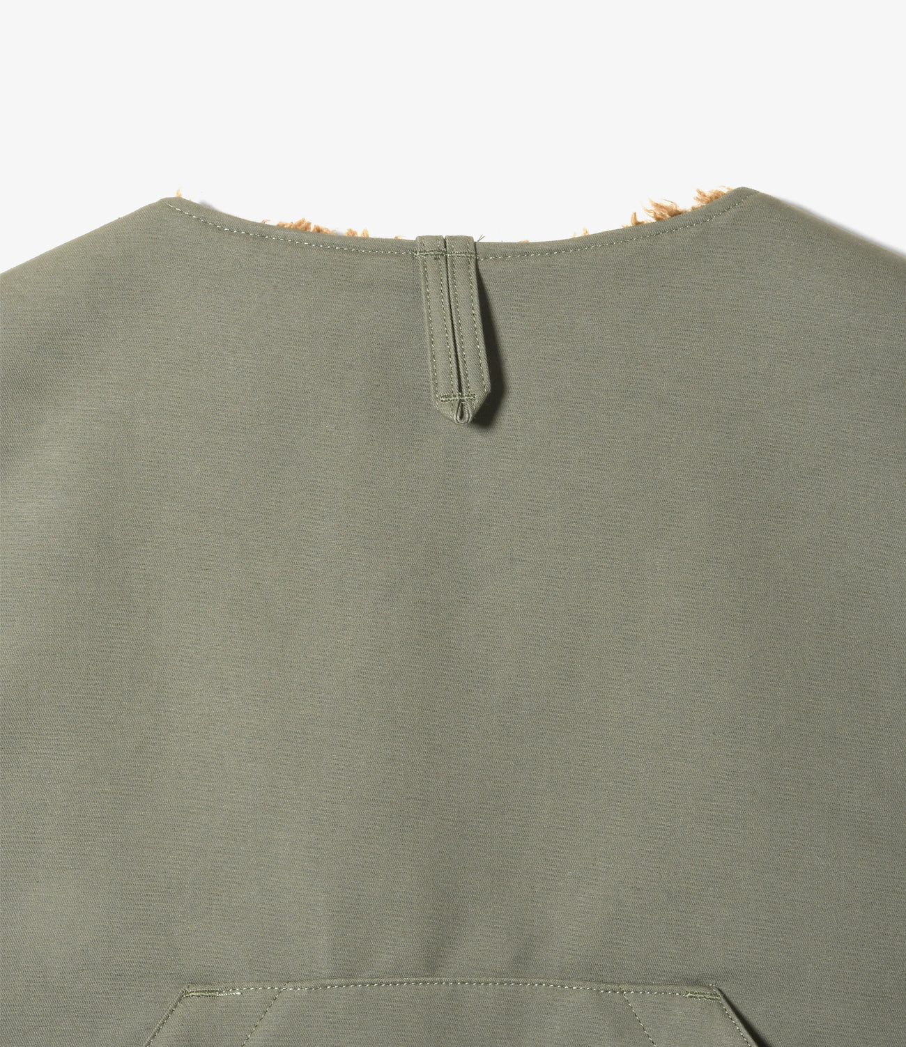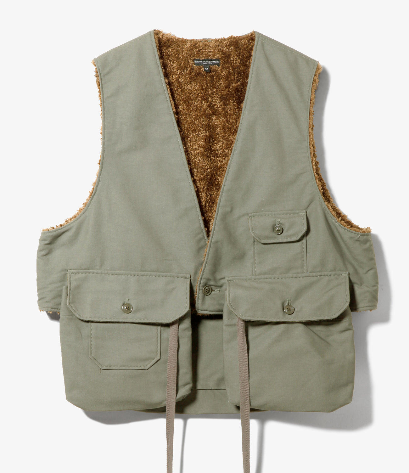 前方へぶら下がるように取り付けられた大容量のフロントポケットや背面のゲームポケットなど、ハンティングベストをルーツに持った、実用性の高いディテールが特徴のアイテム。フロントはスナップボタンの他、ポケット部分に縫い付けられたドローコードでも留める事が可能になっており、インナーとしてだけでなくジャケットなどの上からでも着用しやすいデザインです。厚手で強いコットンダブルクロスは、程よい立体感あるシルエットを生みます。