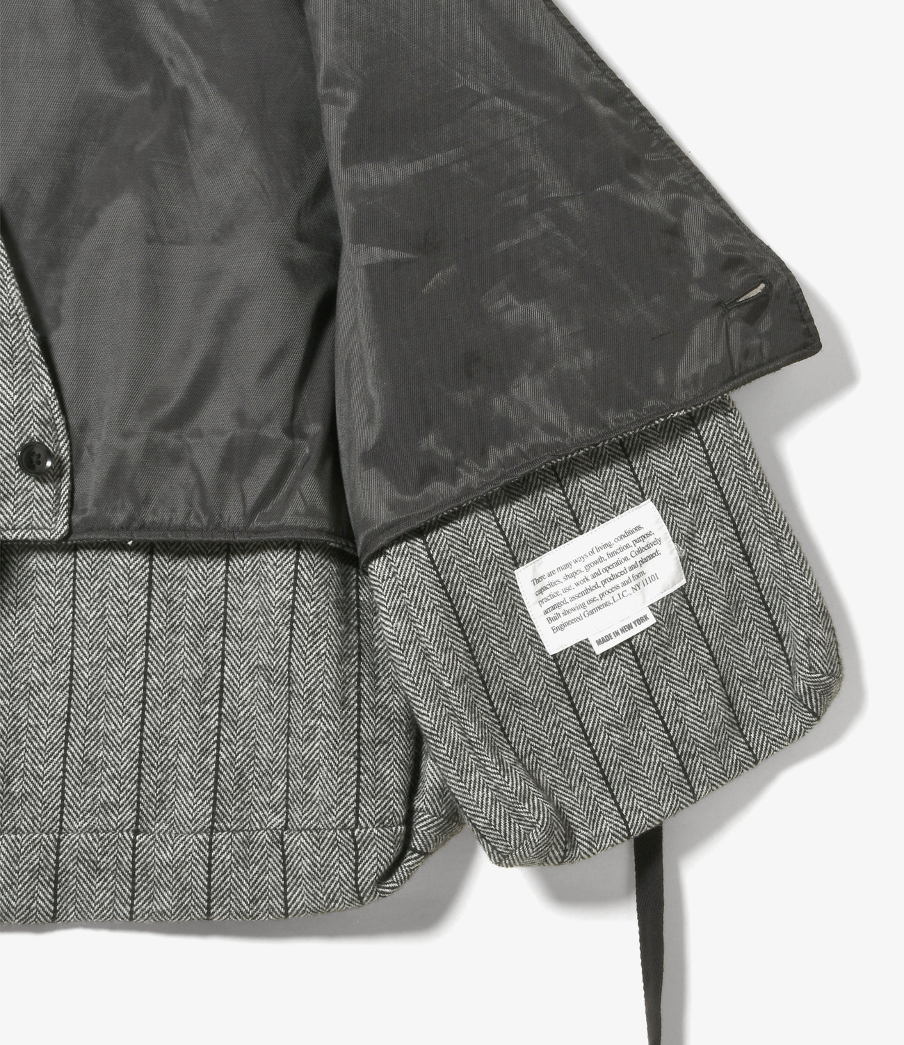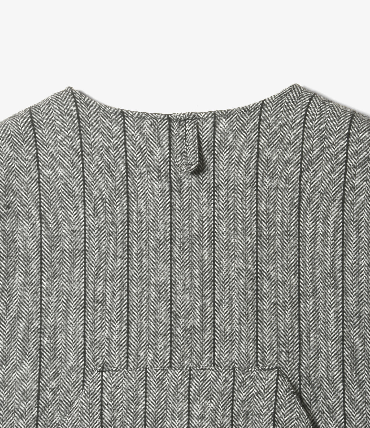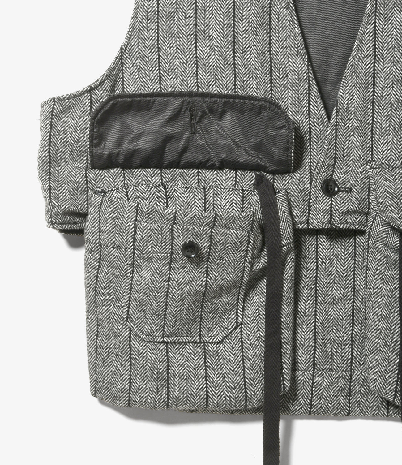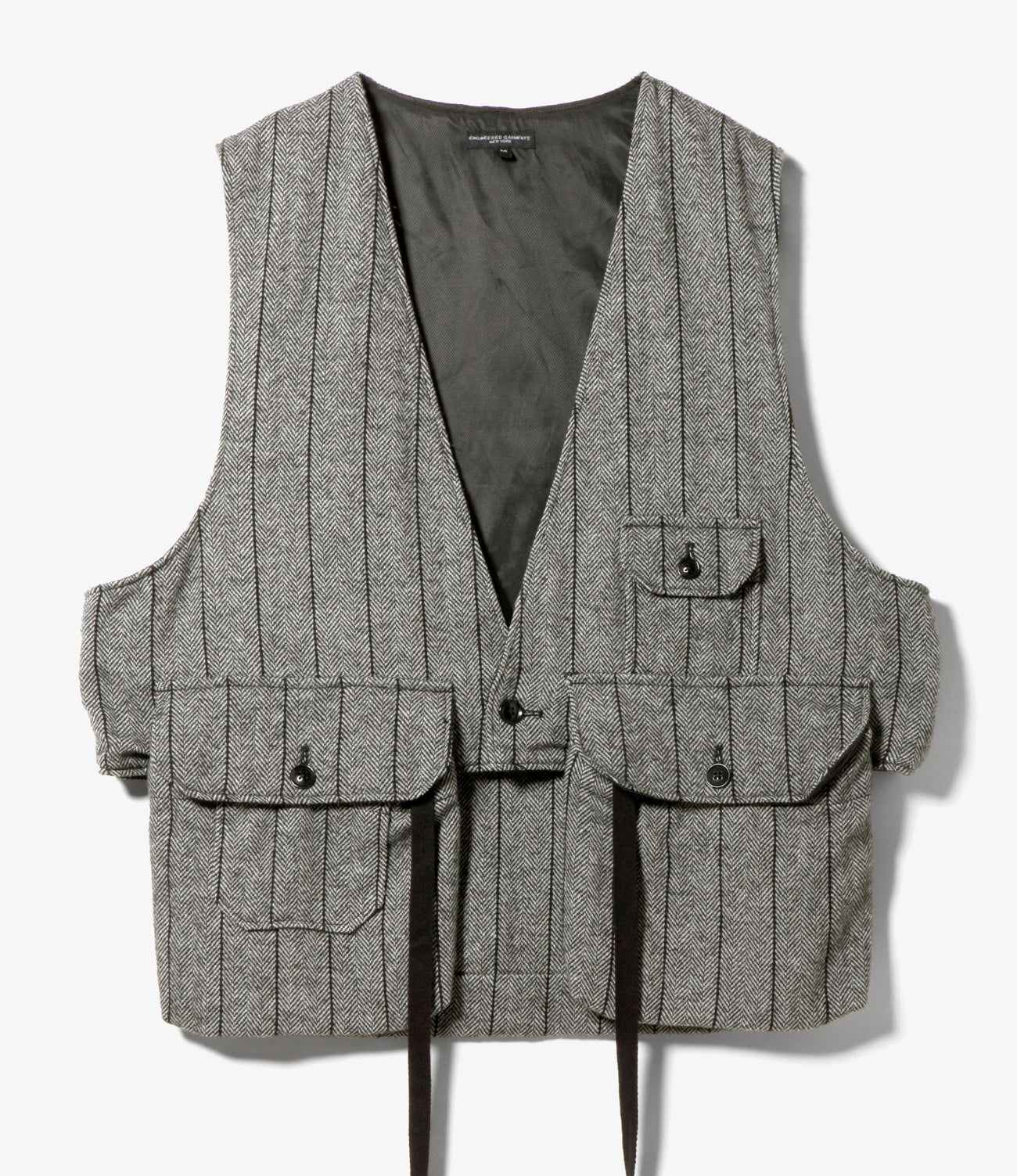 前方へぶら下がるように取り付けられた大容量のフロントポケットや背面のゲームポケットなど、ハンティングベストをルーツに持った、実用性の高いディテールが特徴のアイテム。フロントはスナップボタンの他、ポケット部分に縫い付けられたドローコードでも留める事が可能になっており、インナーとしてだけでなくジャケットなどの上からでも着用しやすいデザインです。シックなカラーのストライプ柄で登場です。