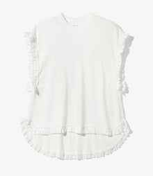 シンプルだからこそ、シルエットや素材にこだわった万能スリーブレスTee。超長綿の特徴であるやわらかな肌触りと、コットンでありながらシルクのような滑らかさと光沢を併せ持った最高級綿のイスラエルピマを採用しました。洗濯を重ねても毛羽立ちにくく風合いが変わらないのが特徴です。 シンプルなシルエットに仕上げていますが、裾のフリルがポイントとなりはレイヤードにはもちろんのこと、上品で高級感があるため一枚で主役としても活躍する万能なアイテムです。