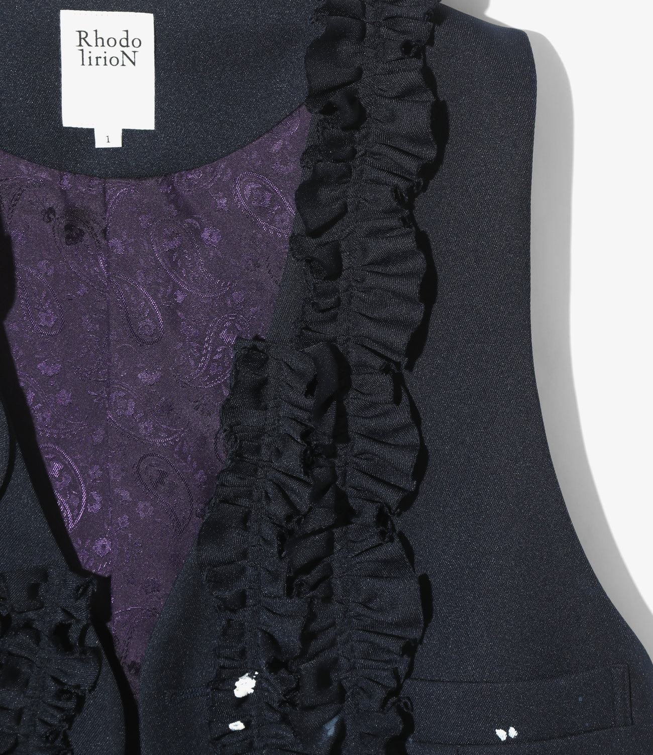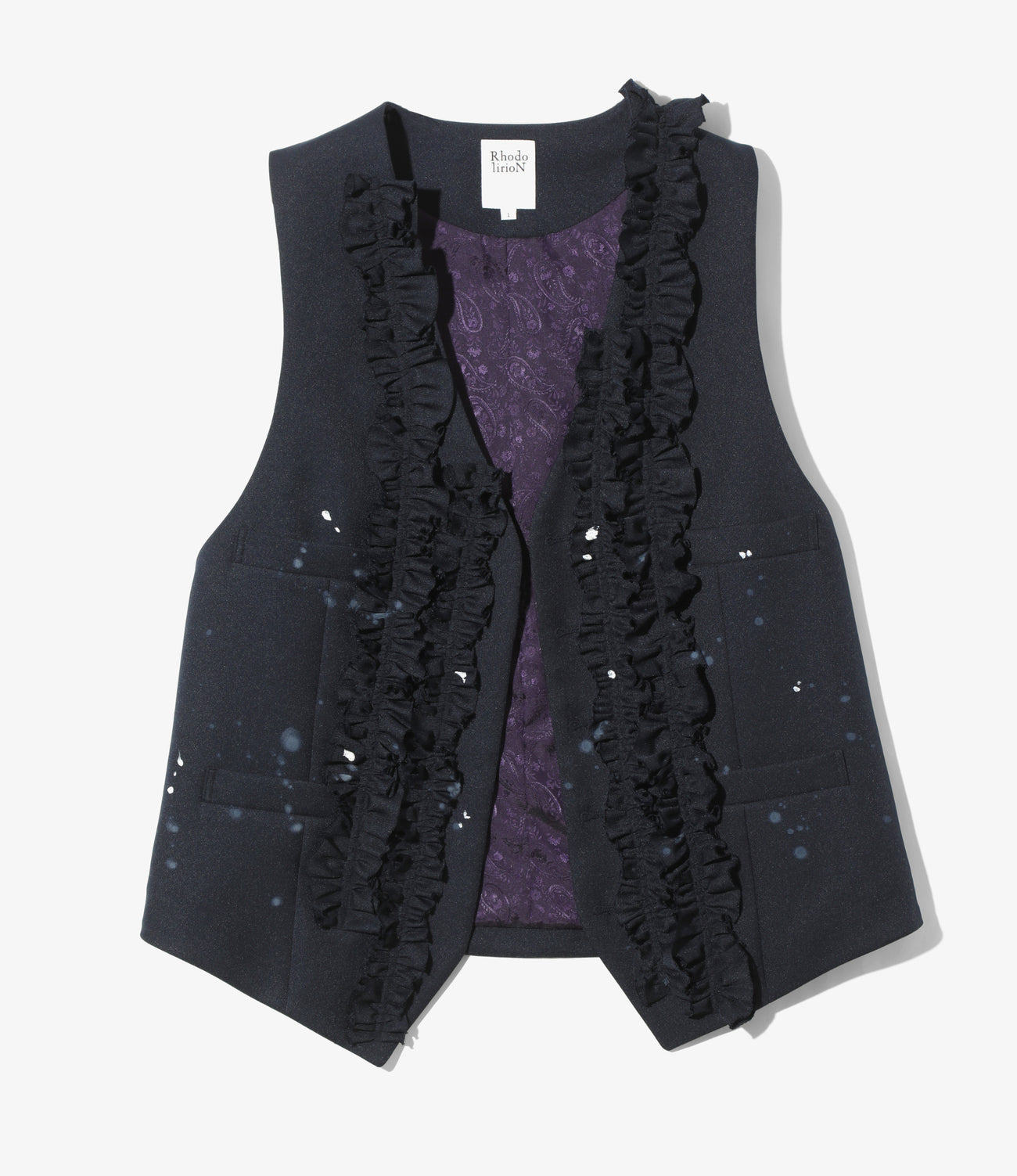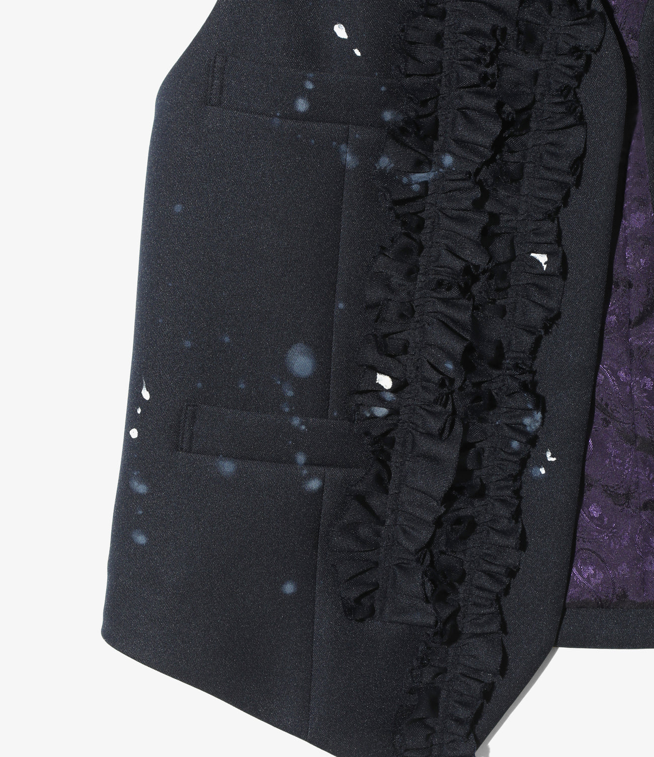 ワークウエアに見られるペイントの汚れをハンドプリントで再現したクラシカルなフリルべストです。ランダムに配されたフリルが贅沢なモデルです。ボタンホールは搭載していますがボタンは敢て付けずにお好きなボタンを付けて頂けるようなデザインとしました。素材は制電性素材を折り込み、不快な静電気をシャットアウトしてくれるポリエステルツイルとなります。シワになりくく、ナチュラルなストレッチ性を持ち、イージーケアであることも特徴です。同素材でジャケット、パンツをご用意。セットアップでの着用も可能です。