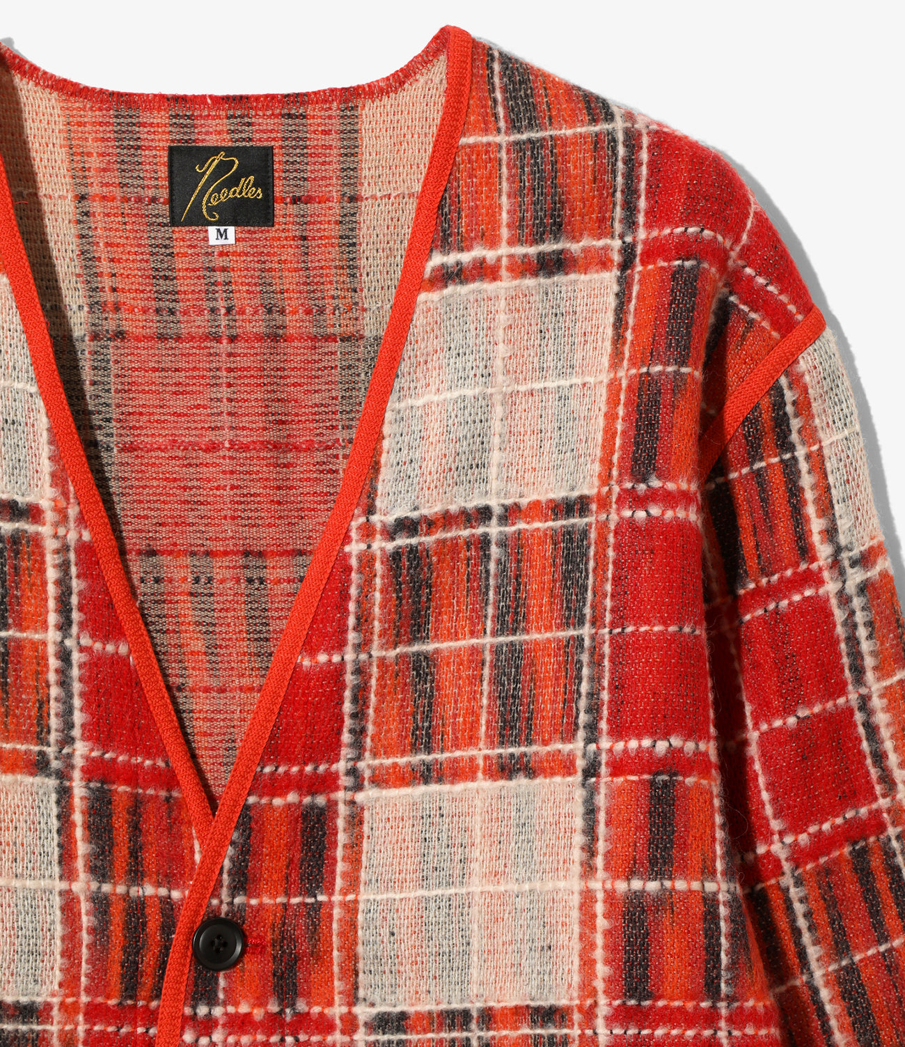大胆なチェック柄が目を引くカーディガンが〈NEEDLES〉からリリースです。深めのVネックに同色のパイピングが施され、裾はフリンジ仕様と特徴的なデザイン。レッドとパープルの2色ご用意しています。