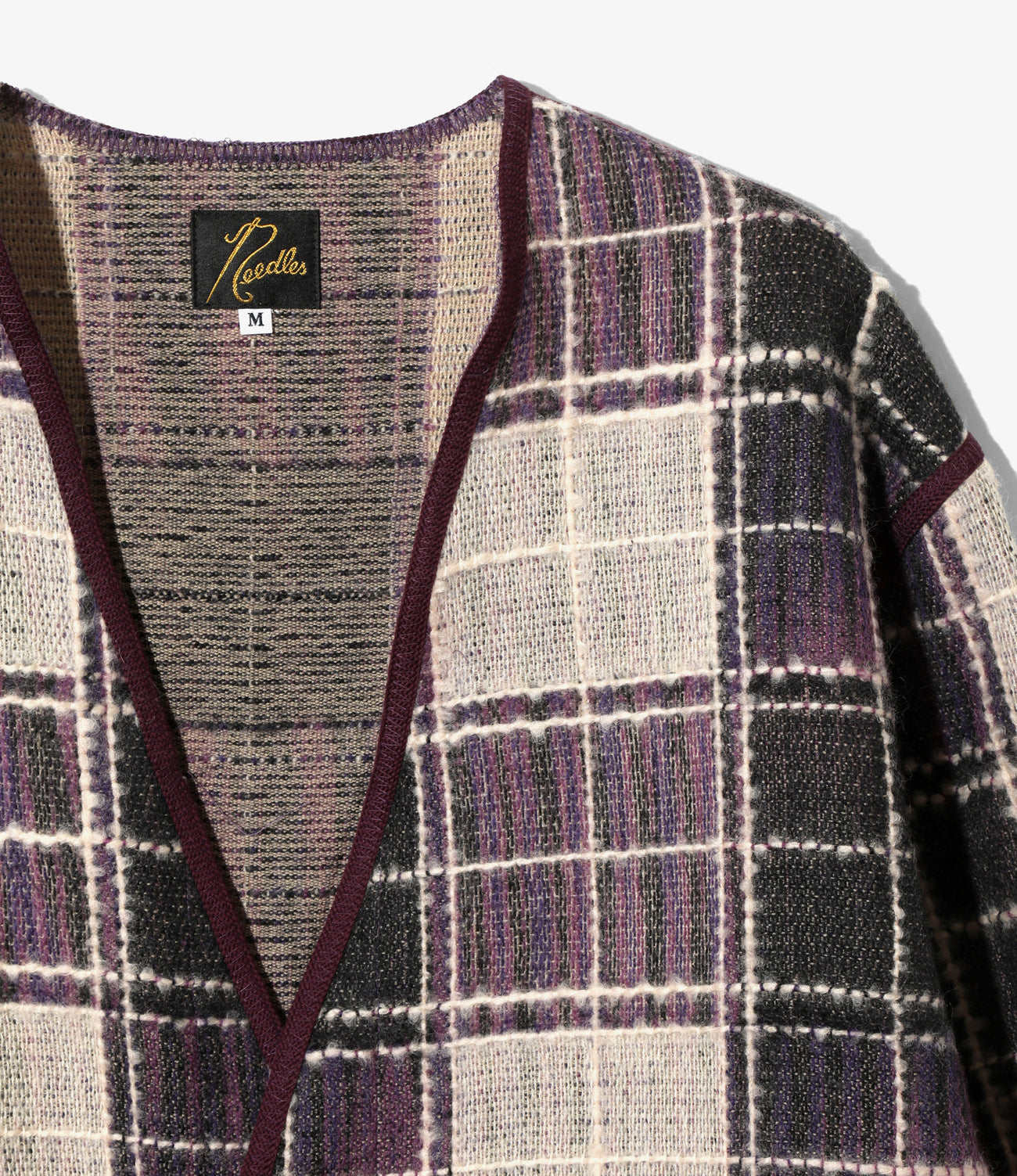 大胆なチェック柄が目を引くカーディガンが〈NEEDLES〉からリリースです。深めのVネックに同色のパイピングが施され、裾はフリンジ仕様と特徴的なデザイン。レッドとパープルの2色ご用意しています。