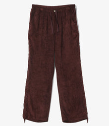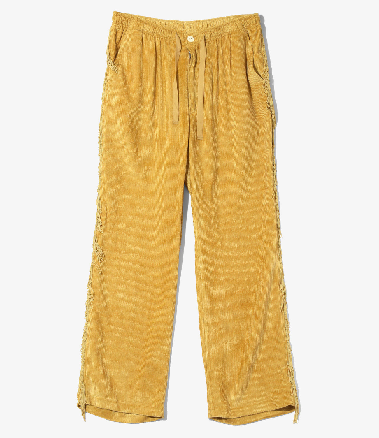 サイドのフリンジ飾りが個性的な一本。ウエストはストリング仕様のイージーな履き心地となっています。柔らかくツヤのあるレーヨンコーデュロイ素材を使用し、シルエットの美しさが際立つ一本に仕上がりました。