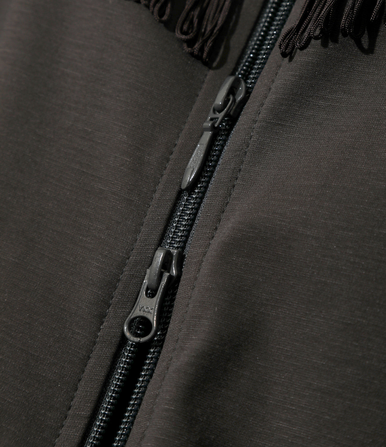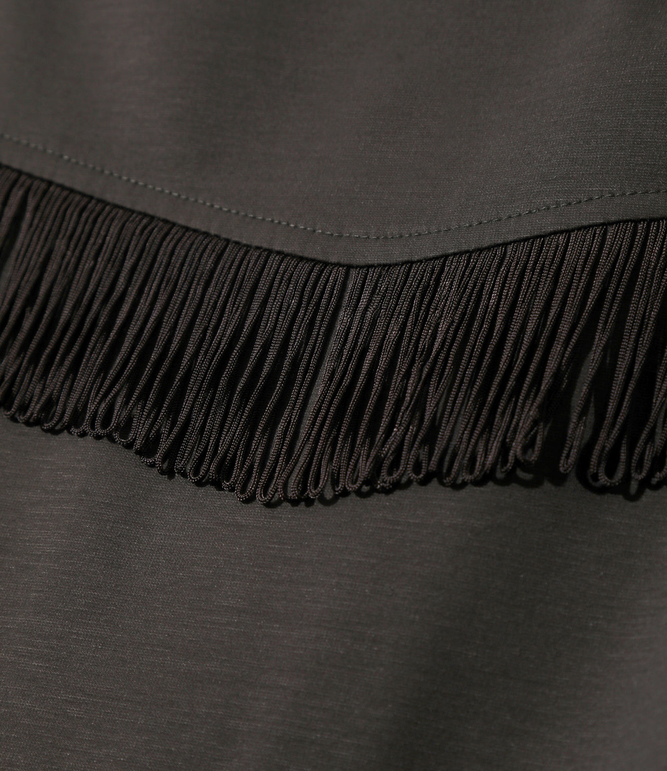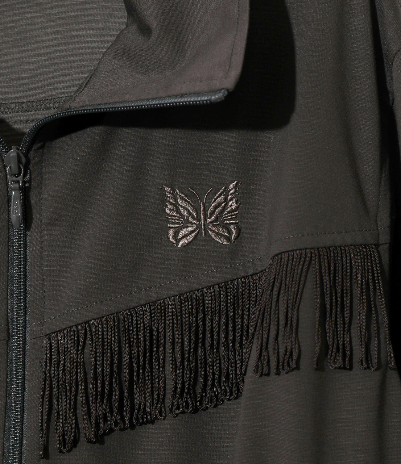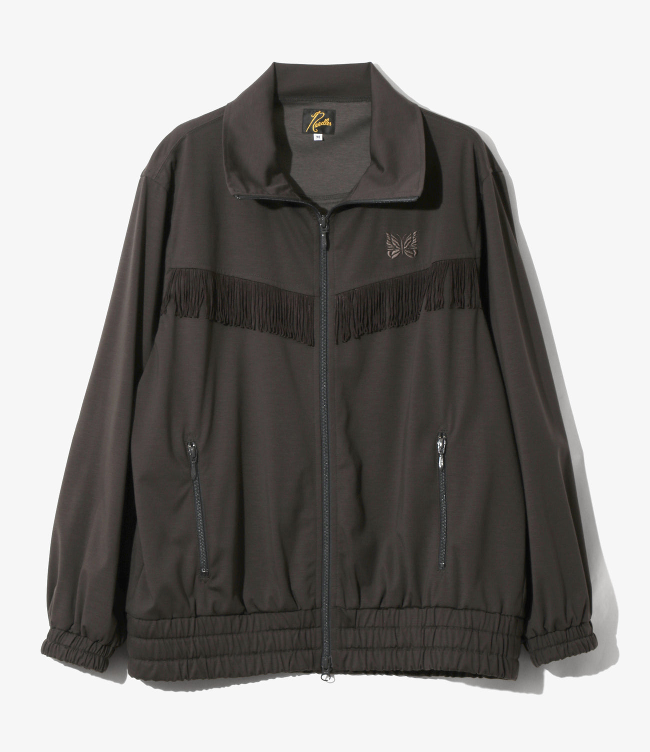 スポーティなトラックジャケットのフロント/バックヨークに、フリンジ飾りをあしらったユニークなアイテム。ウエスタンウェアのテイストをミックスすることで、一般的なトラックジャケットとは全く異なる魅力を引き出した一着です。しなやかな質感のジャージー素材を使用、バーガンディとチャコールの2色でリリースしました。
