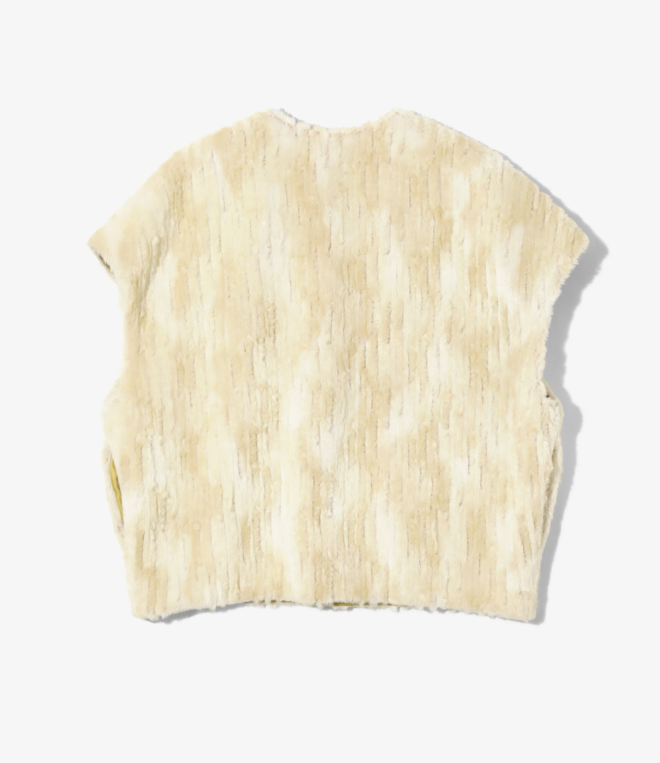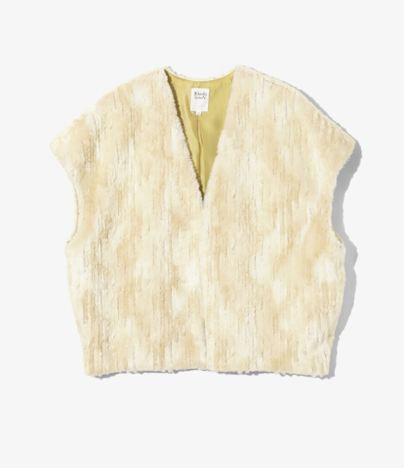50年代のヴィンテージファーストールをベースにデザインされた、エコファー素材のボレロ。滑らかでしっとりとしたアクリルファーは、縦に流れる毛足がストライプのような模様を生み出し、上品な印象です。ミニマルな仕立てに加え、フレンチスリーブとボクシーなシルエットでレイヤリングにも最適。同素材で、シングルコート、2WAYフーディスカーフ、マルチエプロン、2サイズのバッグを含む全5型を展開しています。
