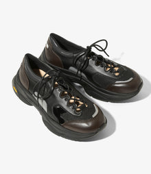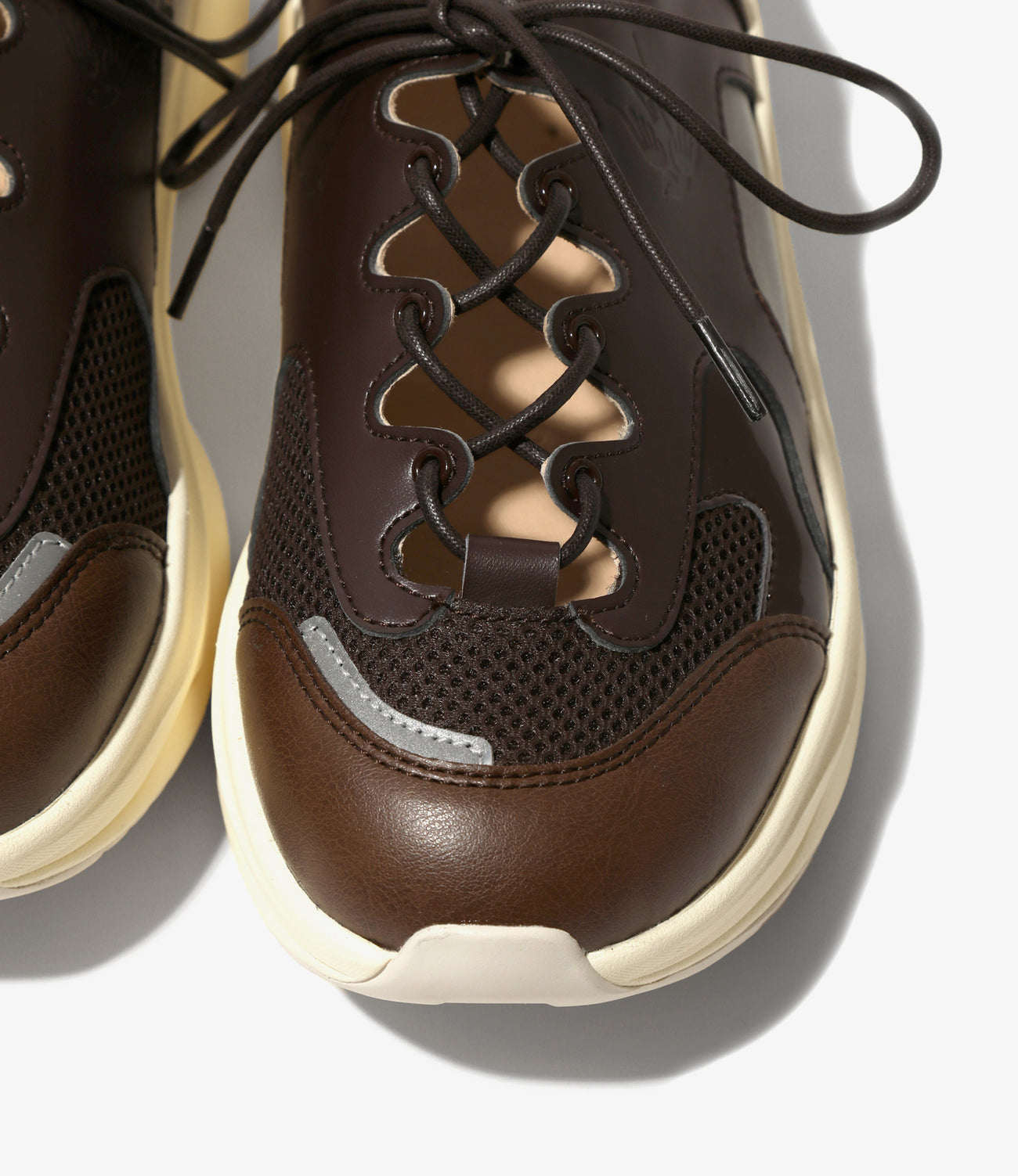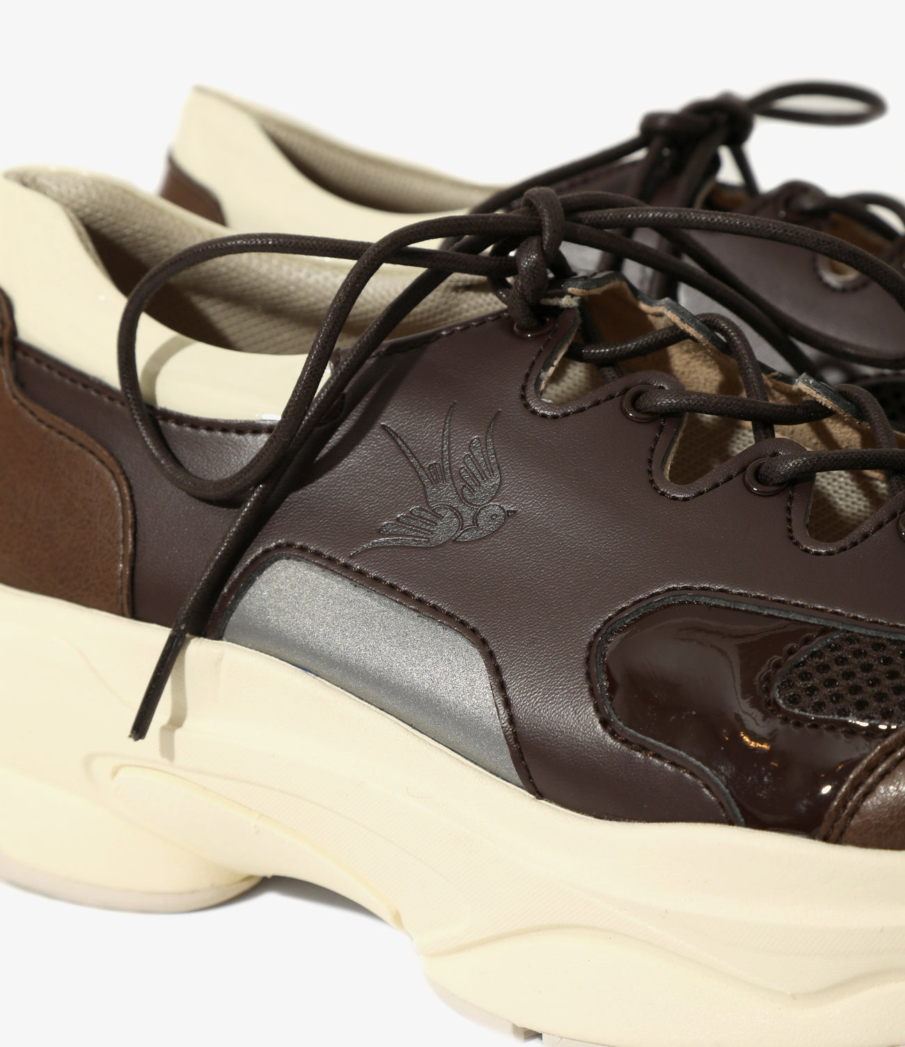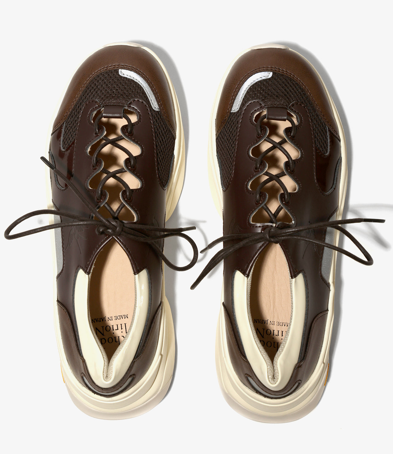 <RHODOLIRION>完全オリジナルのスニーカーです。ソールにはイタリアに本社があるヴィブラム (Vibram) 社が製造しているソールを採用しました。1930年代に登山ブーツ用ソール開発から始まり、80年以上の歴史を誇り、多くの有名靴メーカーから信頼を獲得しています。アッパーにはテクスチャーの異なる4種類の素材を使いコンビネーション、サイドにはアイコンであるスワローを型押ししています。クラシックなレザーのギリーシューズをイメージし、モダンに昇華した逸品。履き心地の良さはもちろん存在感のある1足です。