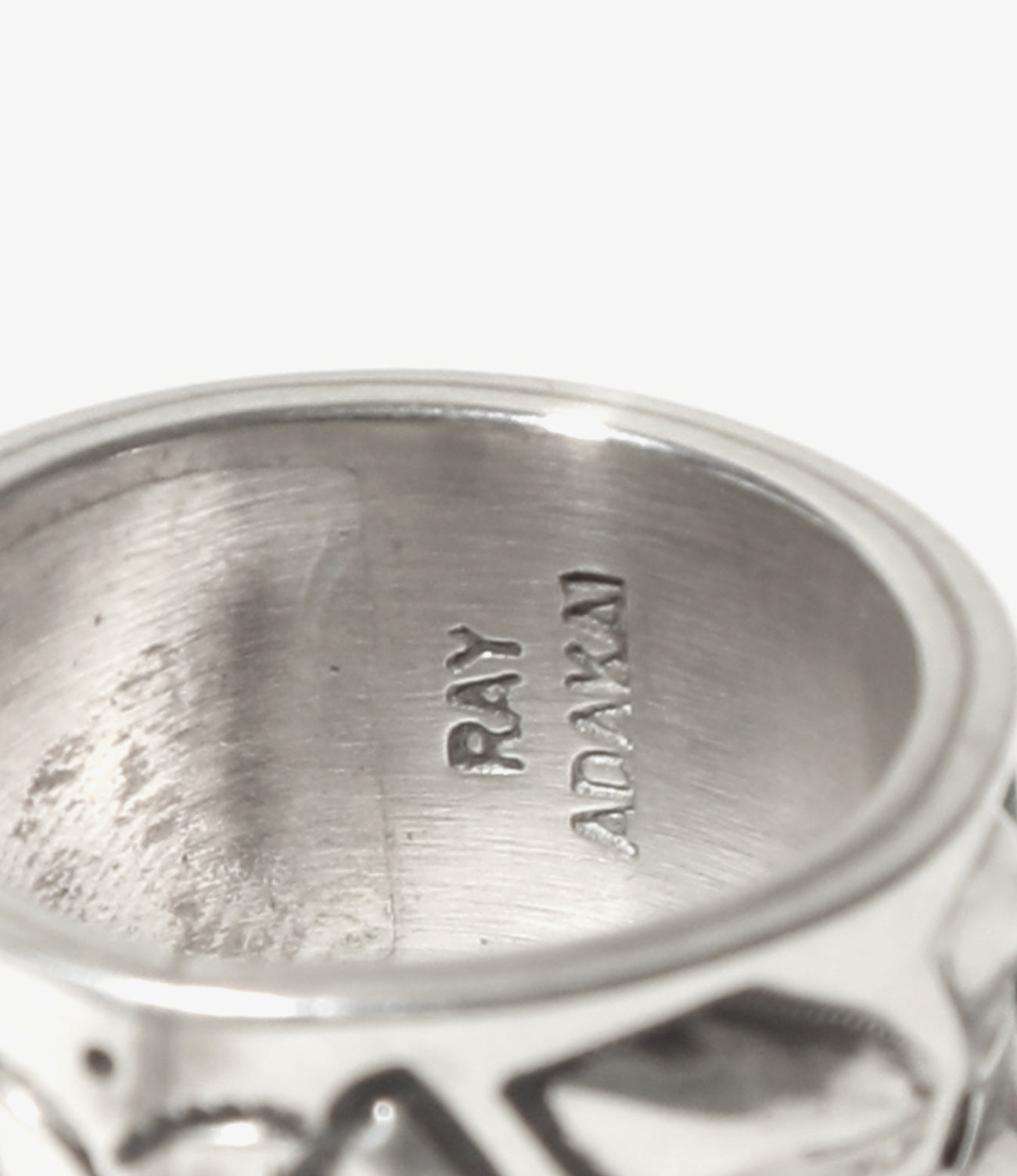 ナヴァホのアーティストRAY ADAKAIに制作を依頼したリングです。ランダムに埋め込んだ様々な天然石のカラフルなインレイと力強いスタンプワークを組み合わせたユニークなデザイン。厚みのあるシルバーを使用した、RAY ADAKAIらしい存在感のある逸品です。