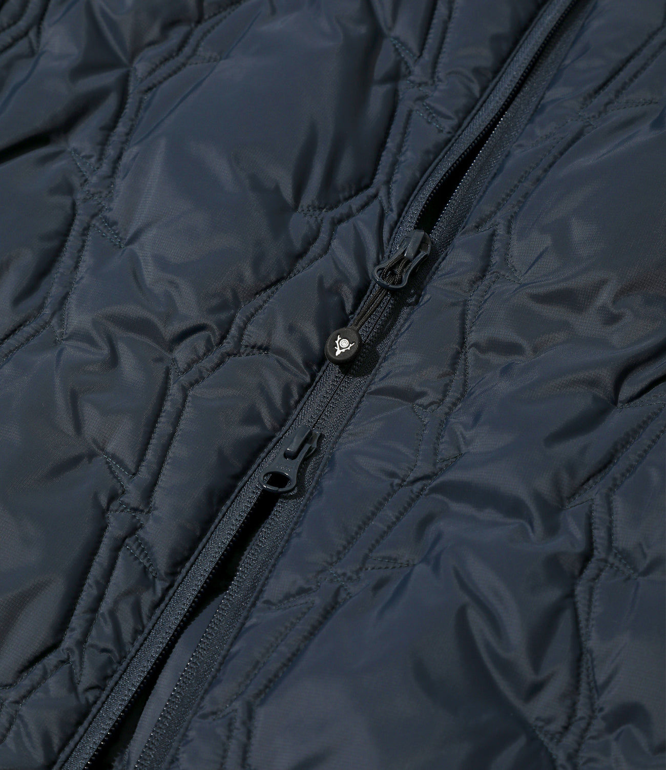 本コレクションは〈TAION〉の定番ベーシックラインをベースに、ダウンジャケットを含む全3型で展開。高機能なスペックはそのままに、〈SOUTH2 WEST8〉ならではのアレンジを随所に加えたスペシャルなラインナップです。なかでも注目は、〈SOUTH2 WEST8〉オリジナルのホーン柄をダウンステッチで表現した、特別仕様のキルティング。生地は丈夫さを兼ね備えた高密度マイクロリップストップ生地を使用。さらに、フロントZIPの引き手パーツや収納袋にはオリジナルロゴをあしらい、ディテールにまでこだわりが詰まっています。