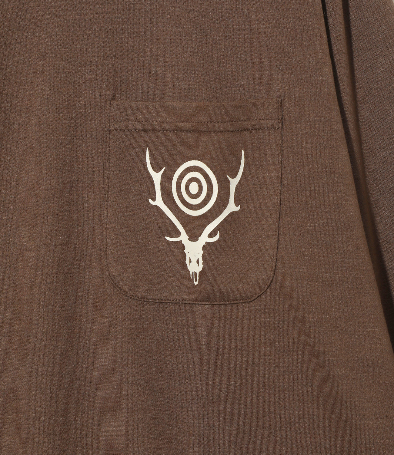 定番のアイテムとして展開されるポケットTシャツが25年秋冬シーズンの新色で登場です。曲線的な形の胸ポケット部分のディアスカルと、バックのサークルホーンの大胆なプリントが特徴のアイテム。今季もベーシックから個性的なカラーまで全5色のバリエーションで展開されています。ボディには通気性や速乾性に富んだ、ポリエステル/コットンの素材を使用しています。