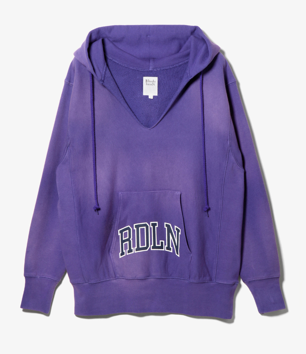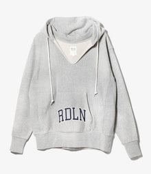 ヘビーオンス裏毛を採用し、経年変化で色が退色したようなエイジング加工を施したスウェットフーディです。70年代のカレッジスポーツユニフォームを学生たちがカスタムするような雰囲気で、襟ぐりはカットオフしたデザインを施しました。”RDLN"カレッジロゴをプリントすることでムードがアップしました。カレッジロゴシリーズのバルーンパンツやキャップなどでセットアップスタイルもお勧めです。